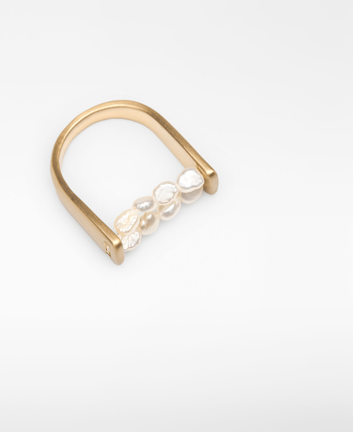Anillo metálico con perlas naturales mujer. Acabado dorado. Logo grabado en interior.