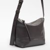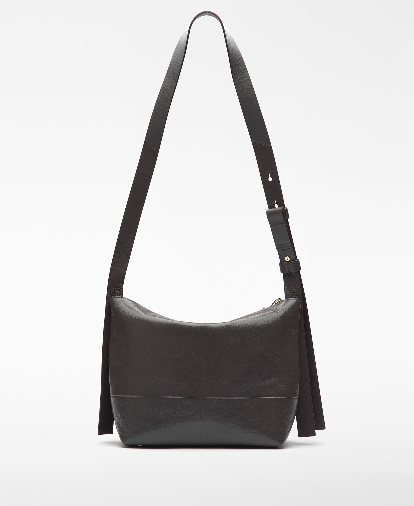 Bandolera Orión piel mujer. Textura craquelada con brillo. Corte horizontal en cuerpo. Un compartimento. Cierre cremallera. Bolsillo interior con cierre cremallera. Asa larga regulable. Logo grabado.