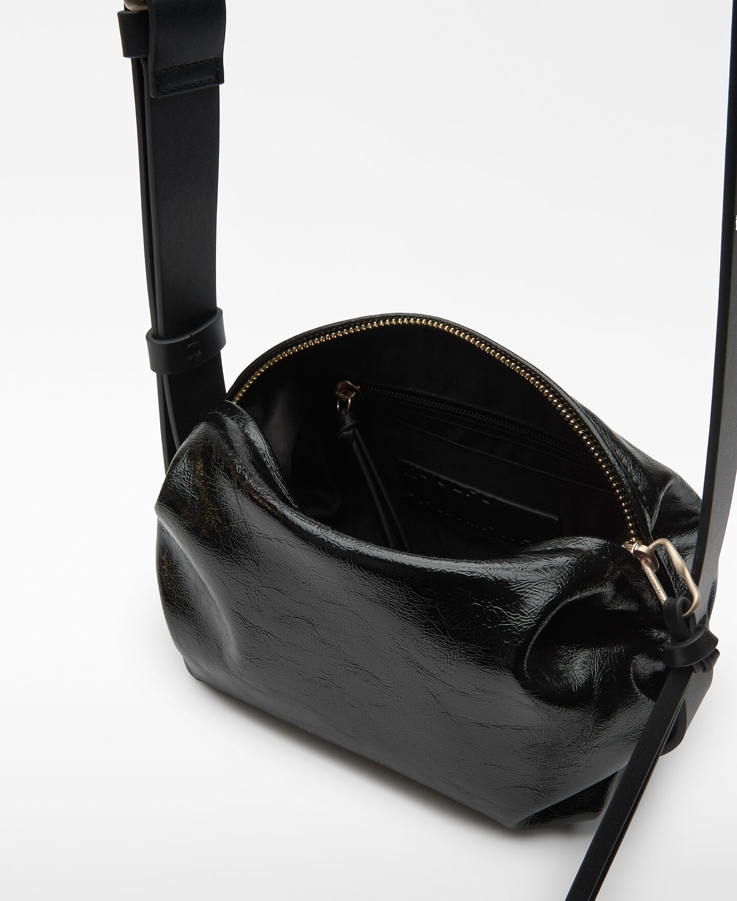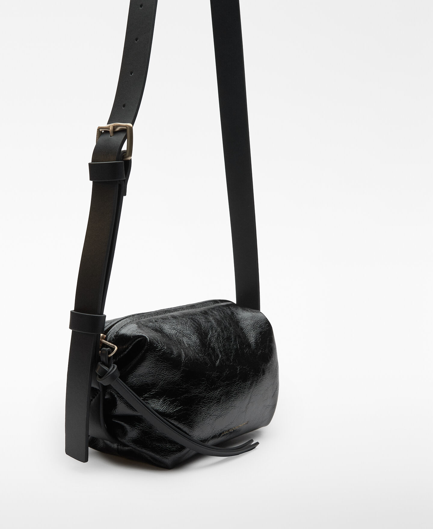 Bandolera pequeña Doce Piel No Piel mujer. Textura craquelada. Acabado brillo. Un compartimento. Cierre cremallera. Bolsillo interior con cierre cremallera. Asa larga regulable. Logo grabado.