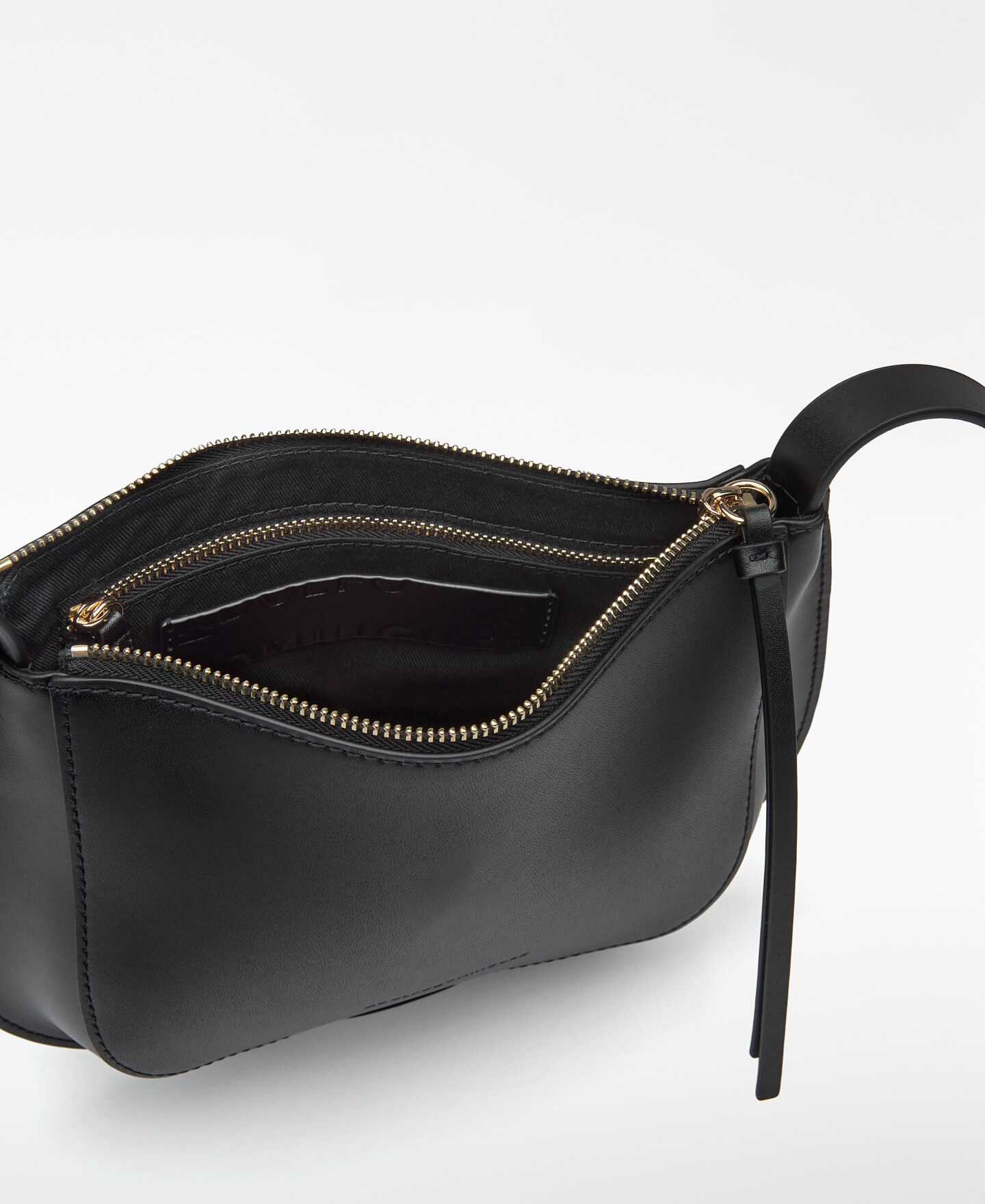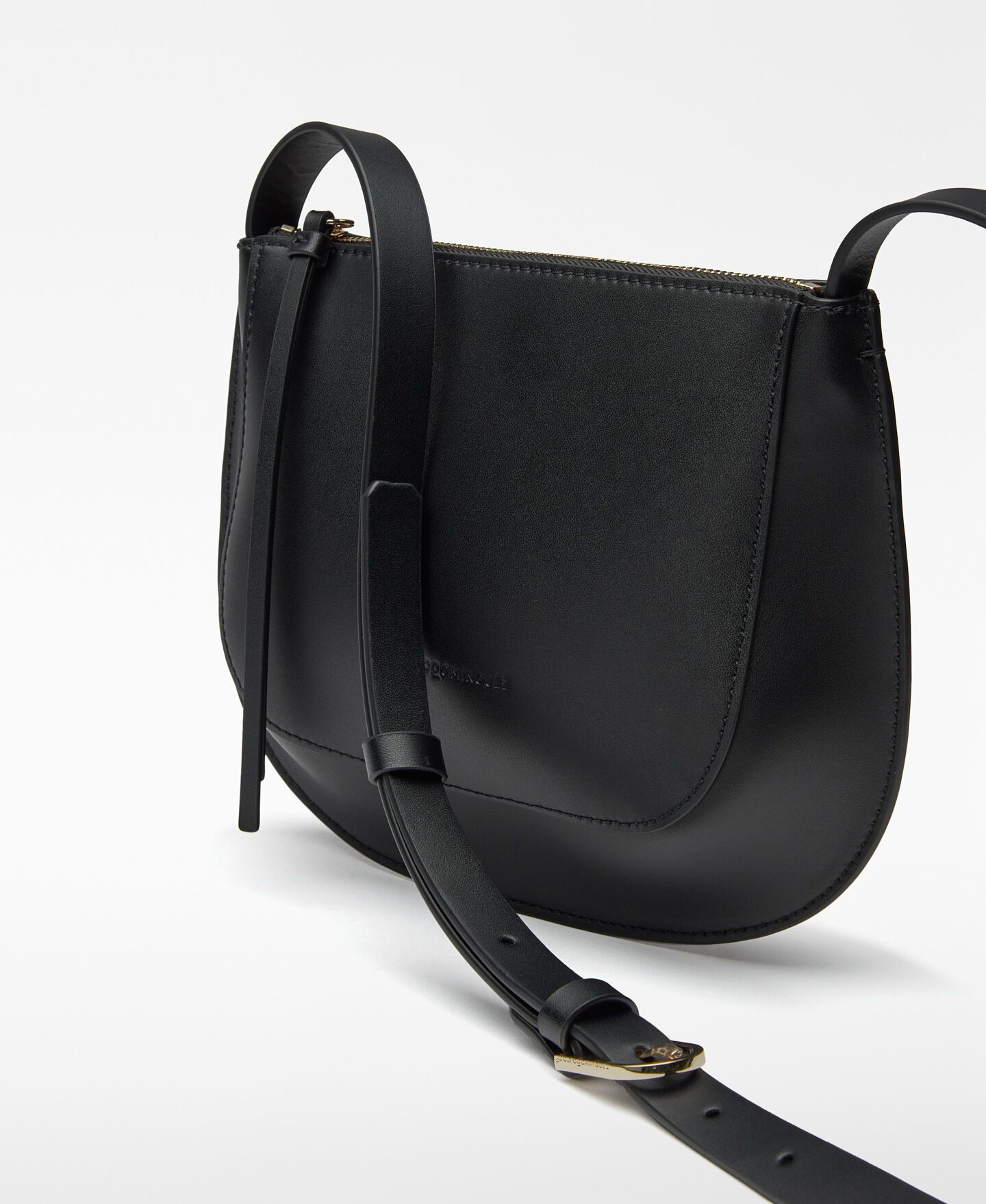 Bandolera pequeña Dorna piel mujer. Un compartimento. Cierre cremallera. Bolsillo interior con cierre cremallera. Asa larga regulable. Logo grabado.
