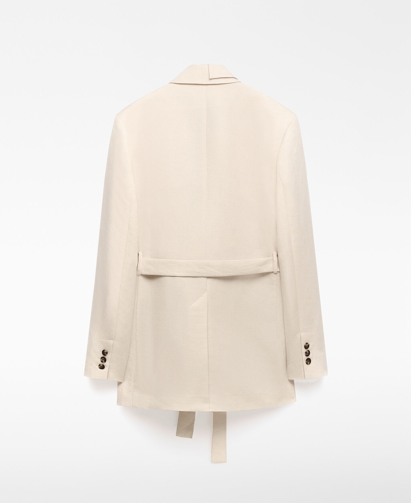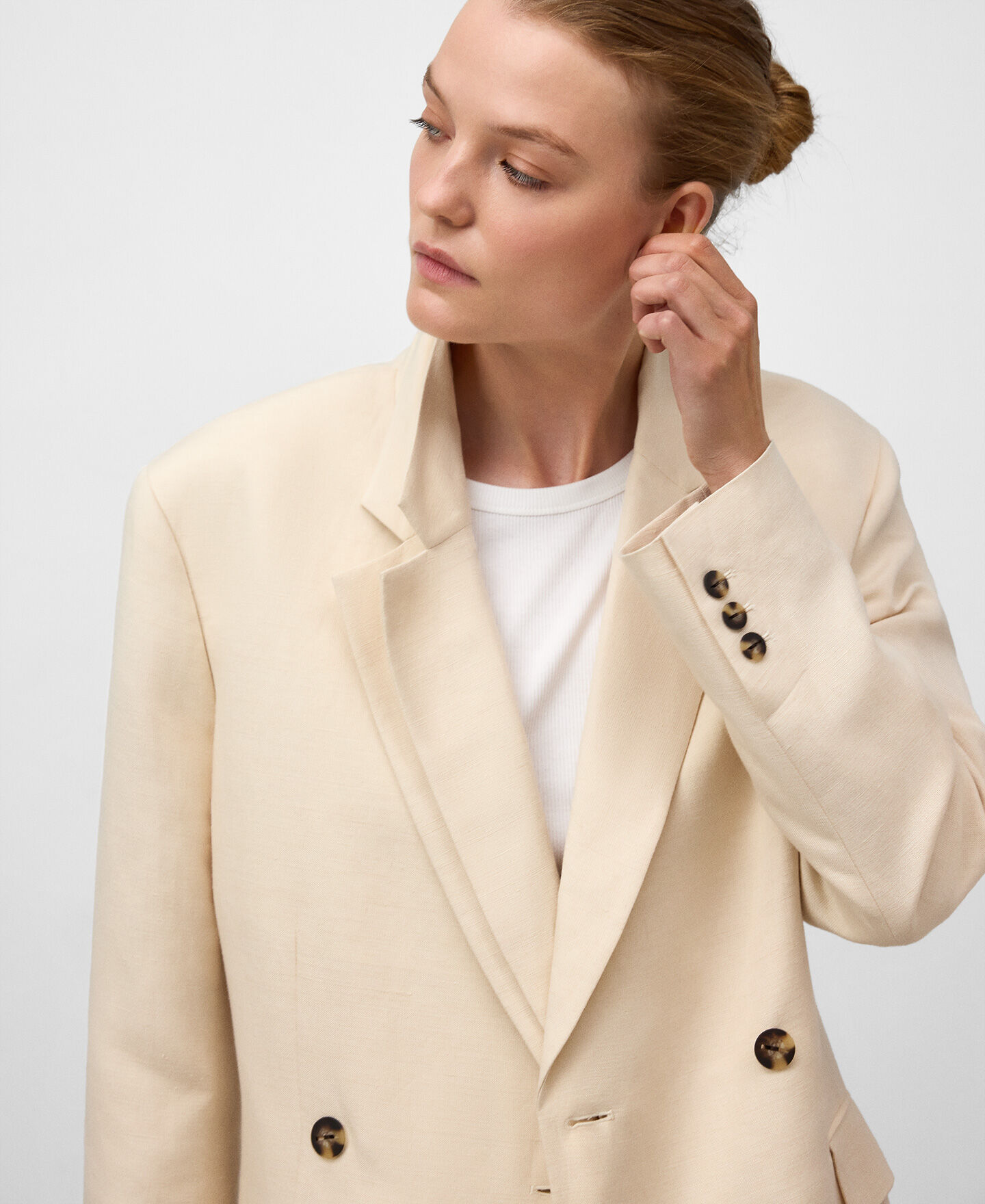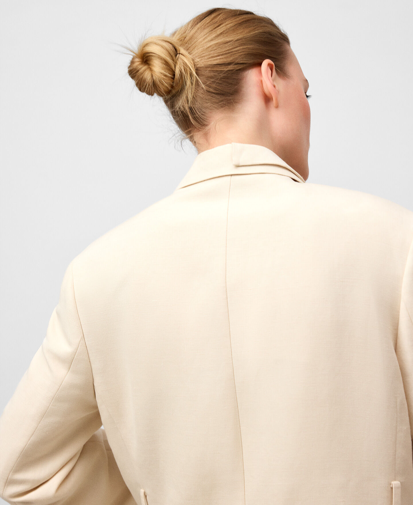 Blazer recta con lino europeo mujer. Doble pieza en solapa derecha. Hombreras. Manga larga con tres botones en puño. Doble botonadura en delantero. Bolsillos de vivo con solapa en delantero. Cinturón. Abertura central en espalda. Largo bajo cadera.