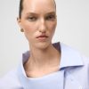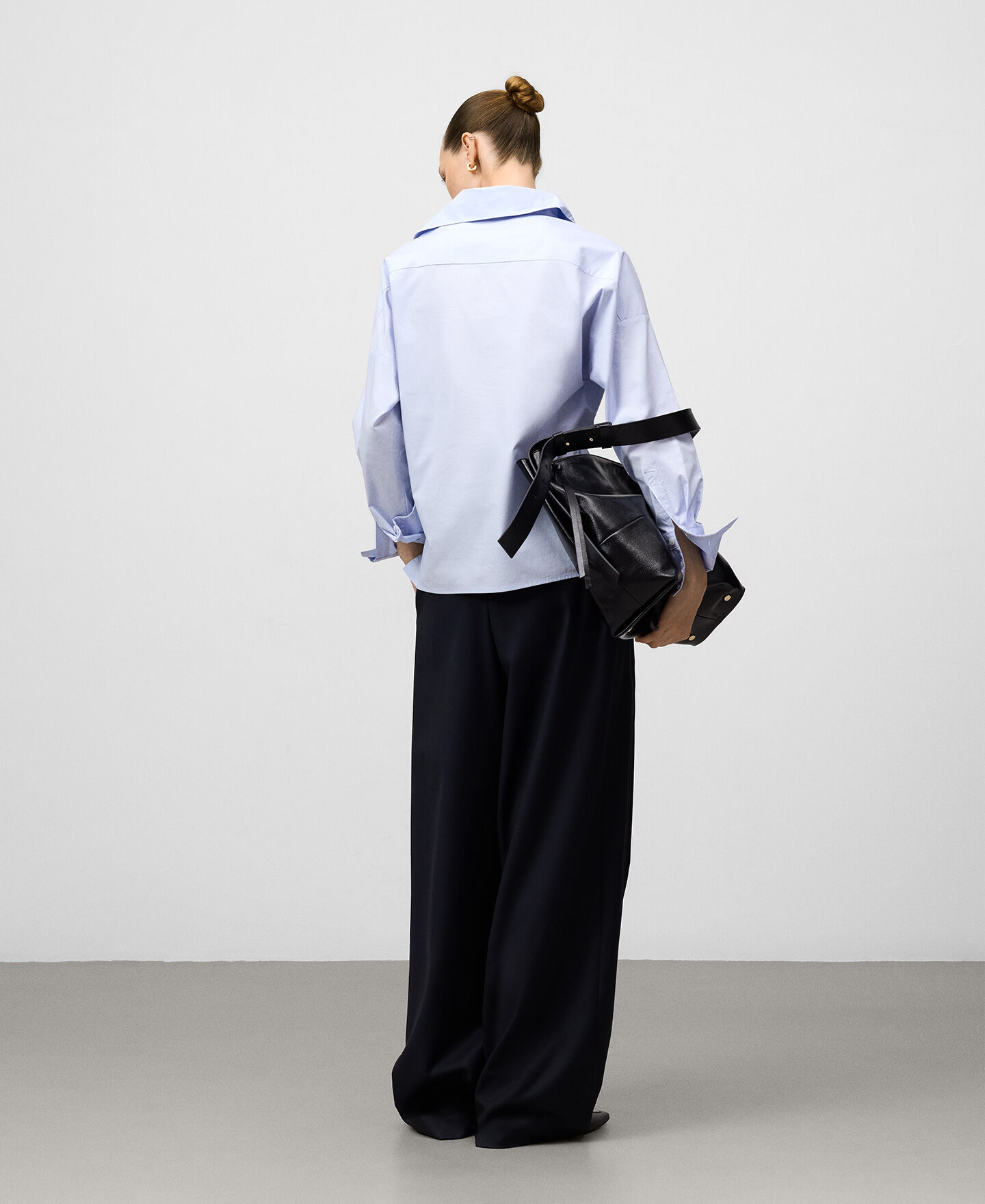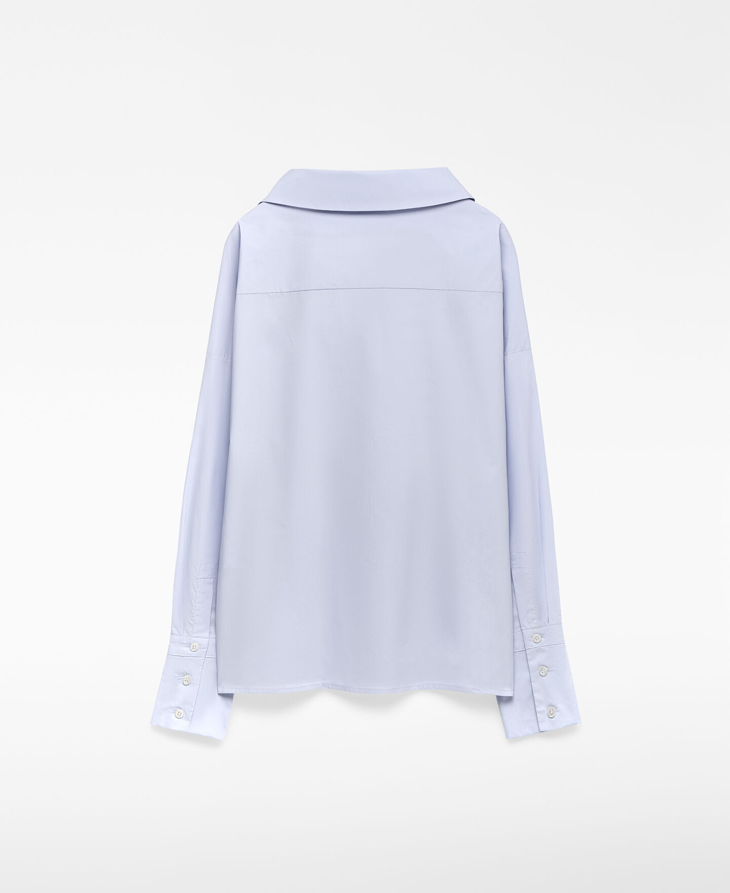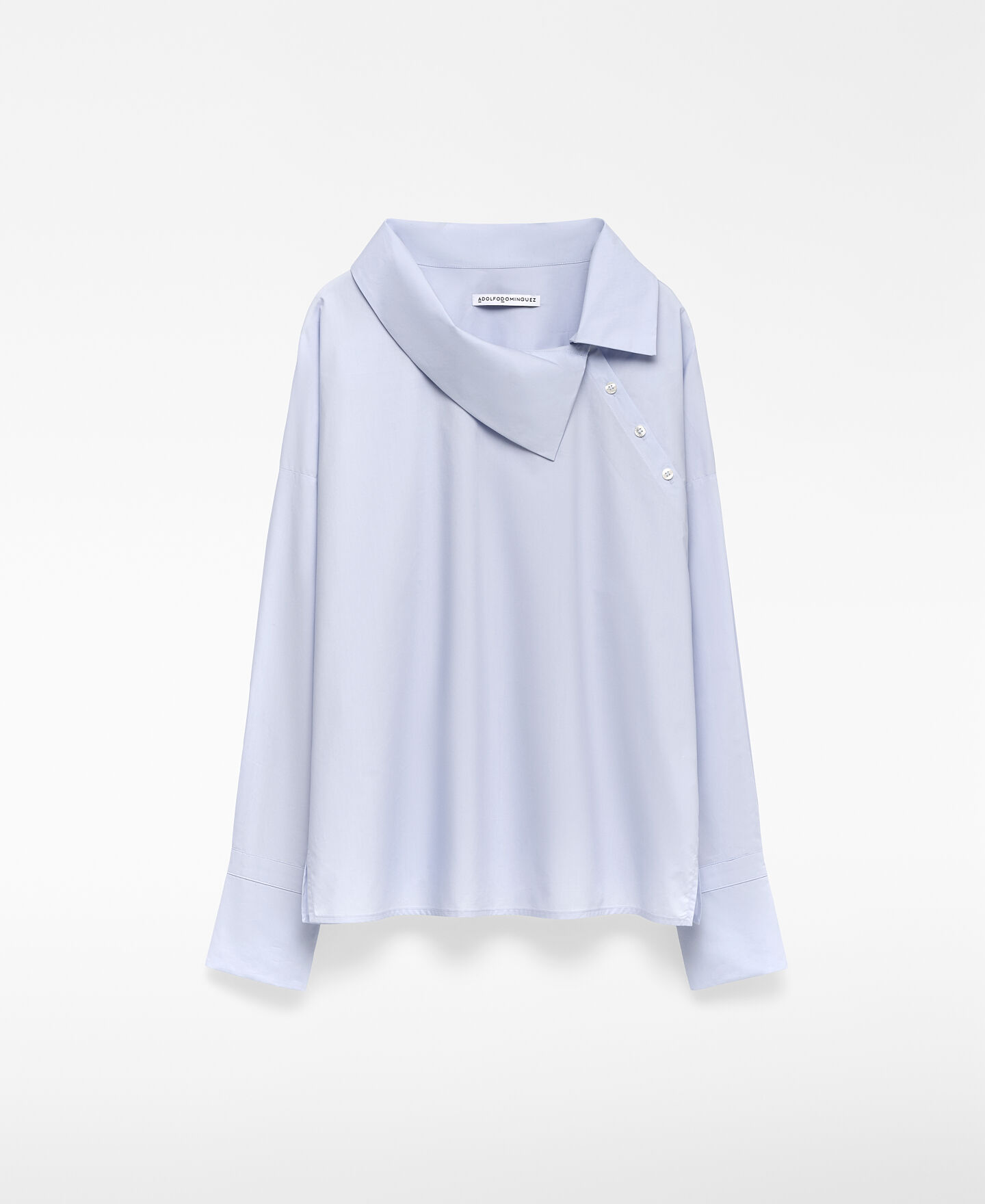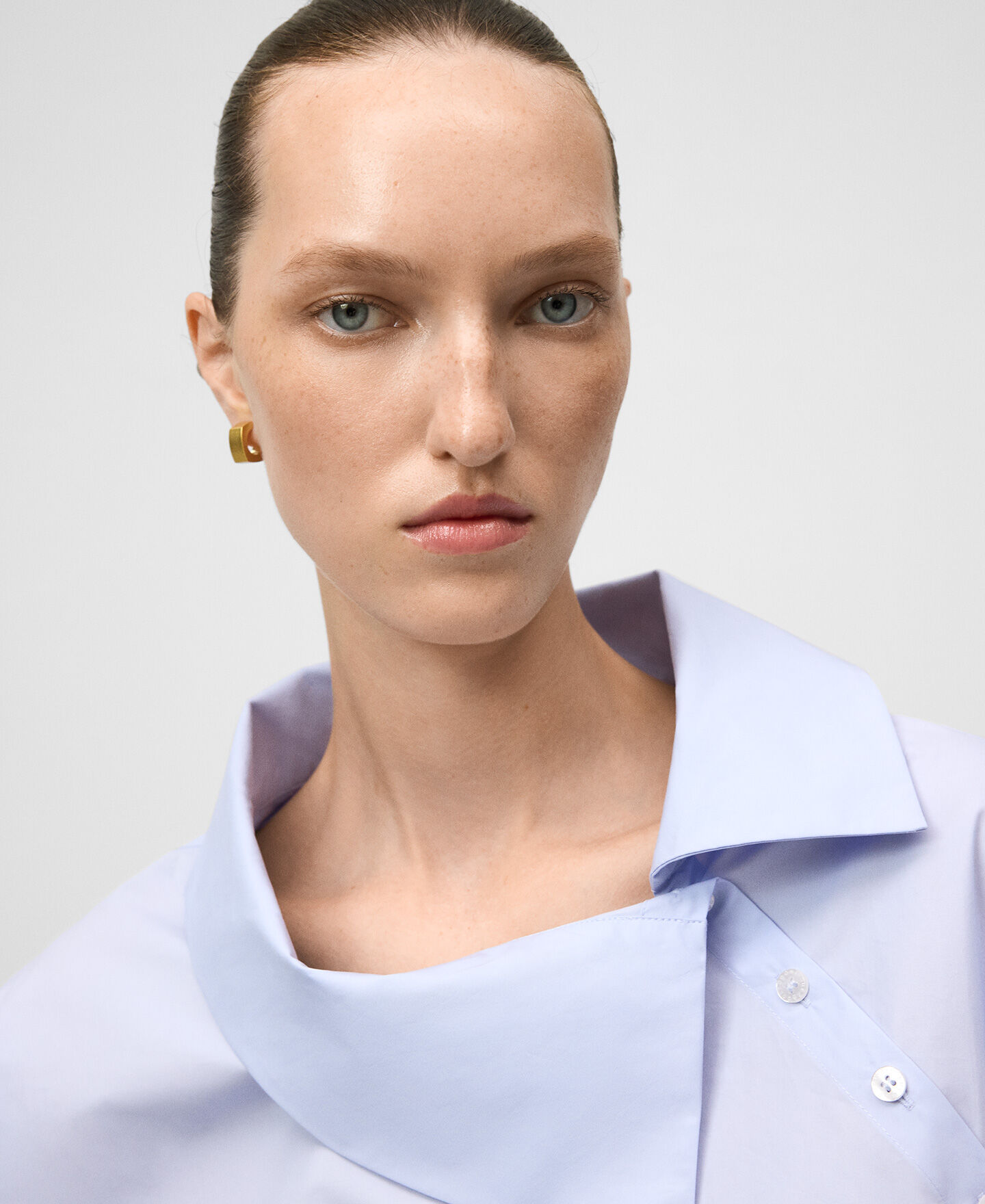 Camisa algodón mujer. Cuello solapa asimétrico. Botonadura lateral hacia sisa izquierda. Manga larga con tres botones en puño. Aberturas laterales. Canesú en espalda.