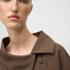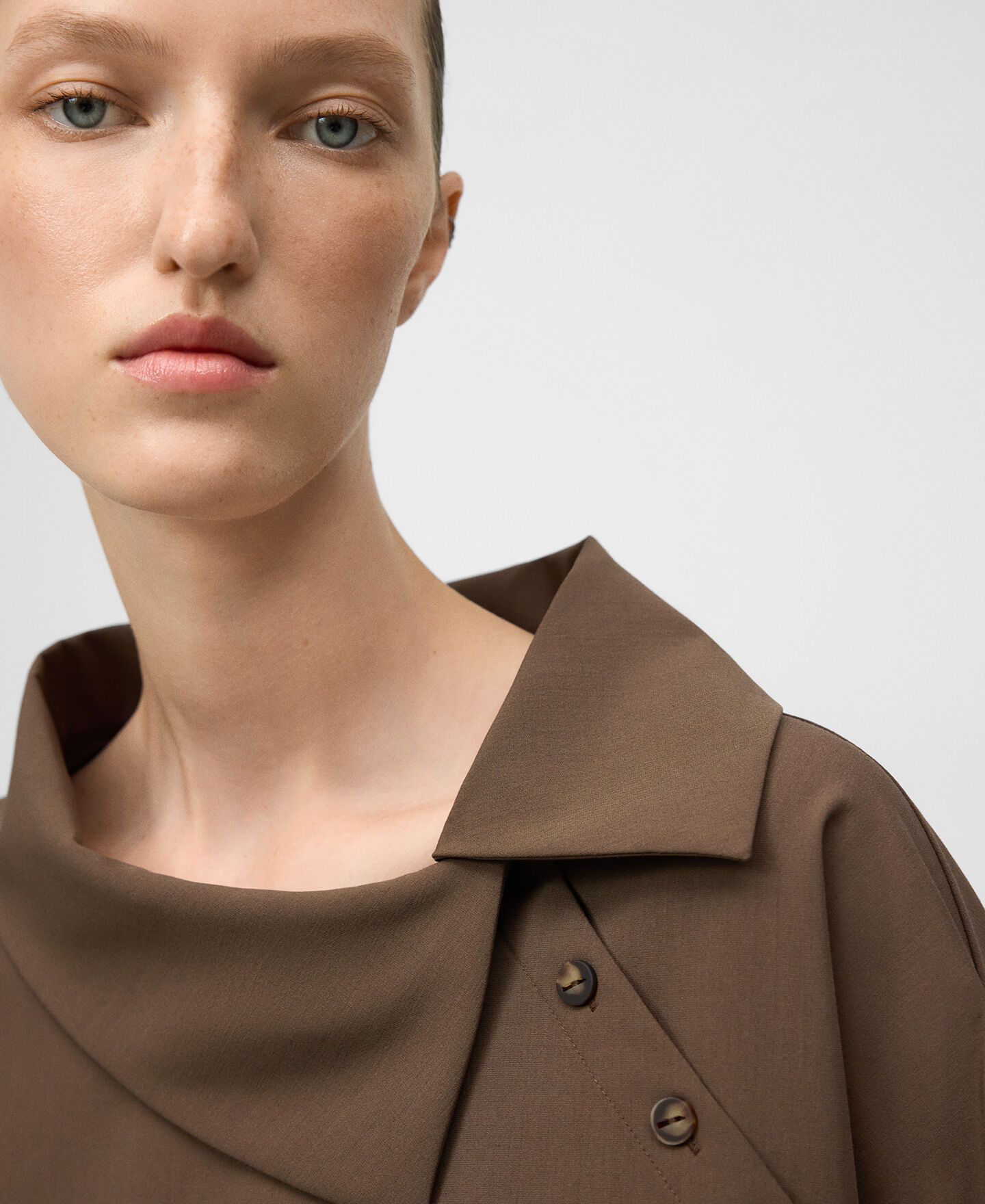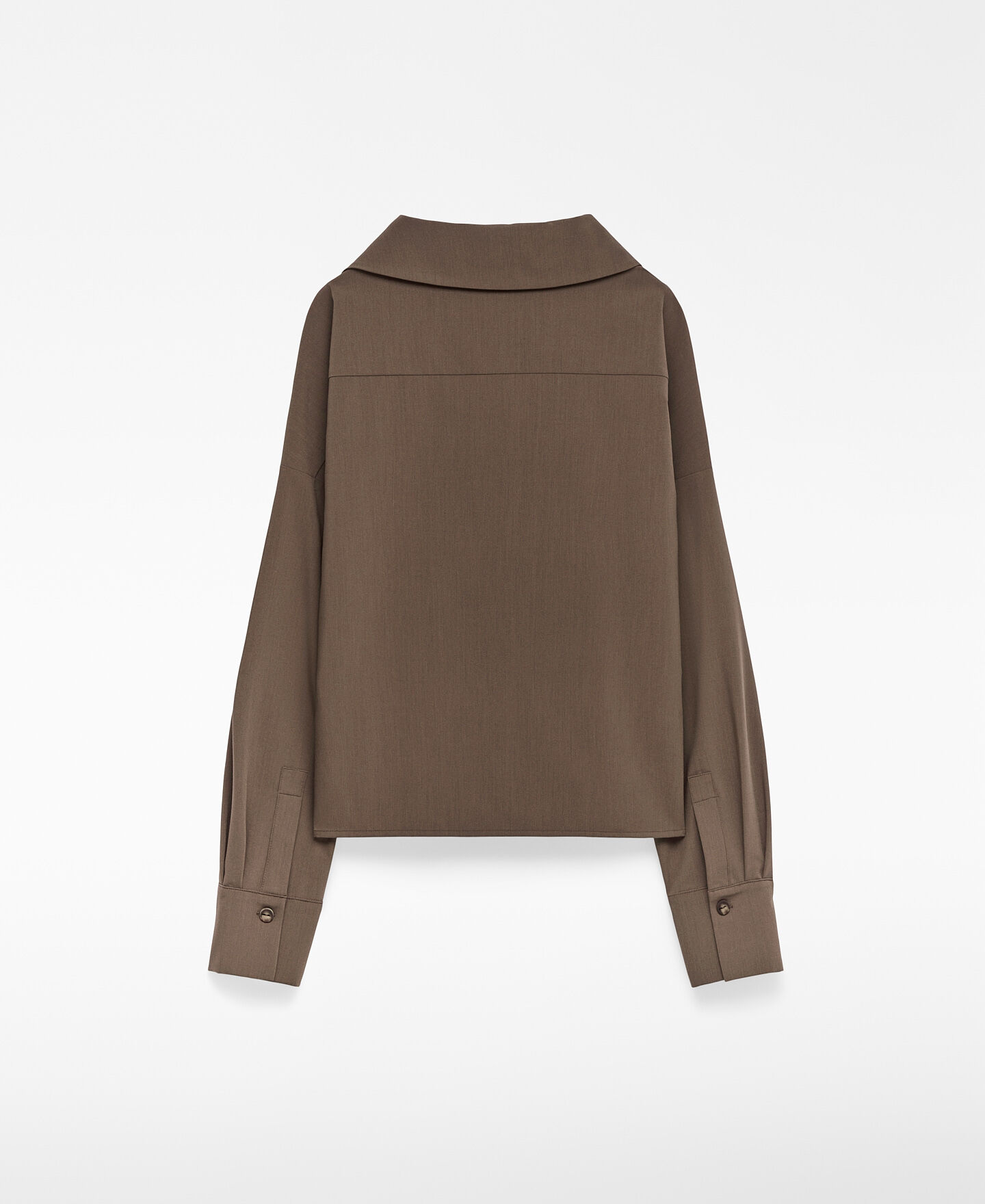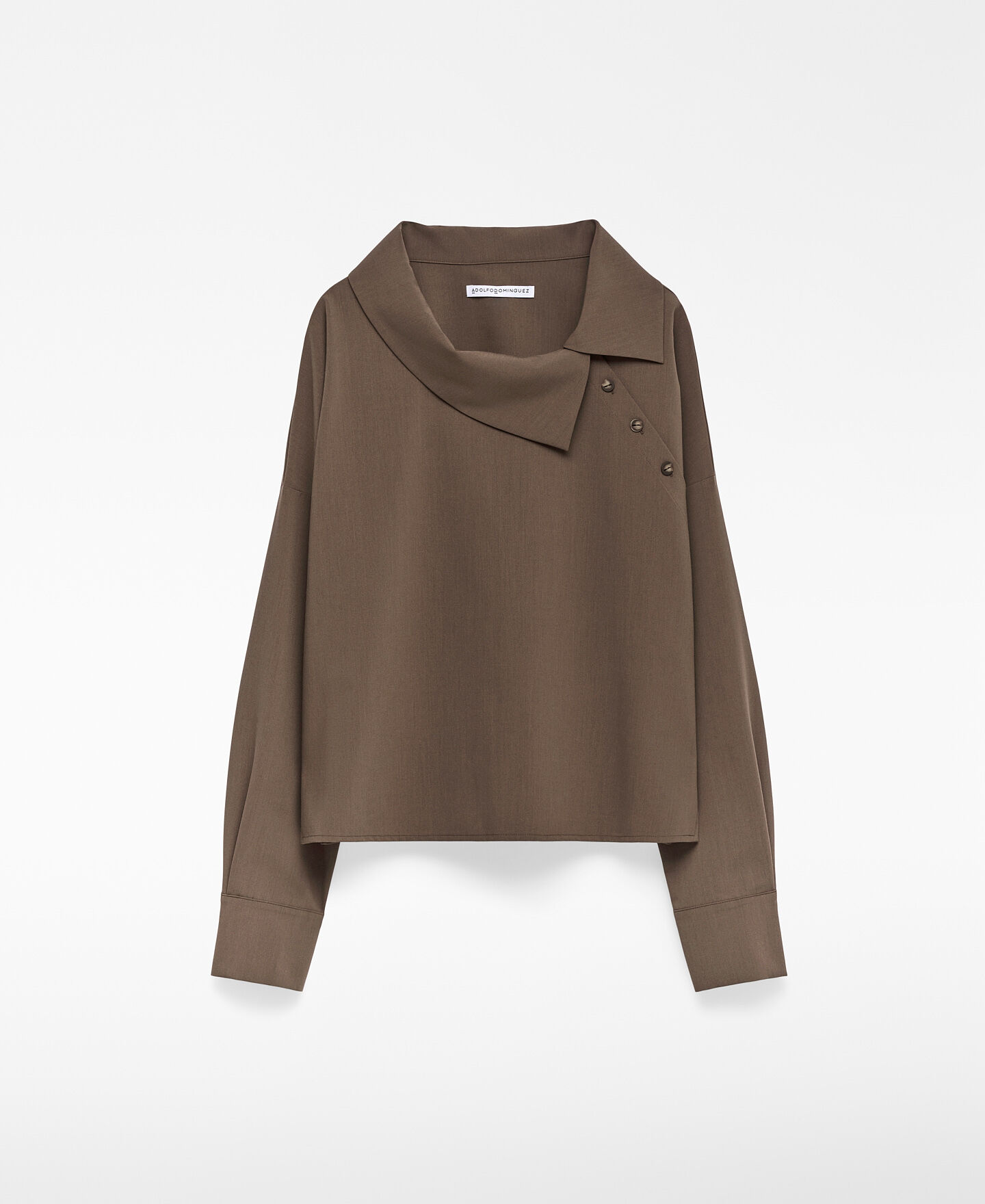Camisa recta mujer. Cuello solapa asimétrico. Botonadura lateral hacia sisa izquierda. Manga larga con tres botones en puño. Aberturas laterales. Canesú en espalda.