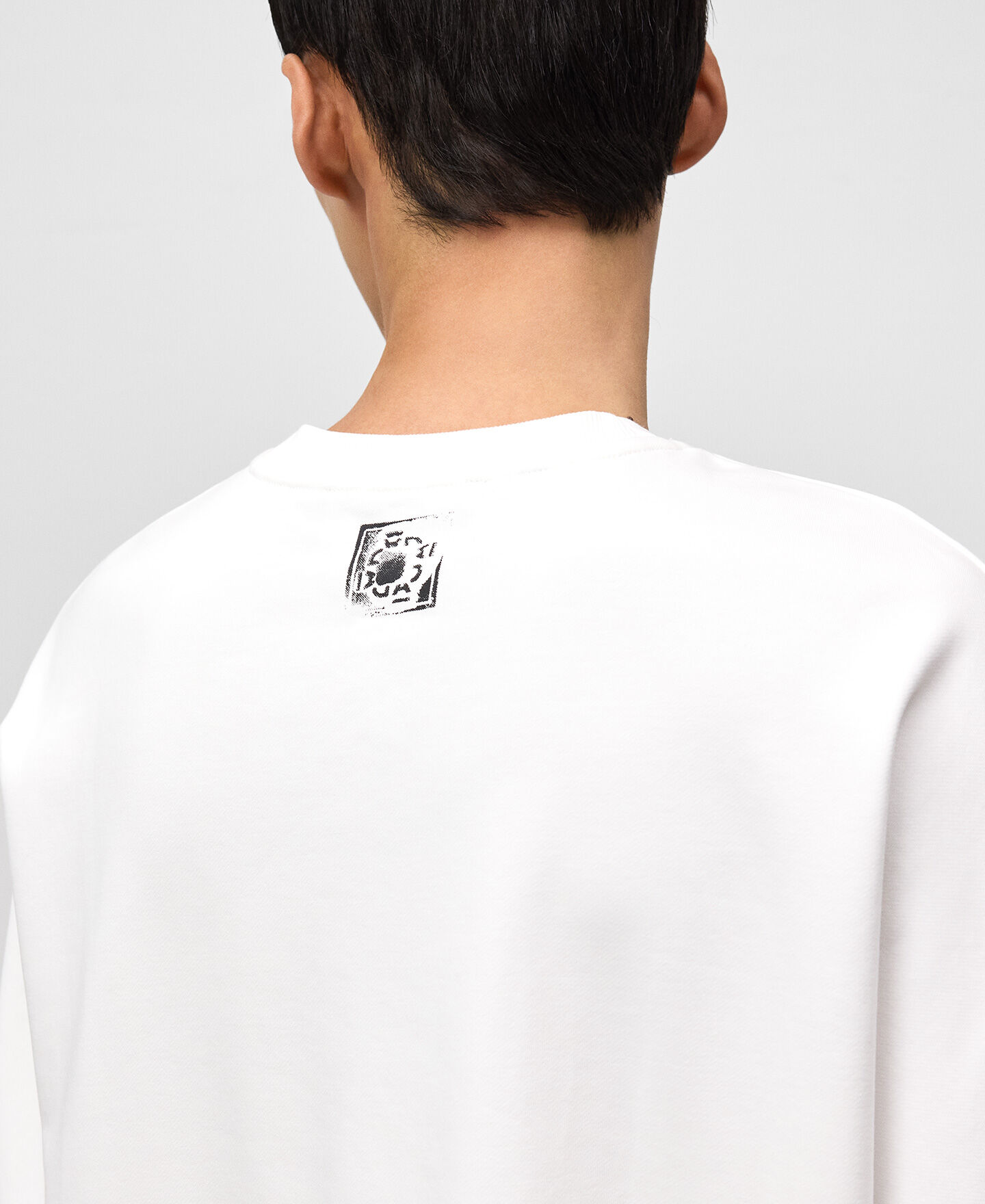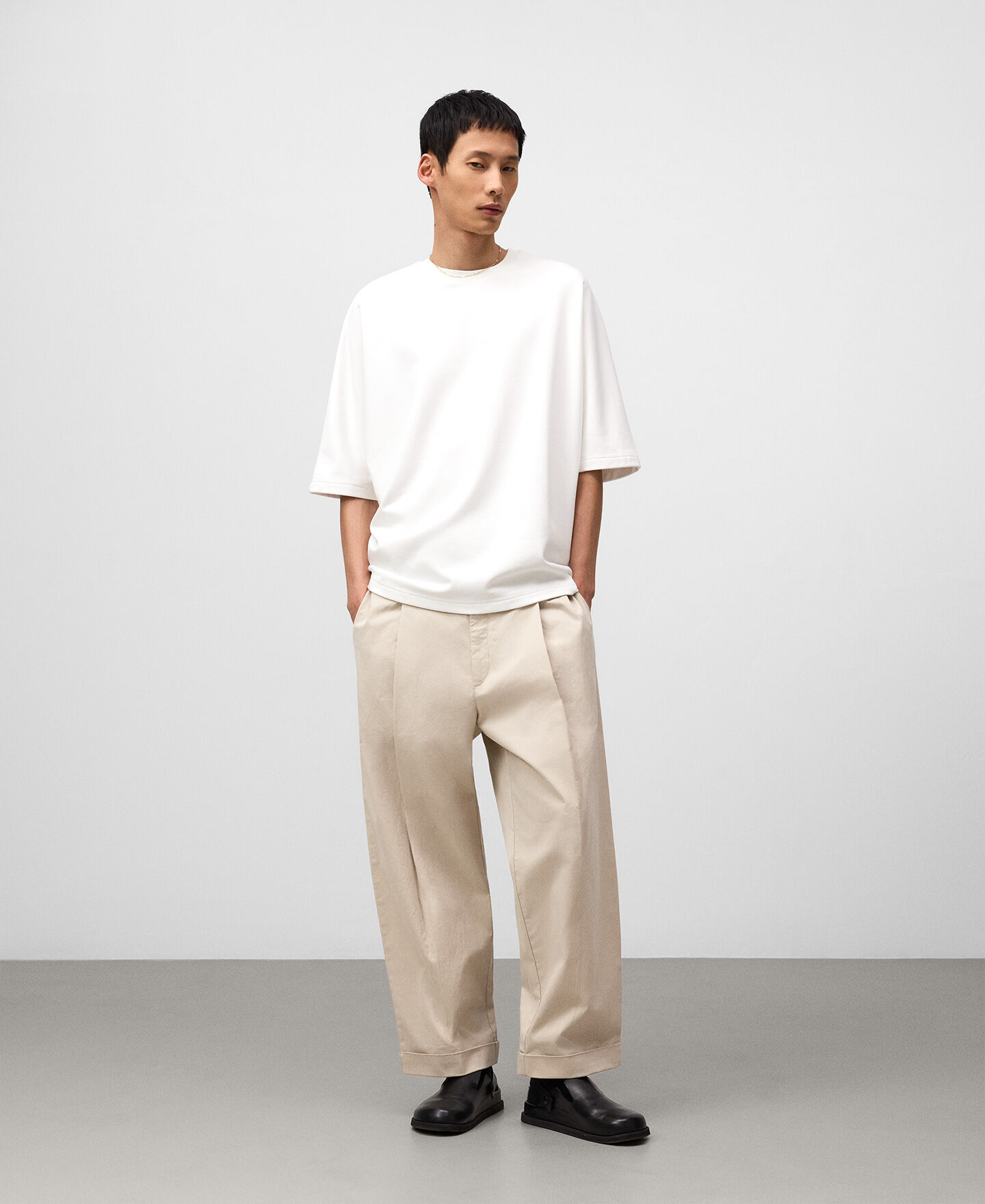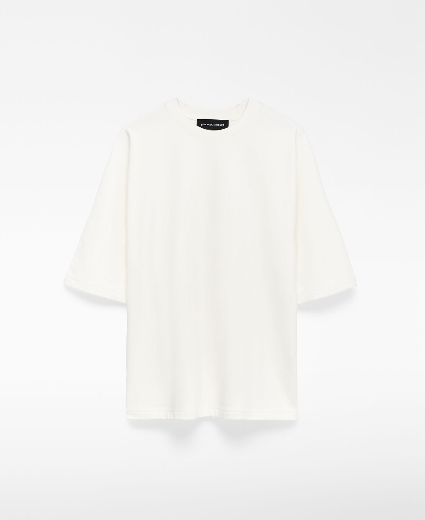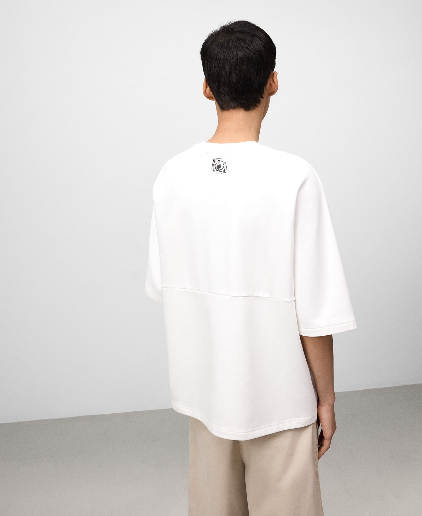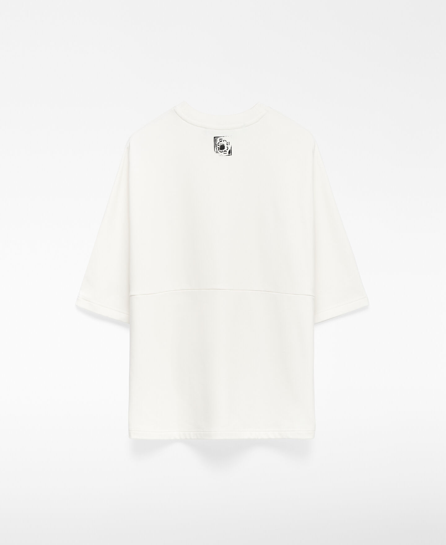 Camiseta hombre. Cuello caja. Vivo a modo de refuerzo en interior. Manga japonesa sobre codo. Corte horizontal en espalda. Logo envejecido estampado en espalda. Doble pespunte en bajo.