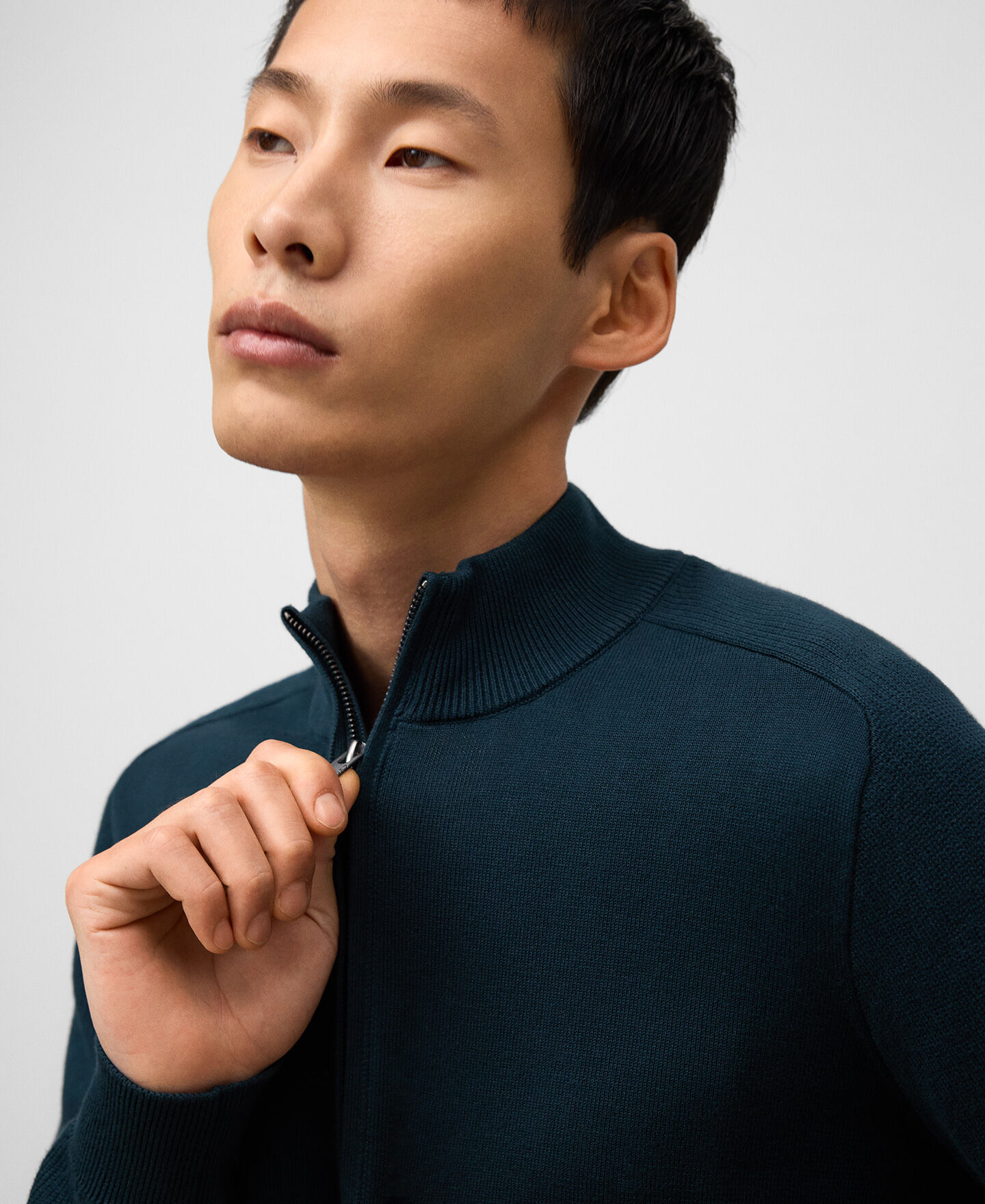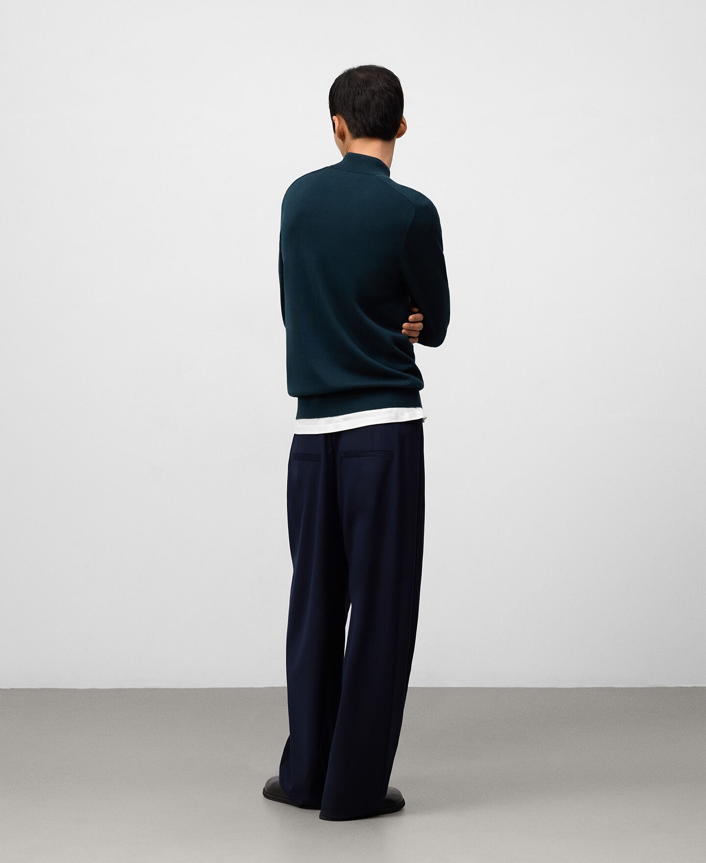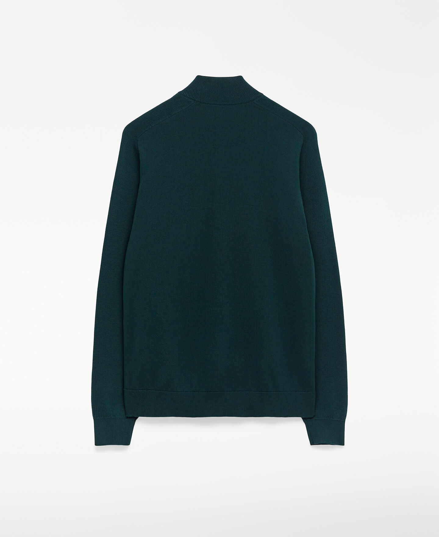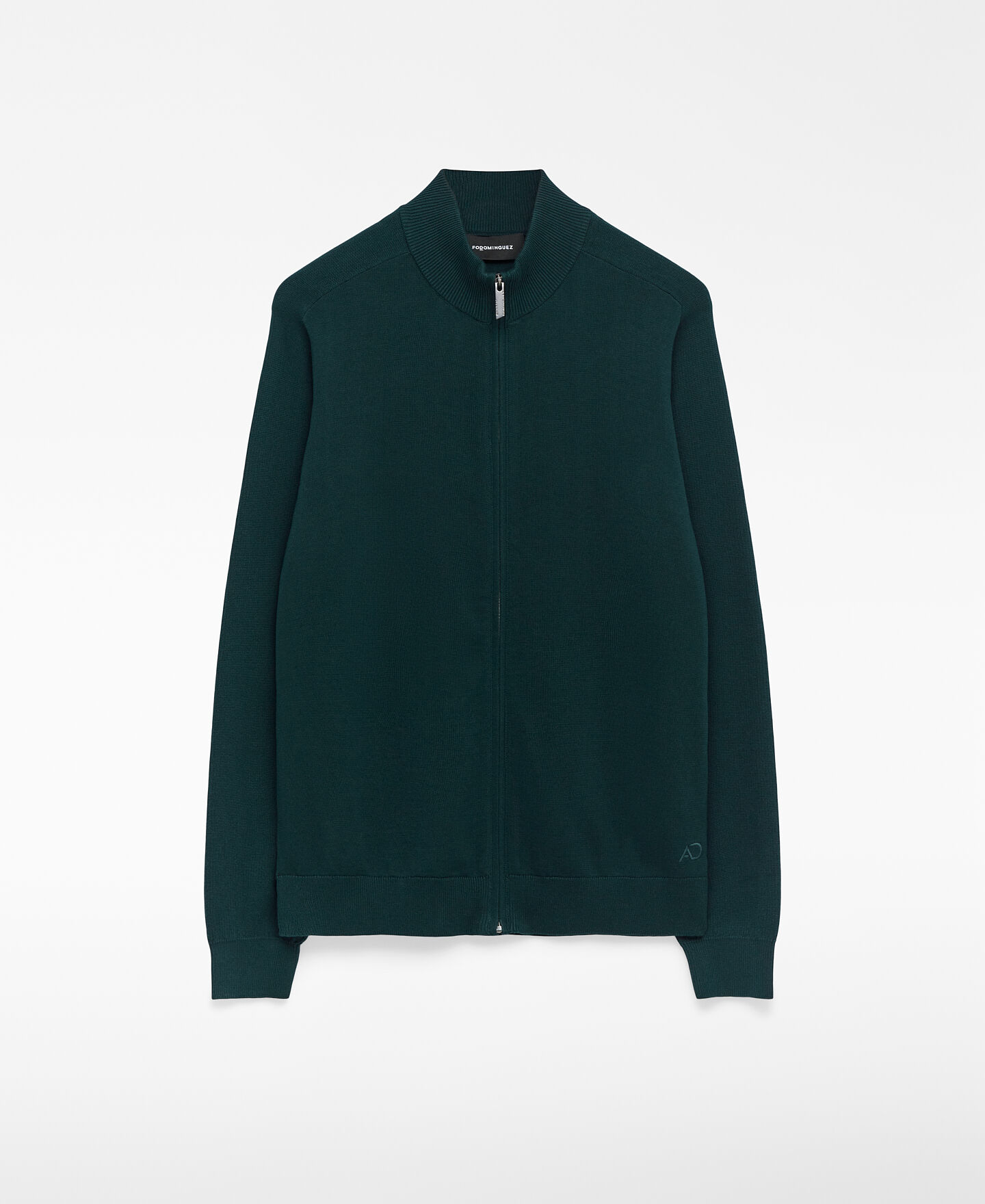 Cárdigan punto algodón orgánico hombre. Cuello alto. Manga inglesa. Detalle de menguados en sisa. Cierre cremallera frontal oculta con vivos. Remates en canalé. Logo bordado en bajo.