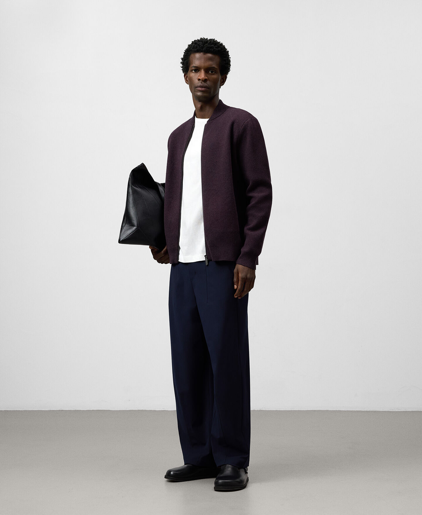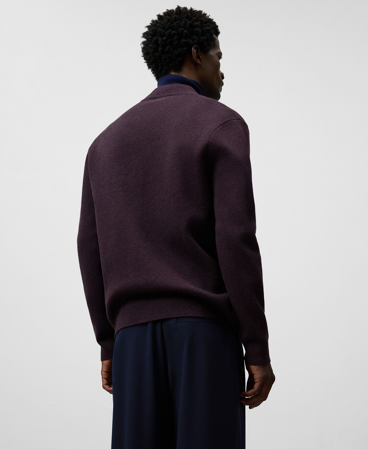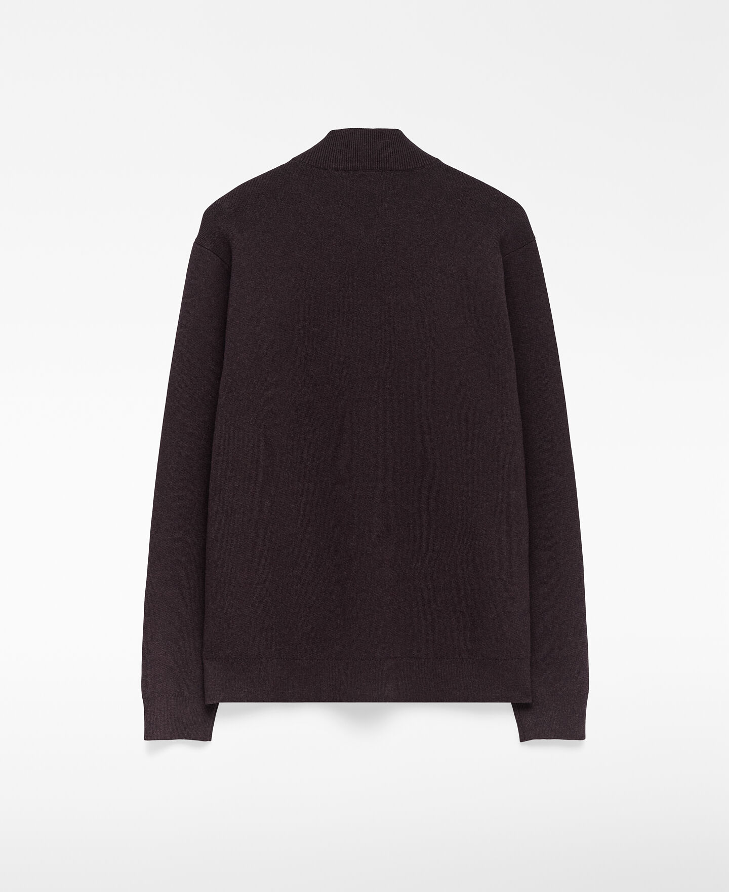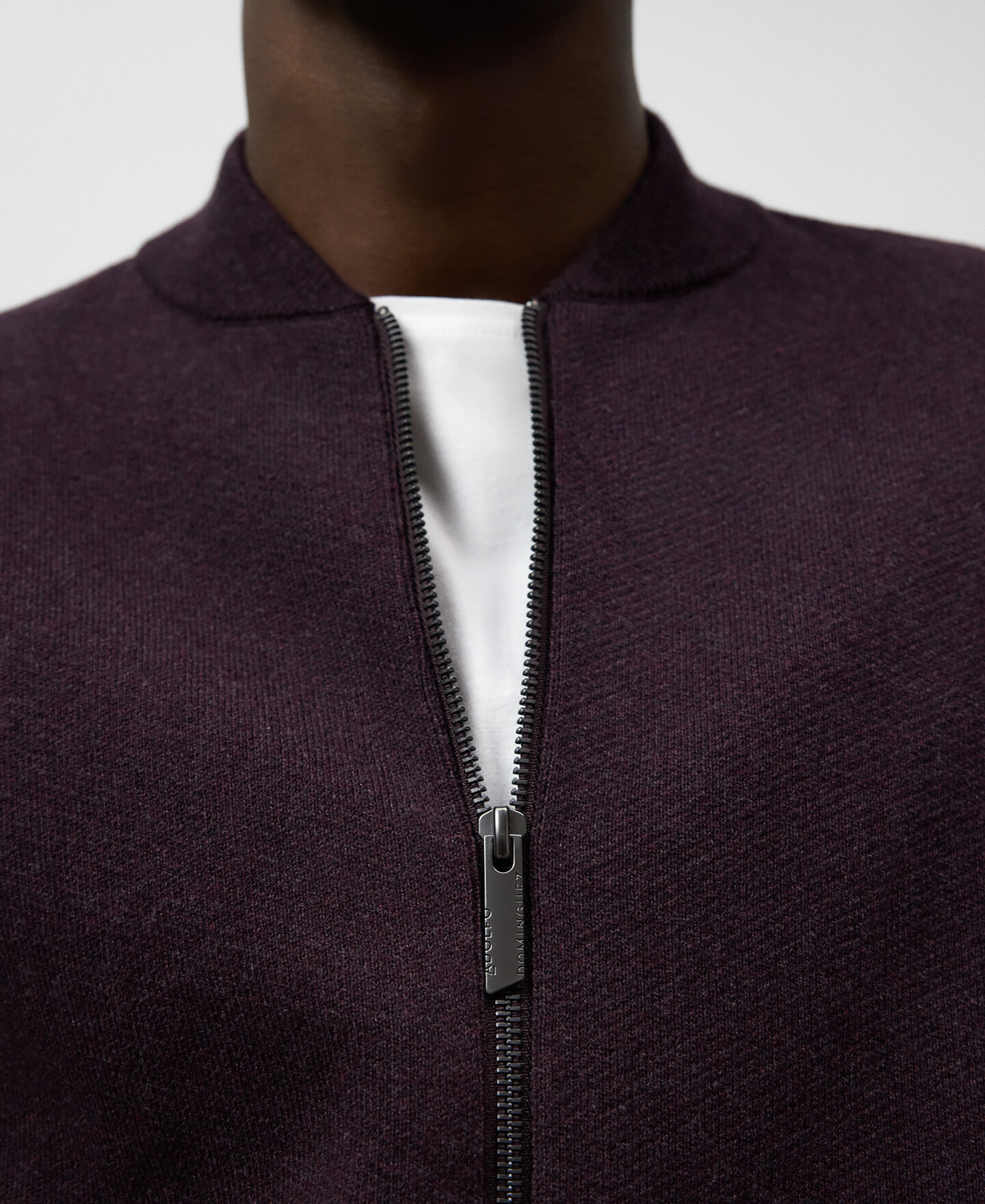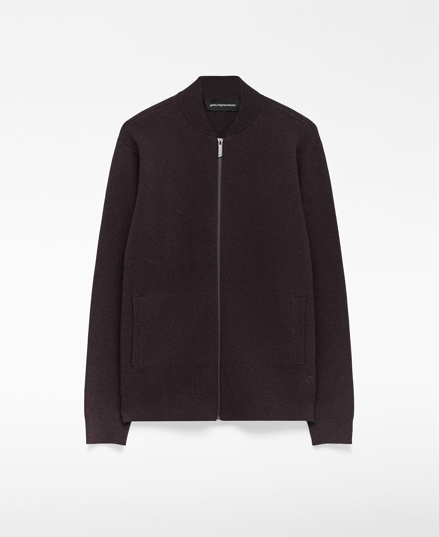 Cárdigan punto algodón orgánico hombre. Cuello bomber. Manga larga. Cierre cremallera frontal. Bolsillos de vivo inclinados en delantero. Remates en canalé. Logo bordado en bajo.