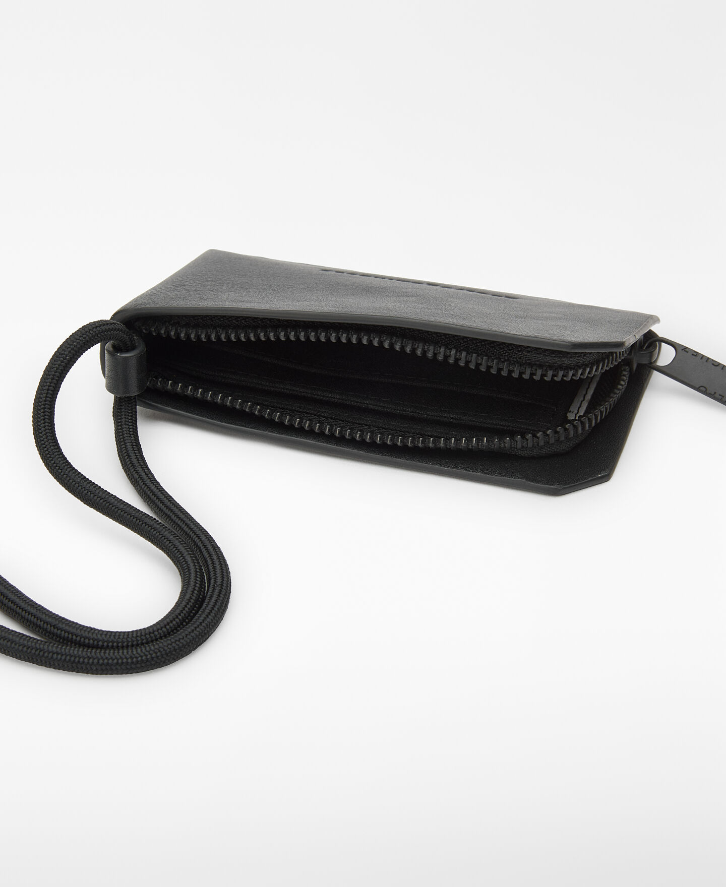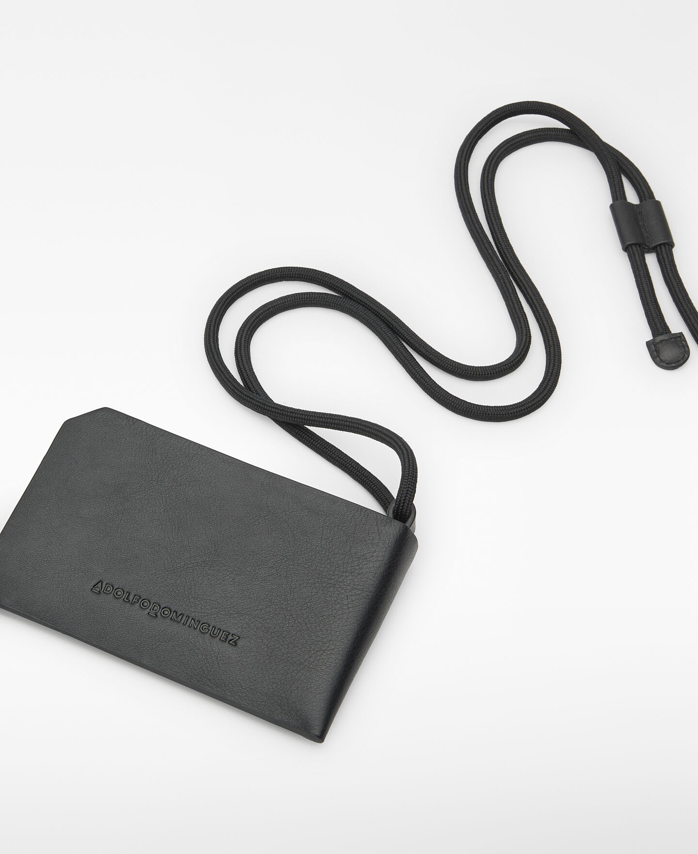 Cartera colgante piel hombre. Detalle de corte diagonal en esquina superior. Un compartimento. Cierre cremallera. Tarjetero interior. Cordón largo regulable. Logo grabado.