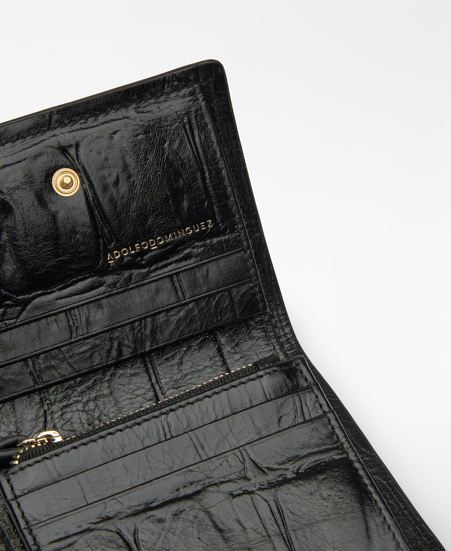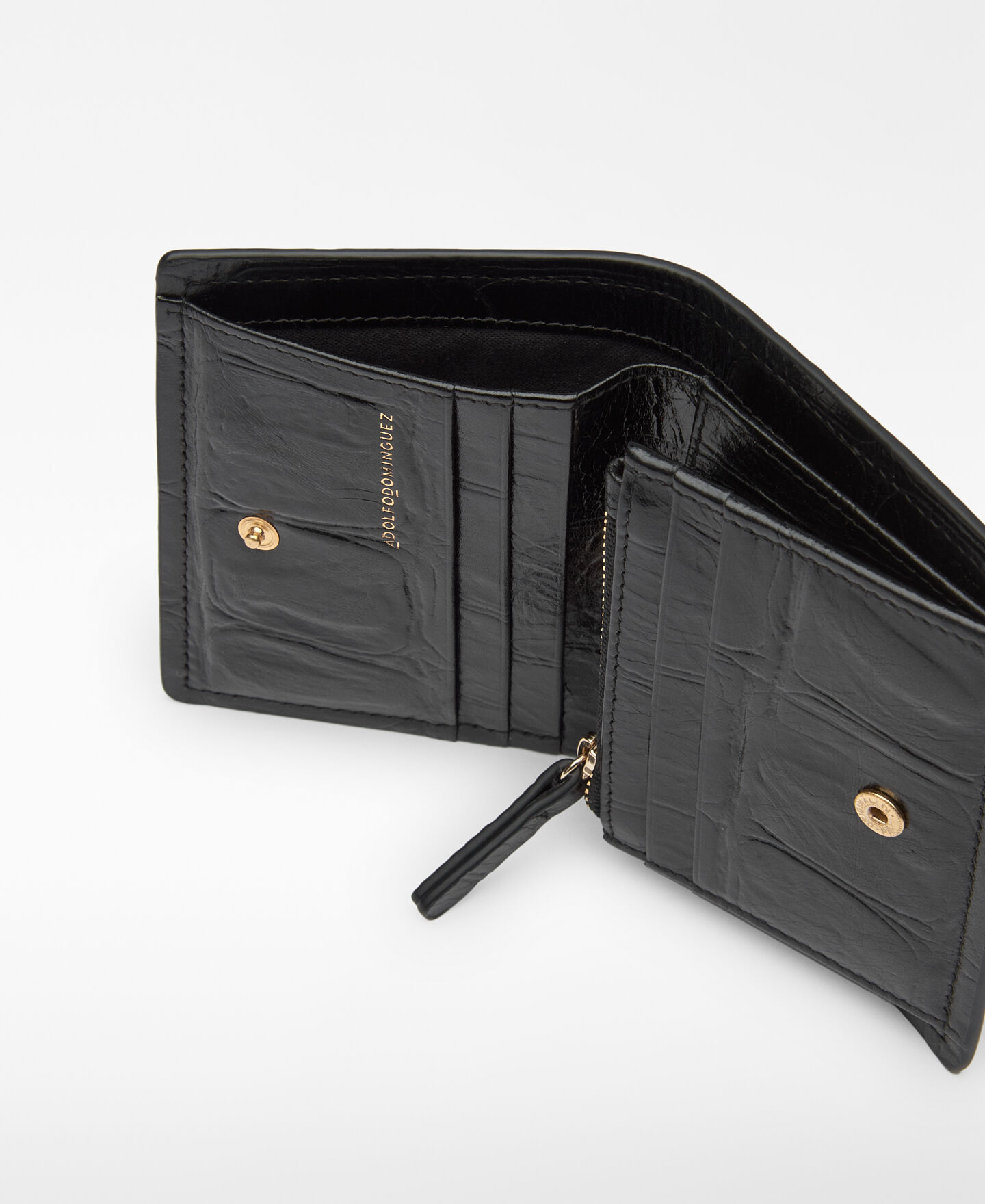 Cartera Mica piel mujer. Maxi grabado coco. Cierre solapa con broche. Compartimento interior para billetes. Compartimento interior para monedas. Tarjetero interior. Bolsillo interior con cierre cremallera. Logo grabado.