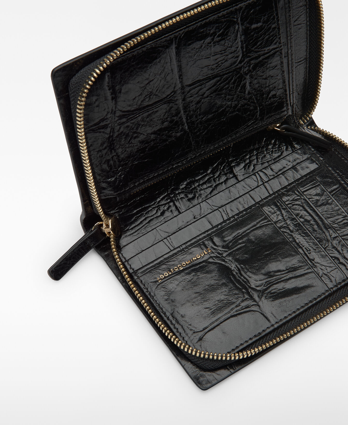 Cartera Mica piel mujer. Maxi grabado coco. Cierre cremallera. Compartimento interior para billetes. Tarjetero interior. Bolsillo interior con cierre cremallera. Logo grabado.