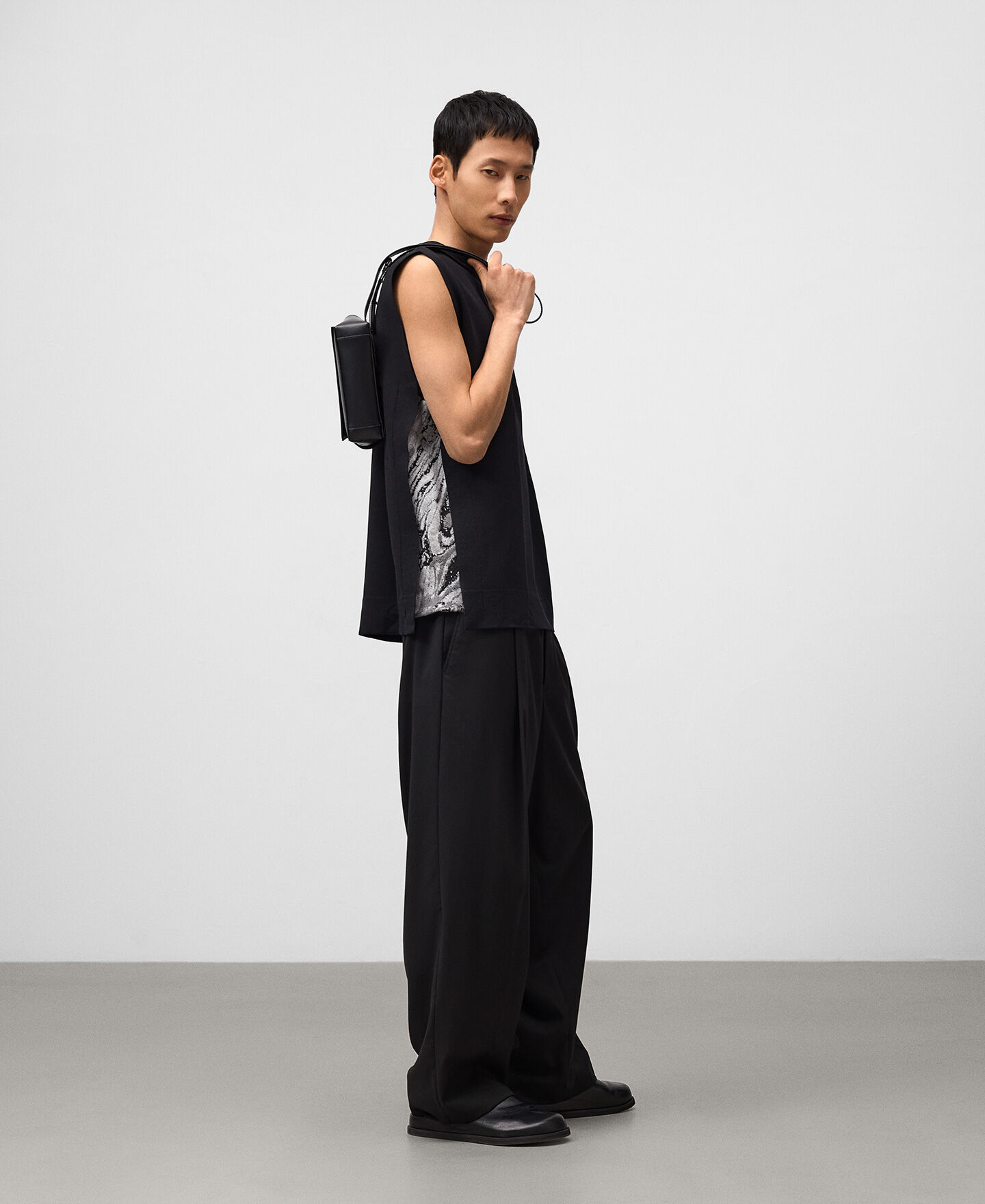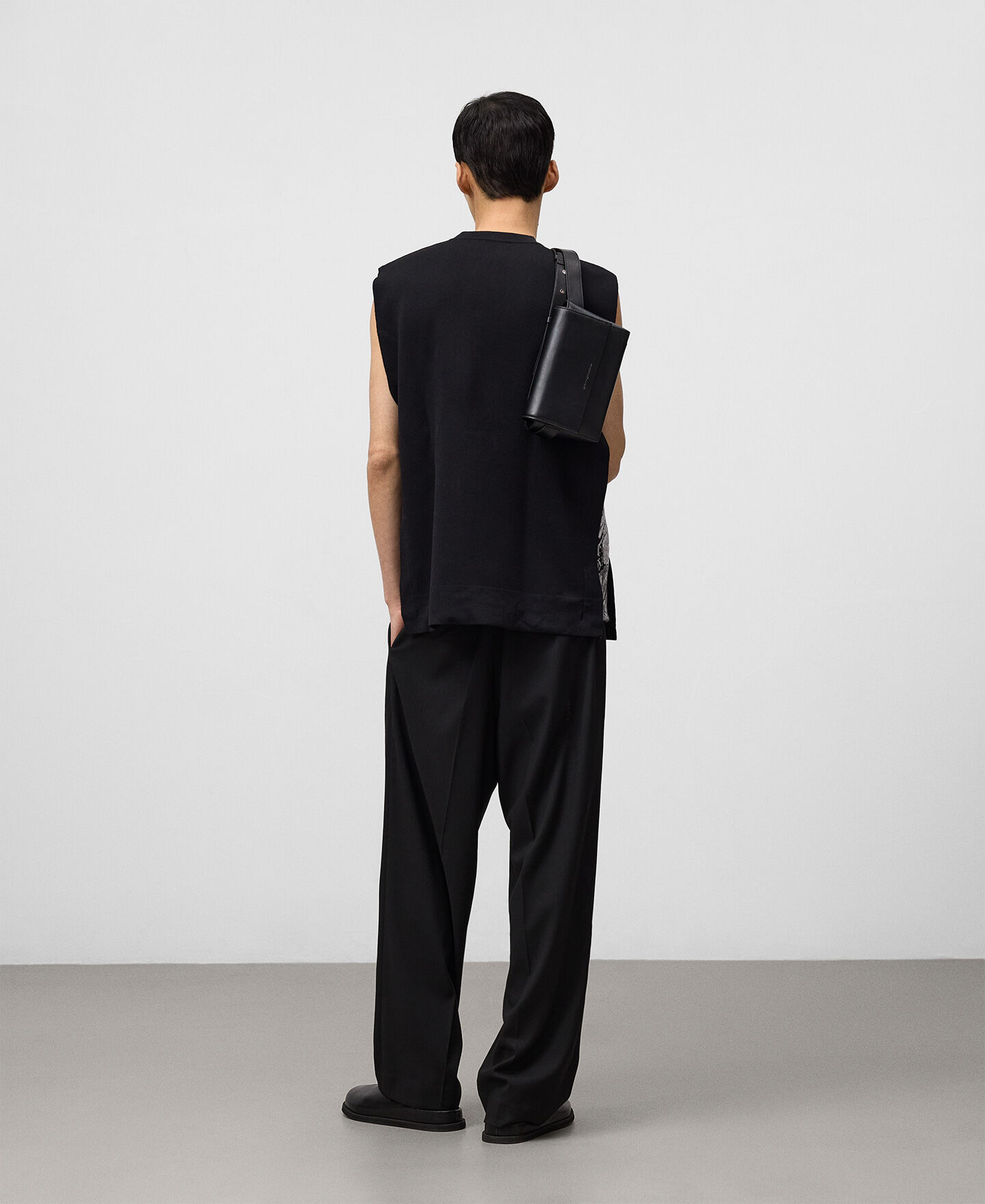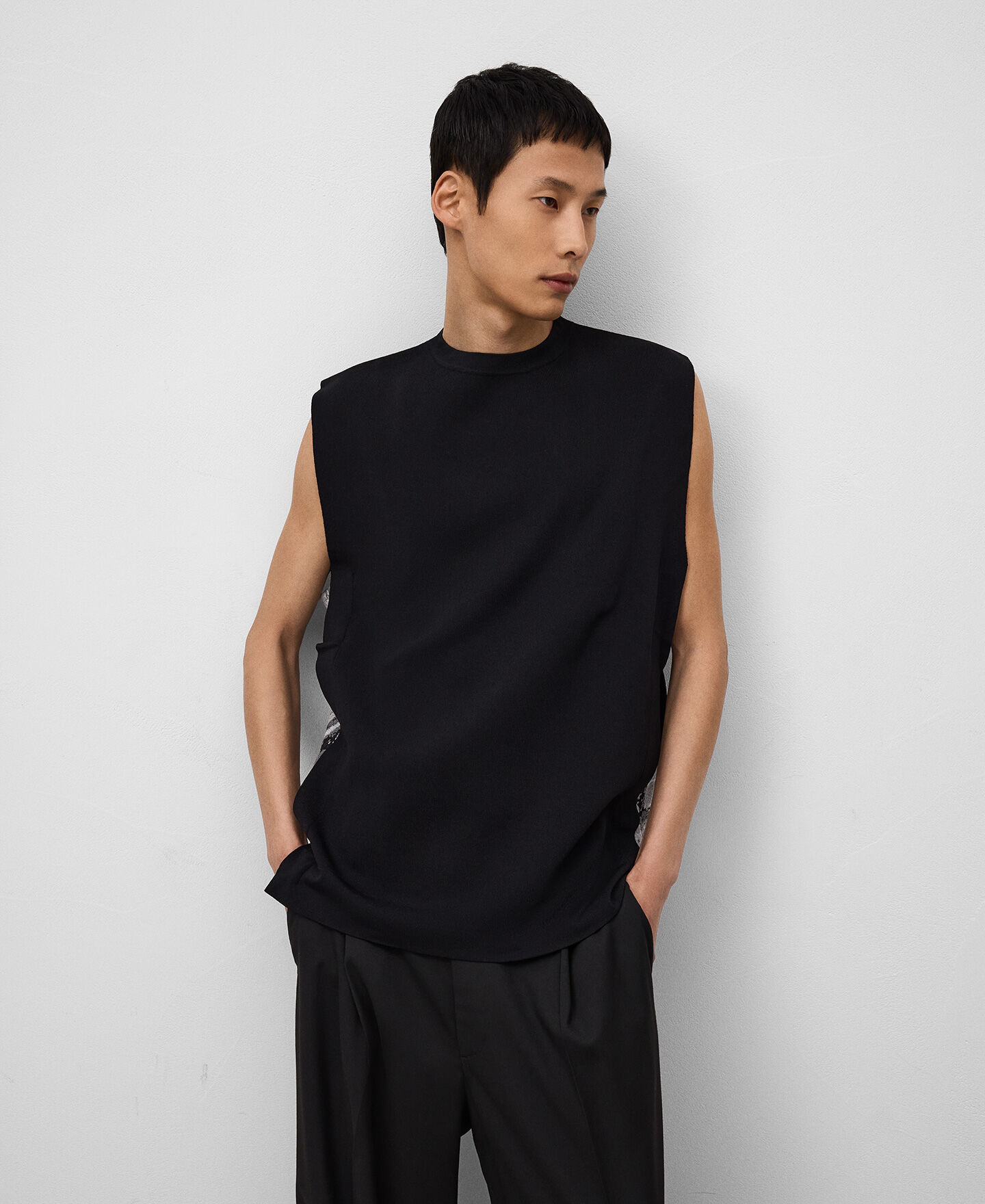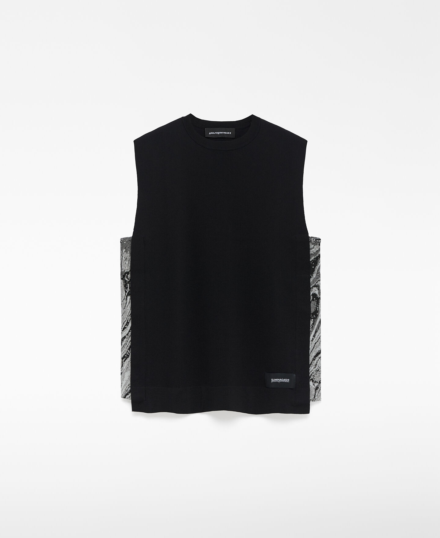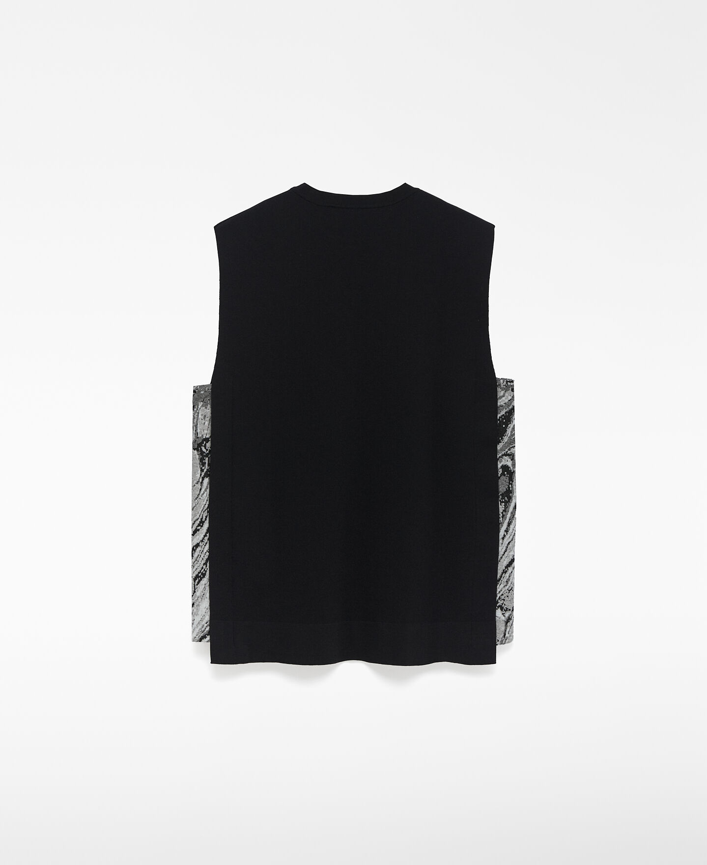 Chaleco punto hombre. Cuello caja. Manga sisa. Piezas laterales con estampado de la Colección Aqua. Etiqueta exterior logotipada en delantero.
