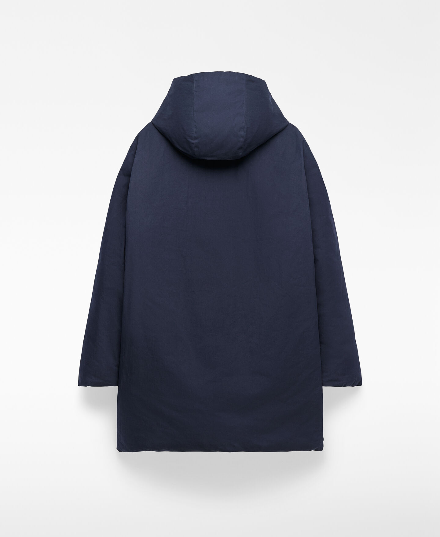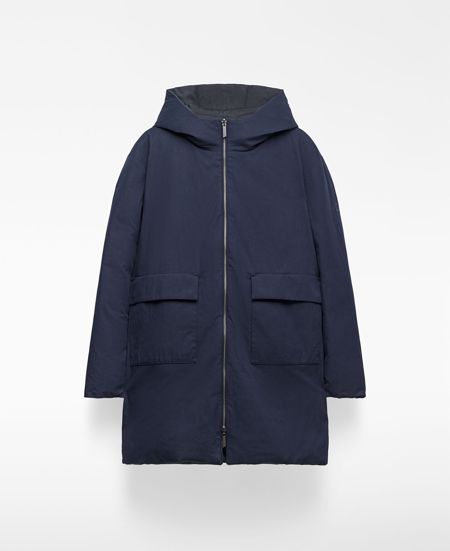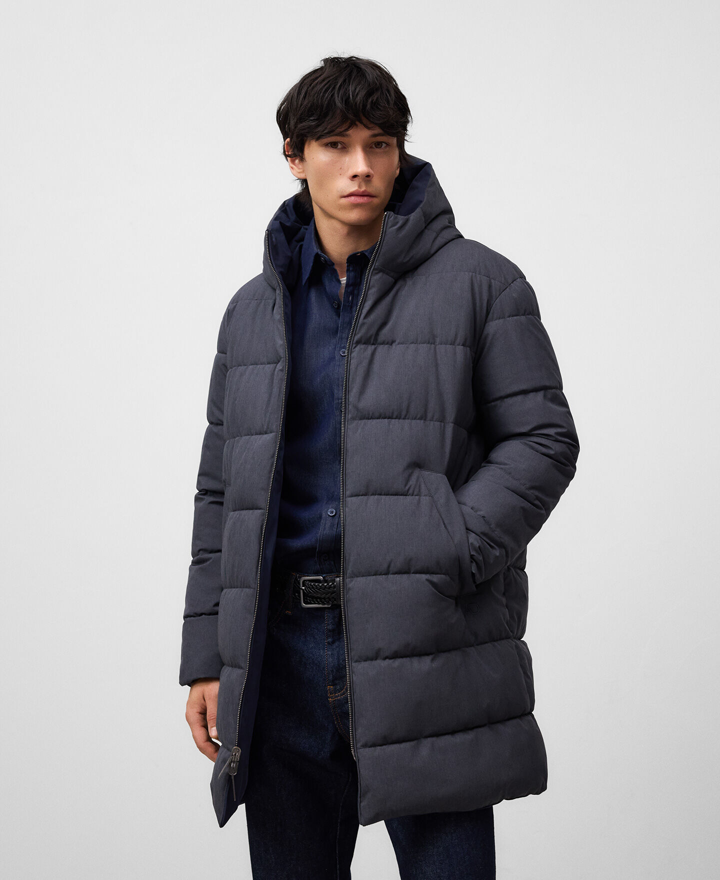 Chaqueta acolchada reversible hombre. Capucha. Manga larga. Cierre cremallera frontal. Cara anversa lisa con bolsillos de plastrón de doble entrada. Cara inversa acolchada con bolsillos de vivo inclinados.