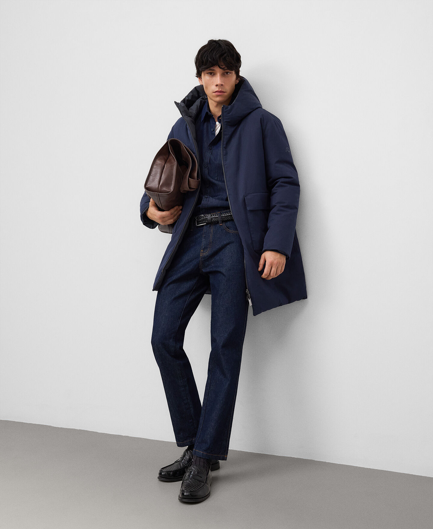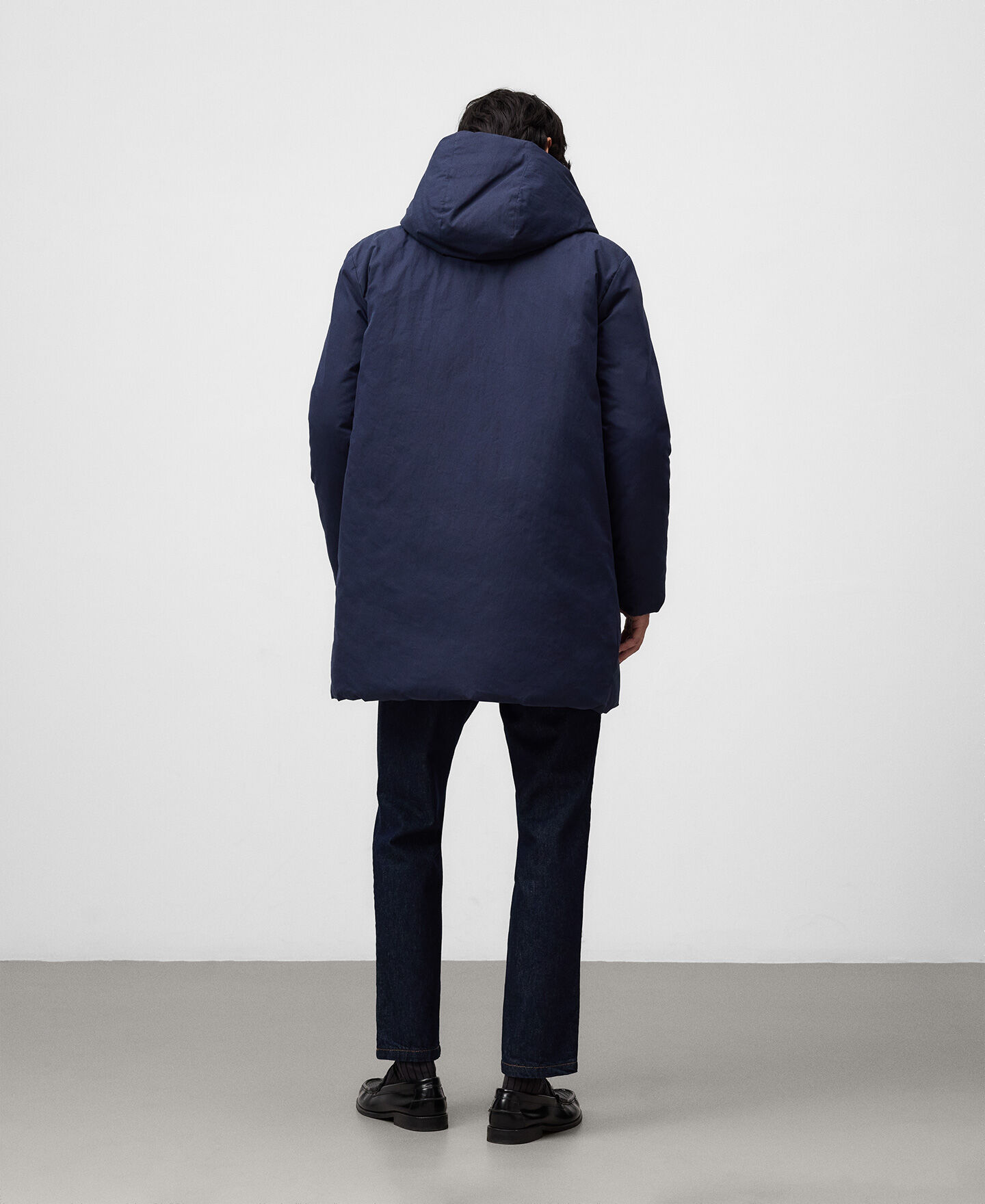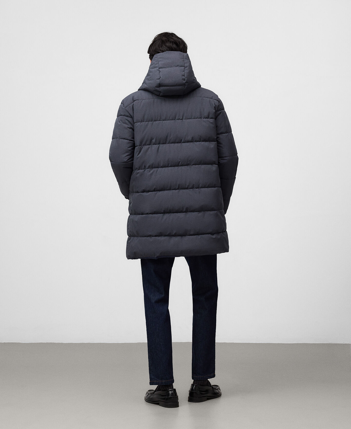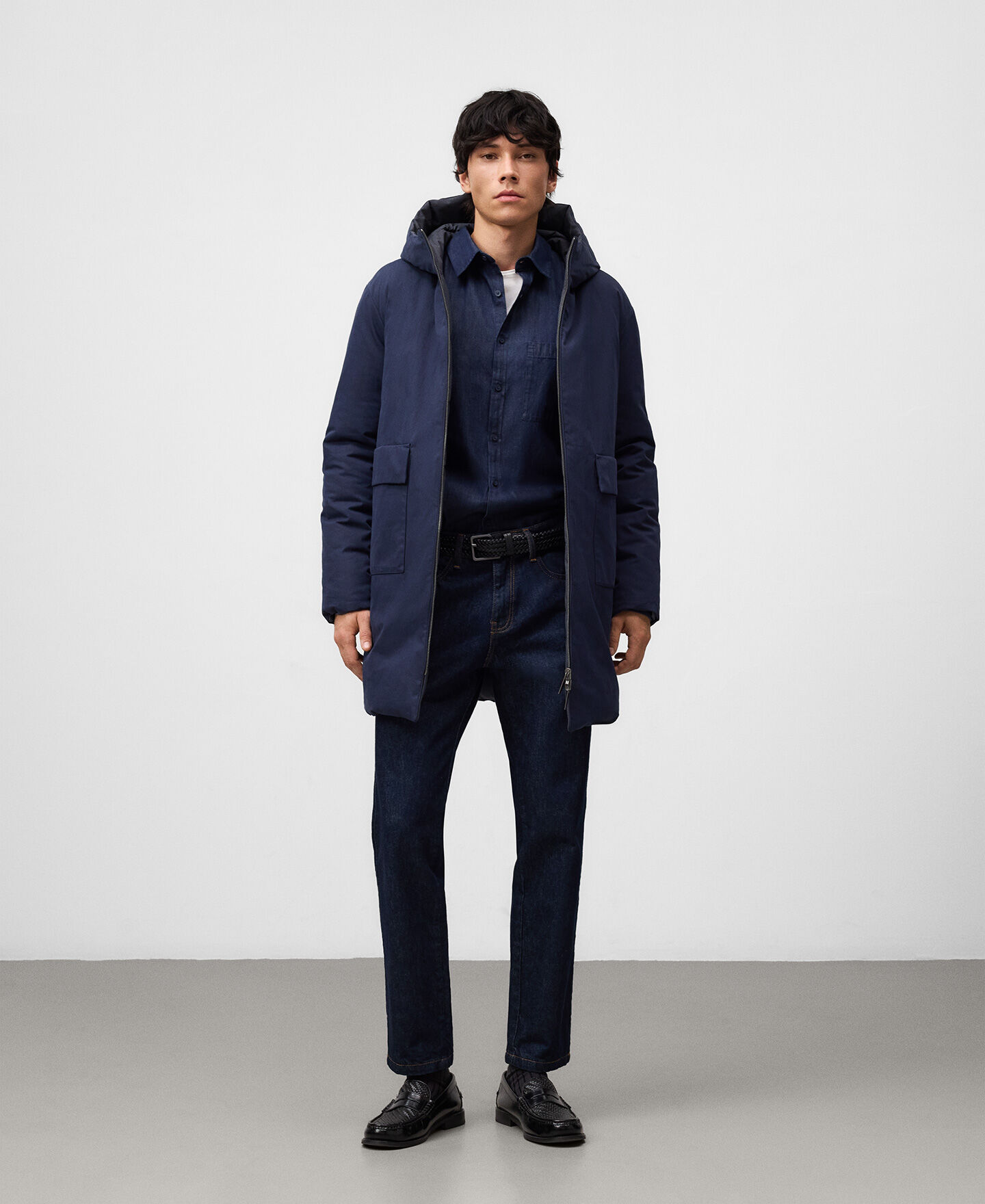 Chaqueta acolchada reversible hombre. Capucha. Manga larga. Cierre cremallera frontal. Cara anversa lisa con bolsillos de plastrón de doble entrada. Cara inversa acolchada con bolsillos de vivo inclinados.