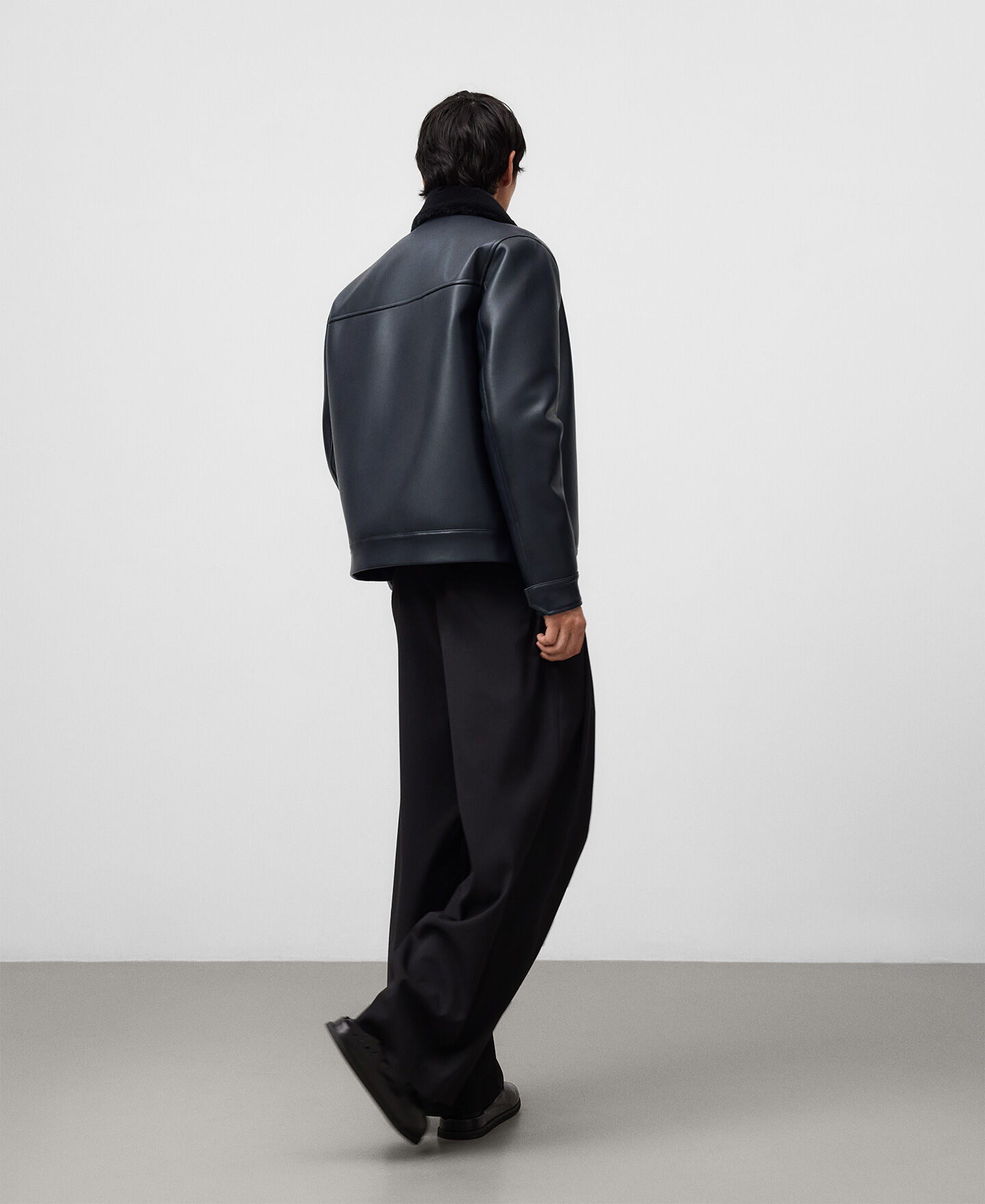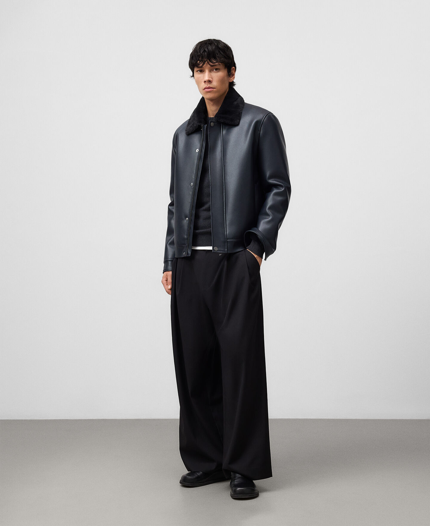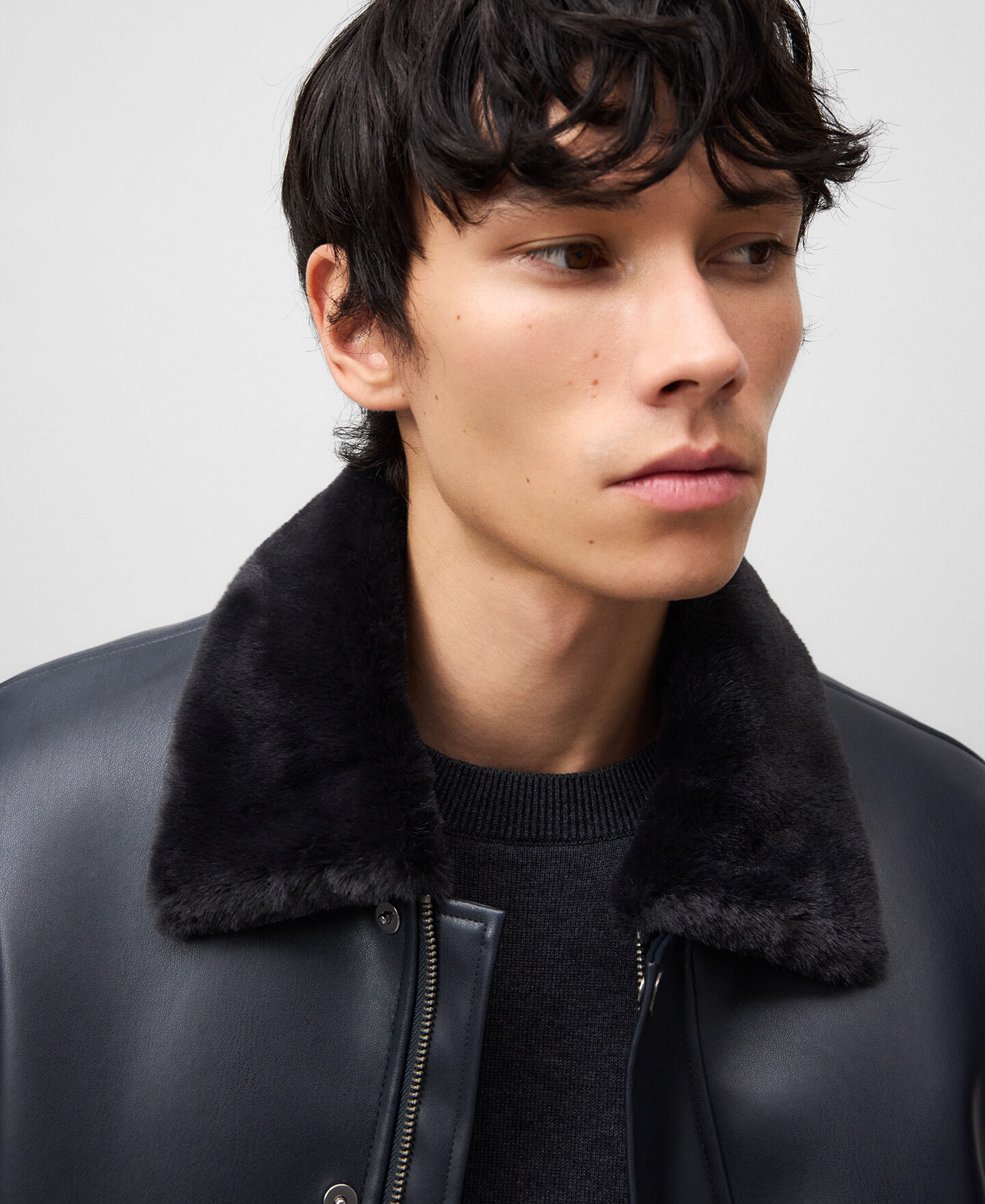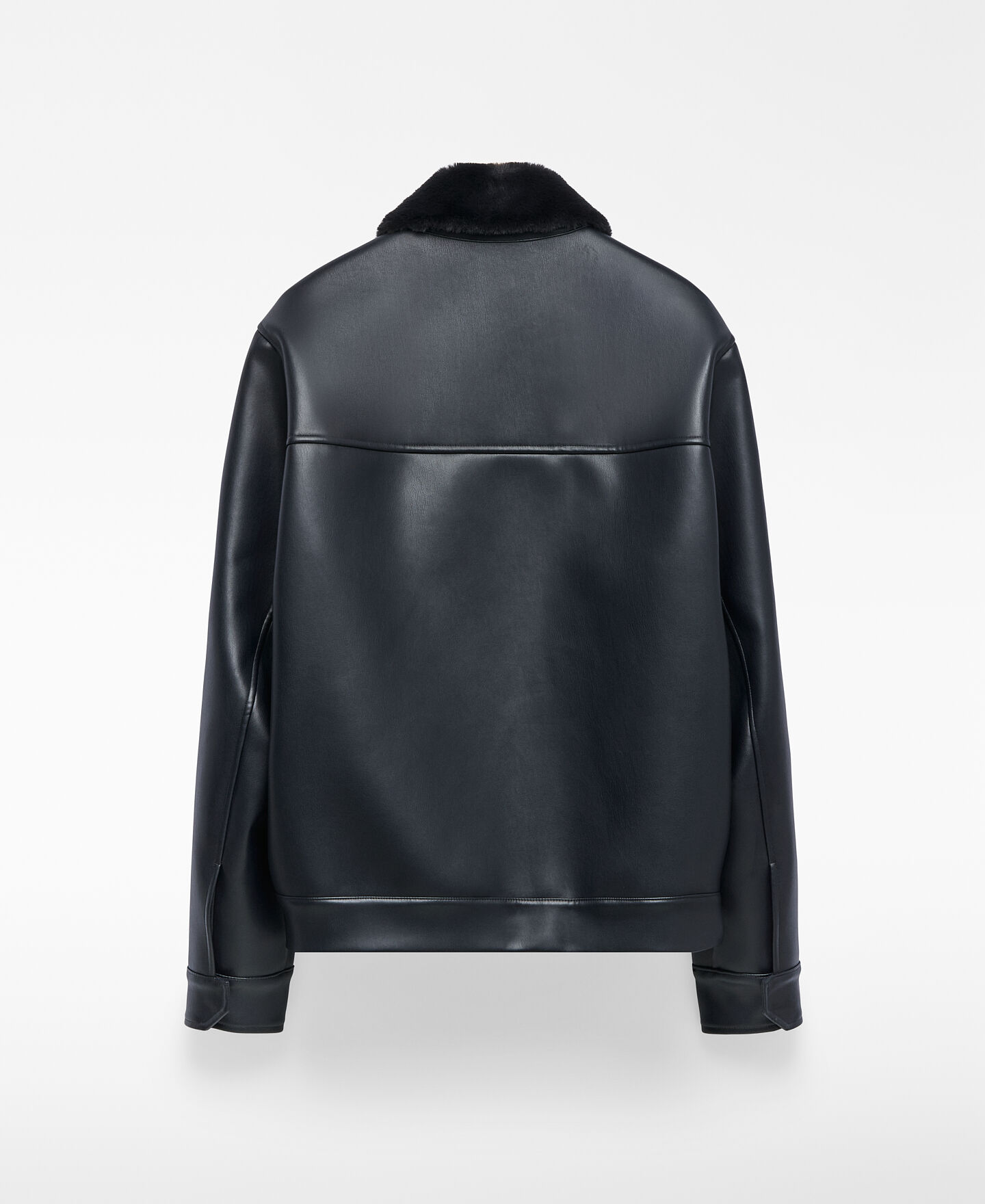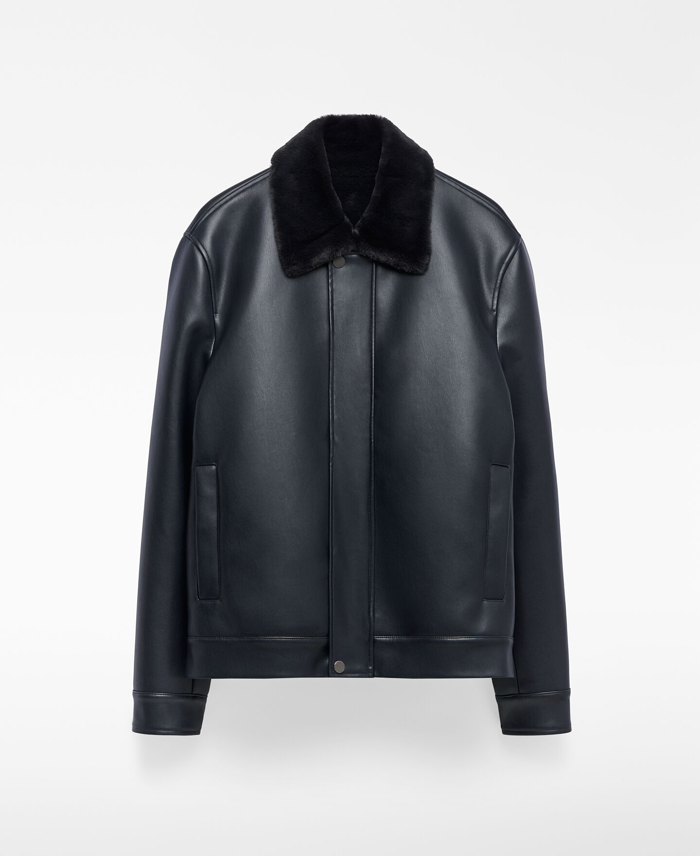 Chaqueta aviador Piel No Piel hombre. Interior en pelo. Cuello solapa en pelo. Manga larga. Cierre frontal oculto por sopata. Bolsillos de vivo inclinados en delantero. Canesú en espalda.