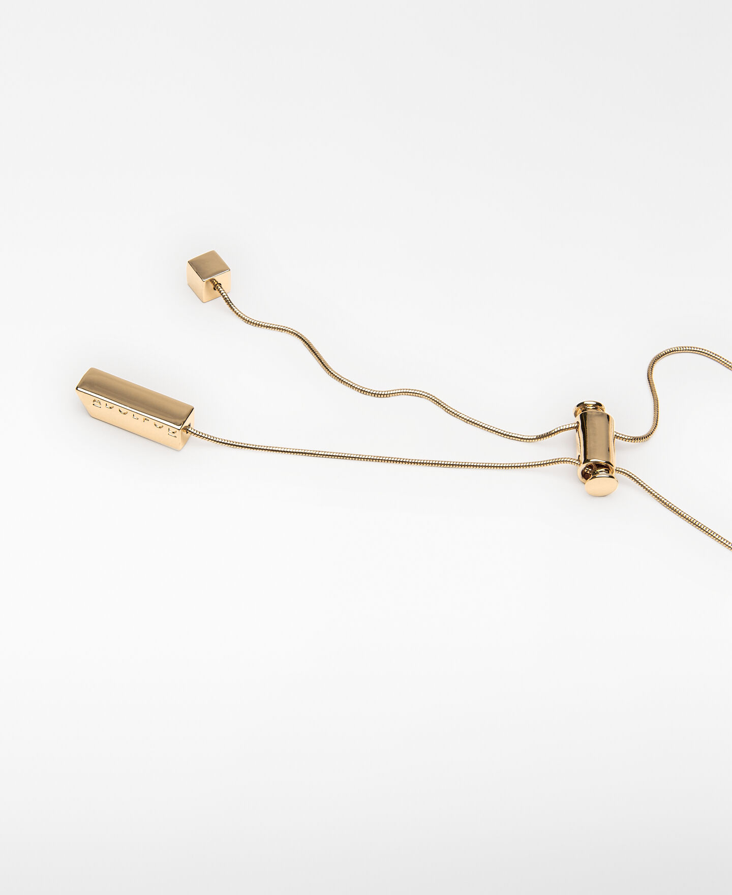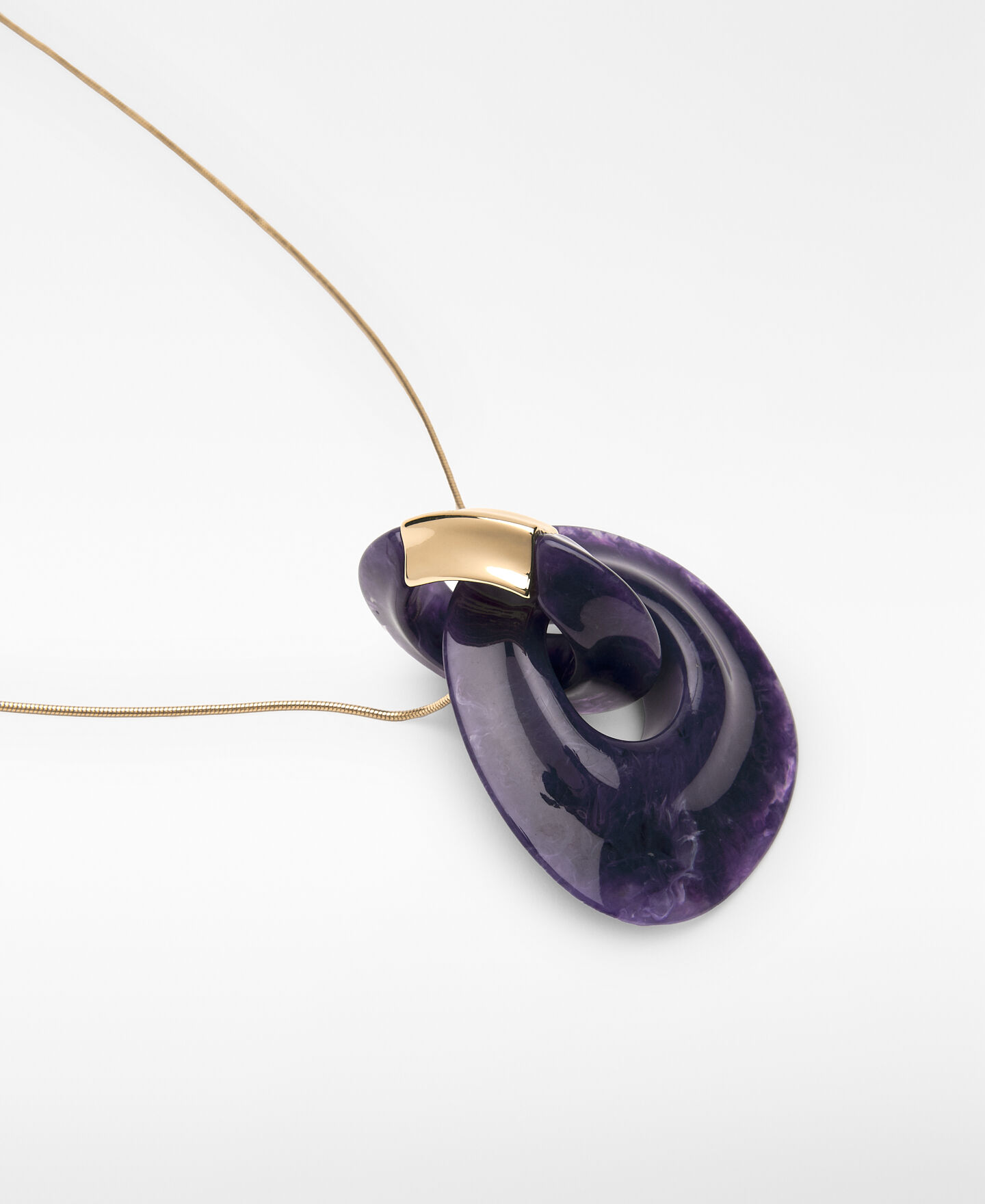 Collar mujer. Aros irregulares en resina y metal entrelazados. Cadena metálica largo regulable. Acabado dorado. Terminales logotipados.