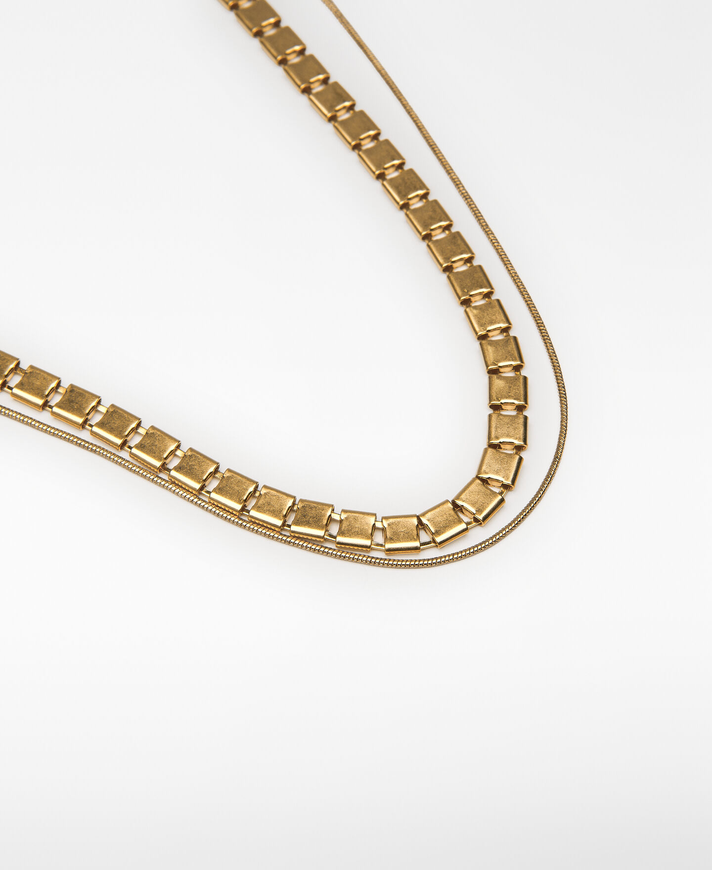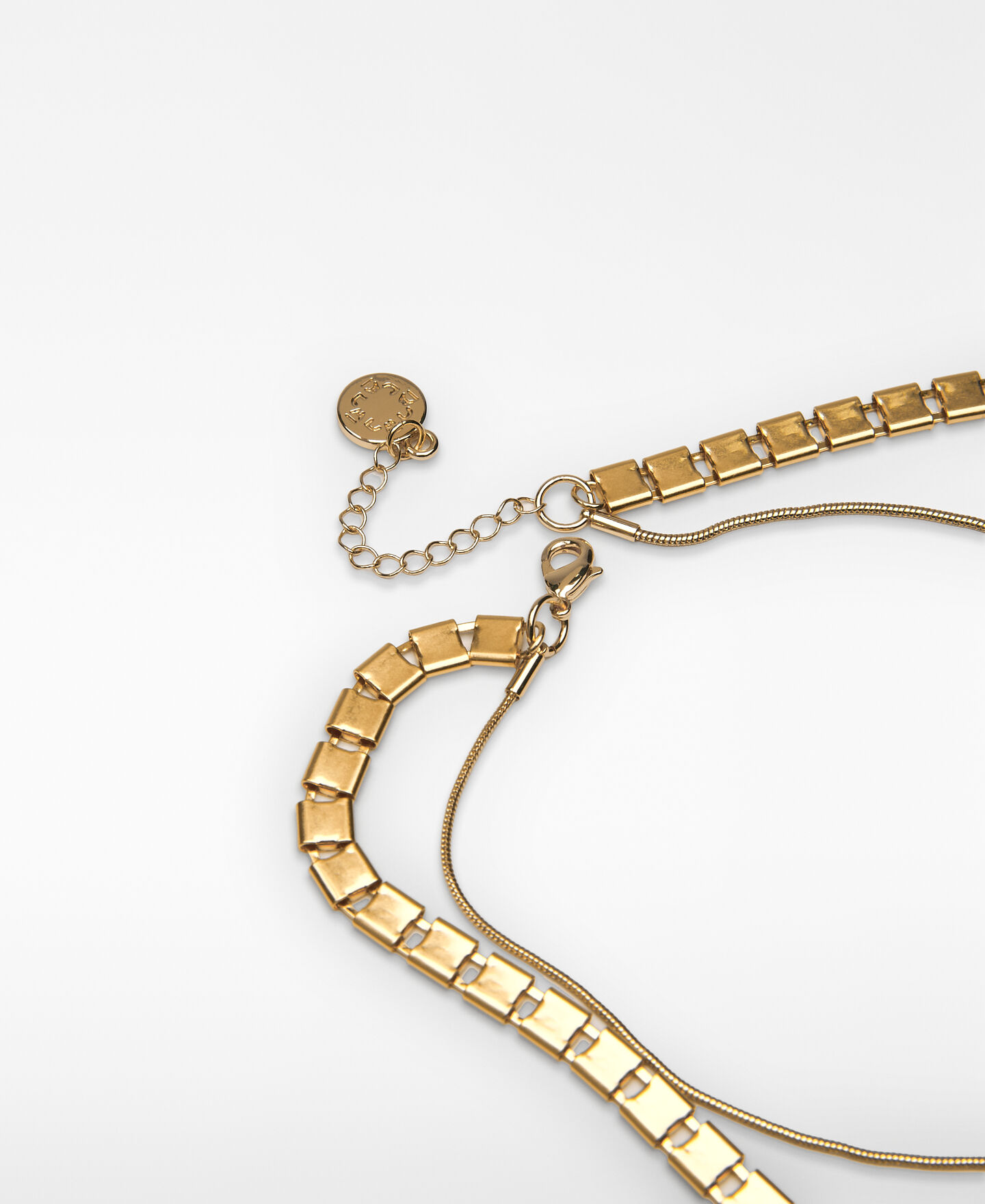 Collar metálico doble cadena mujer. Acabado dorado. Largo regulable. Cierre mosquetón. Terminal logotipado.