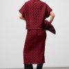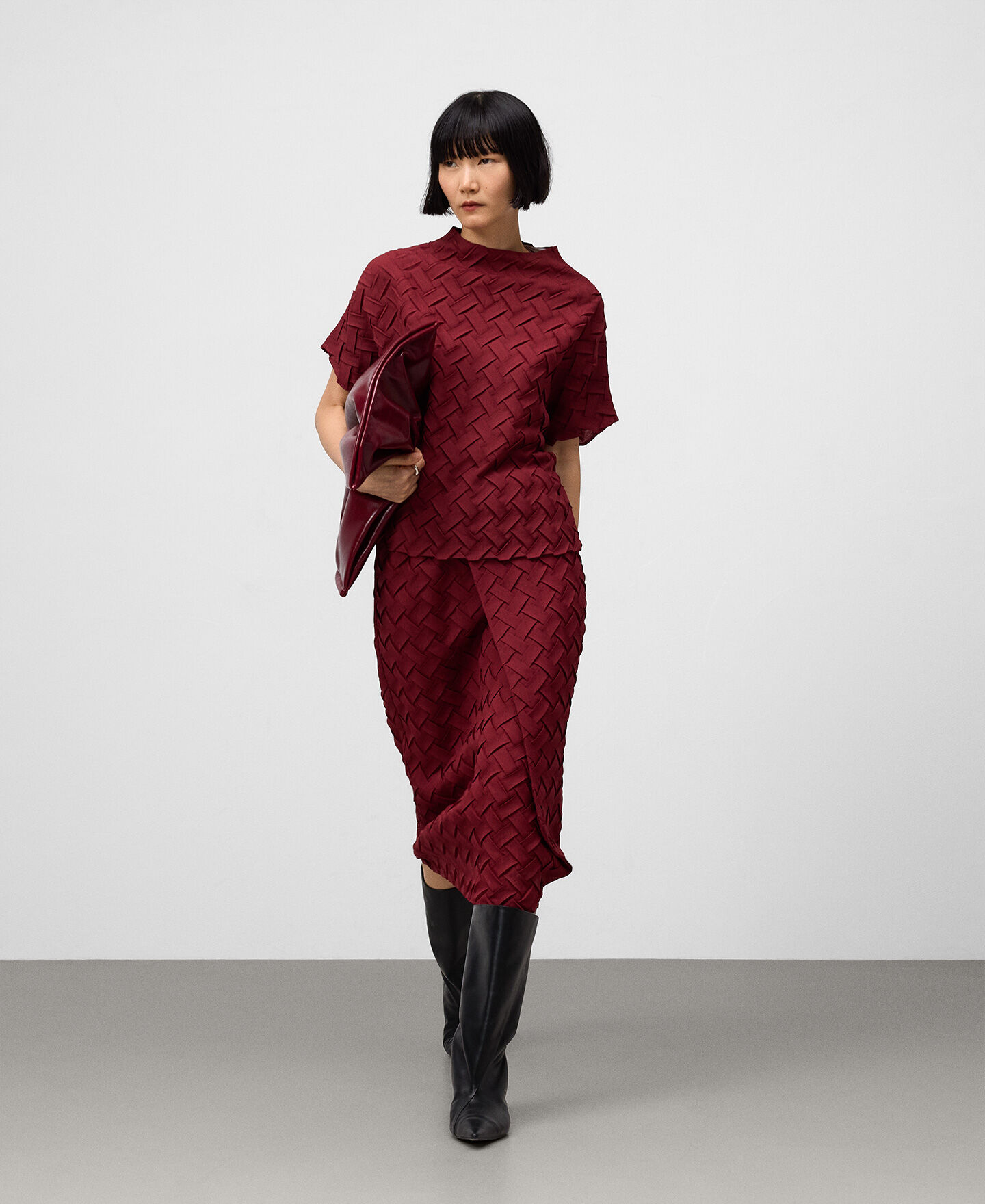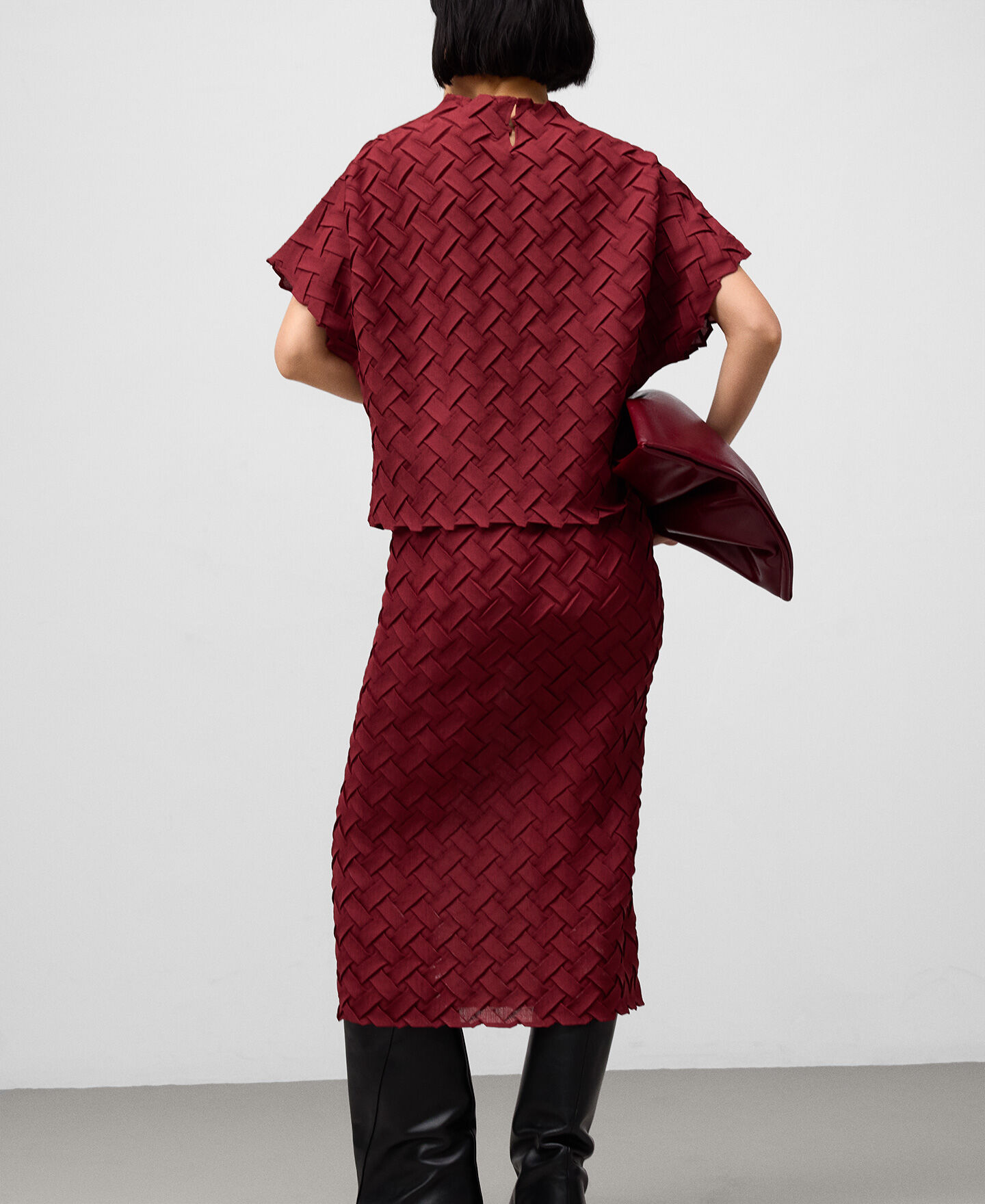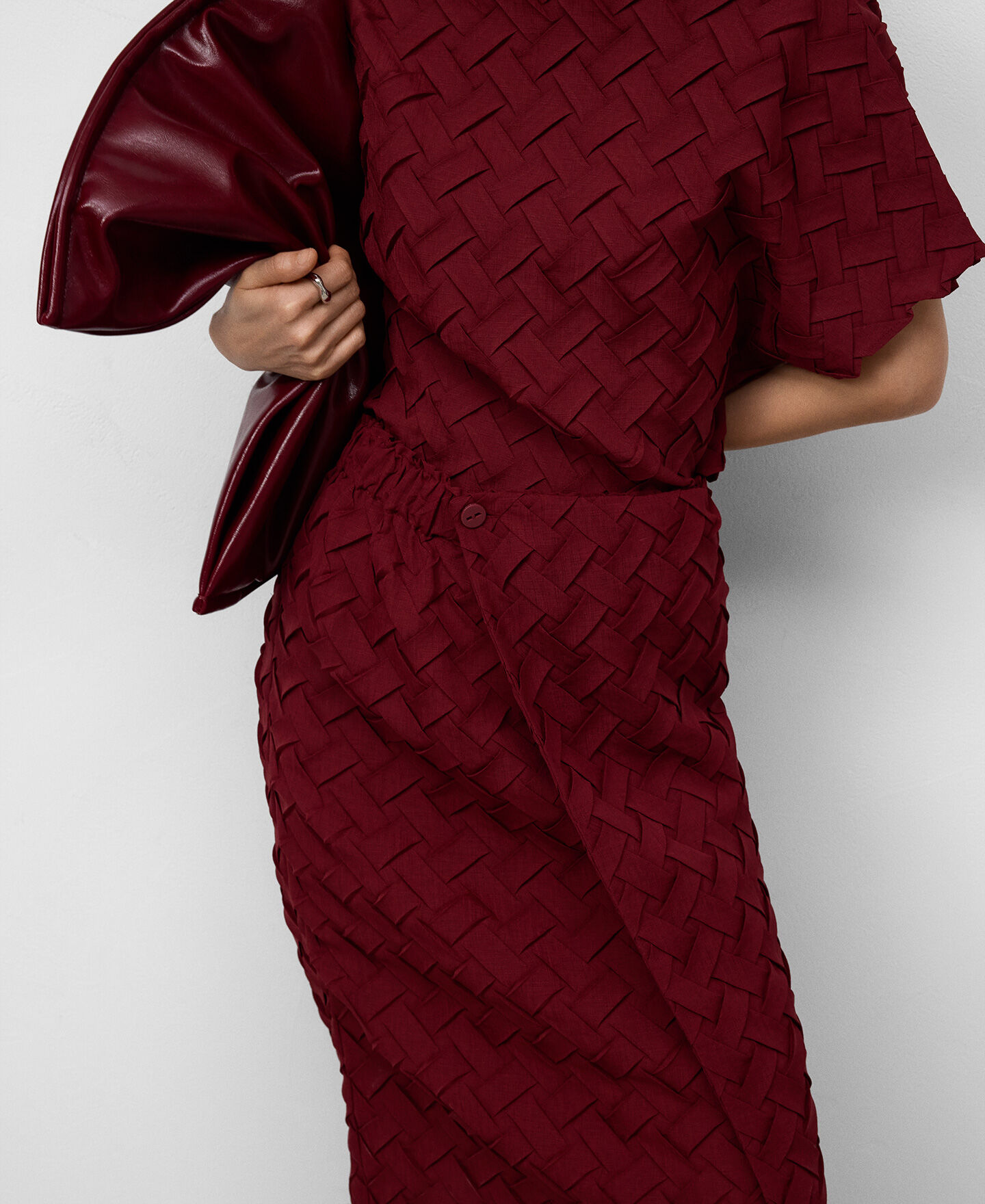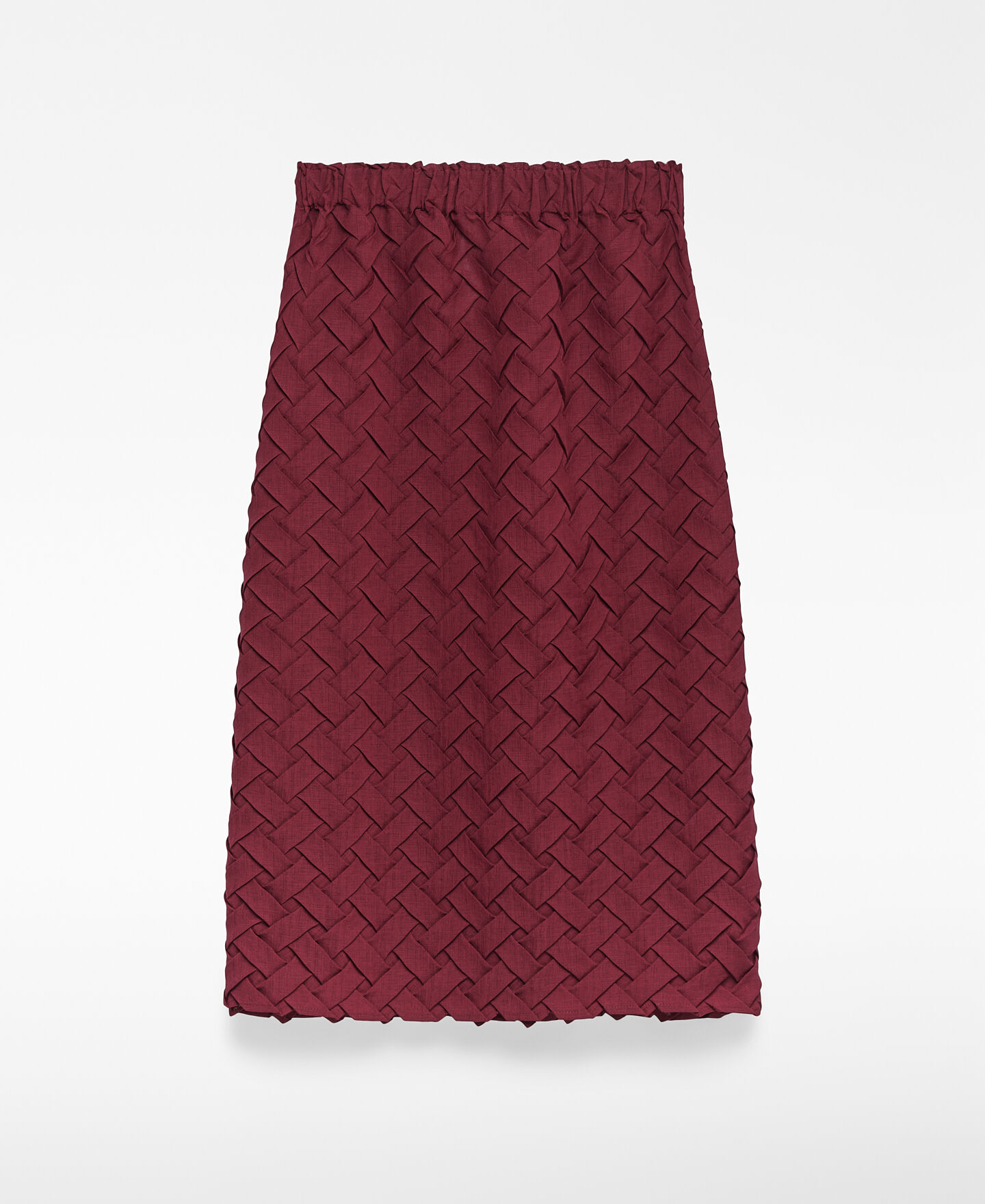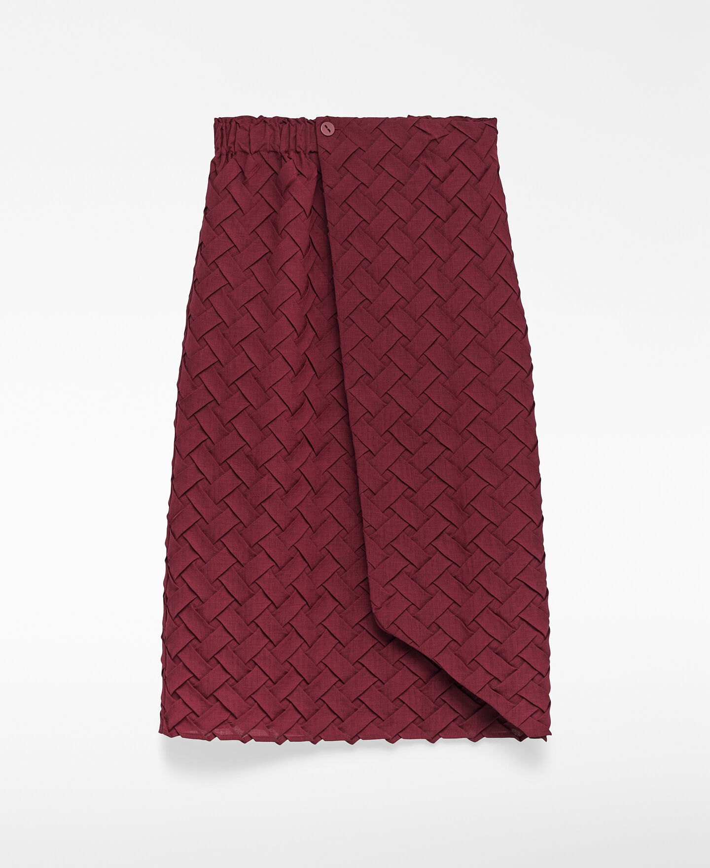 Falda tejido trenzado poliéster reciclado mujer. Cinturilla elástica. Delantero cruzado con cierre botón. Largo midi.