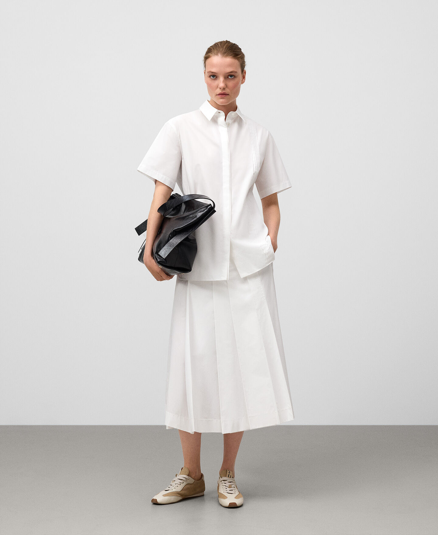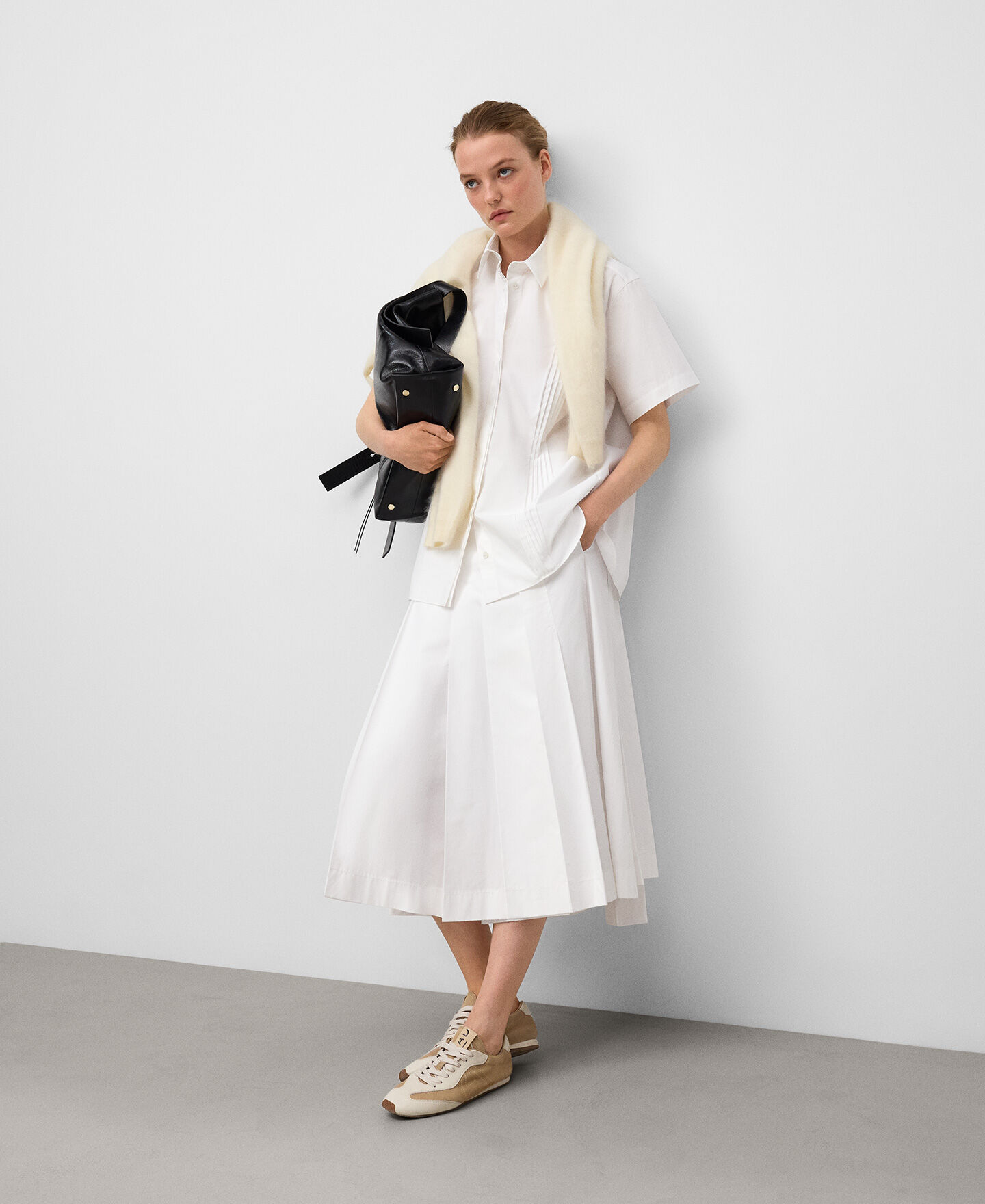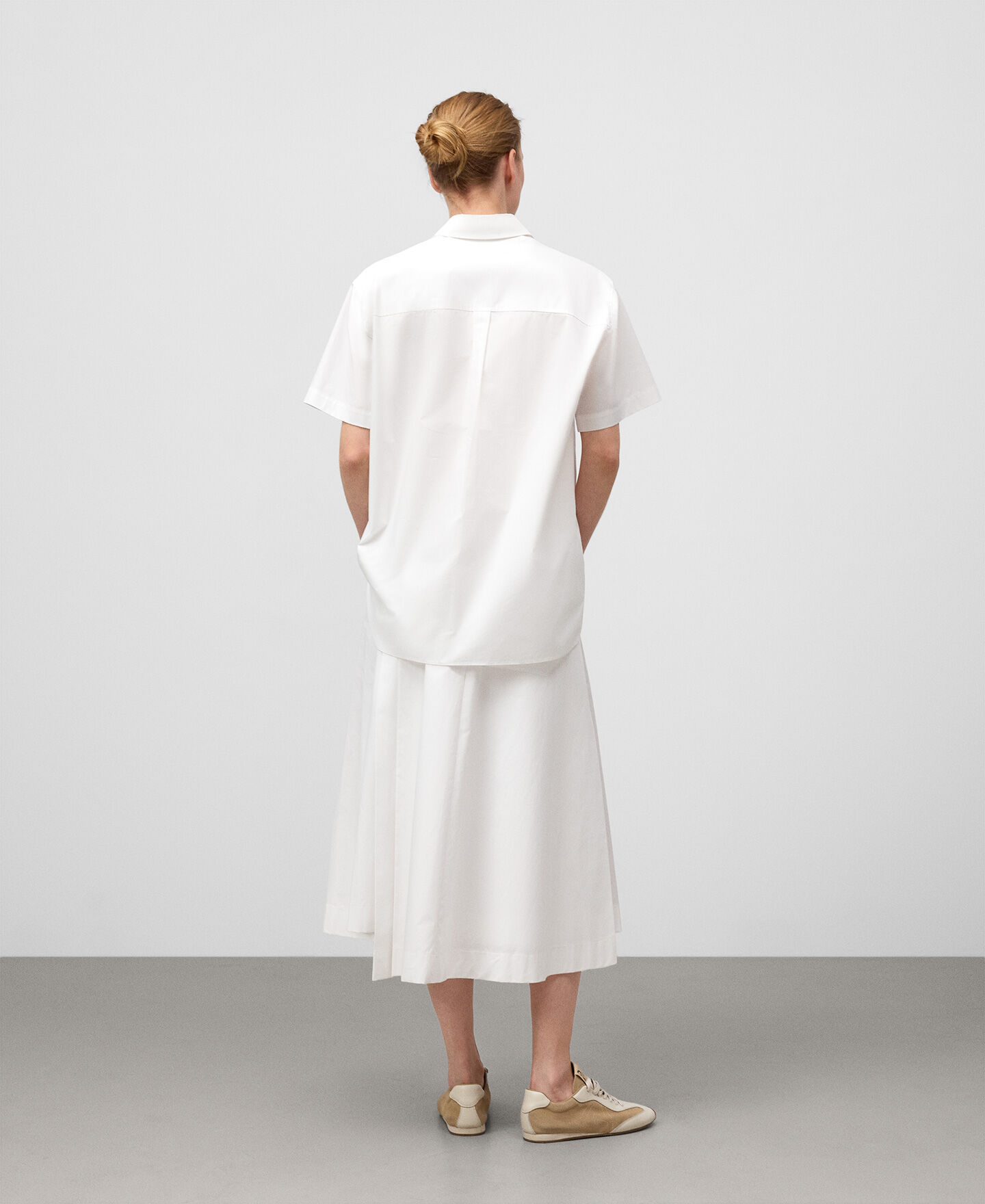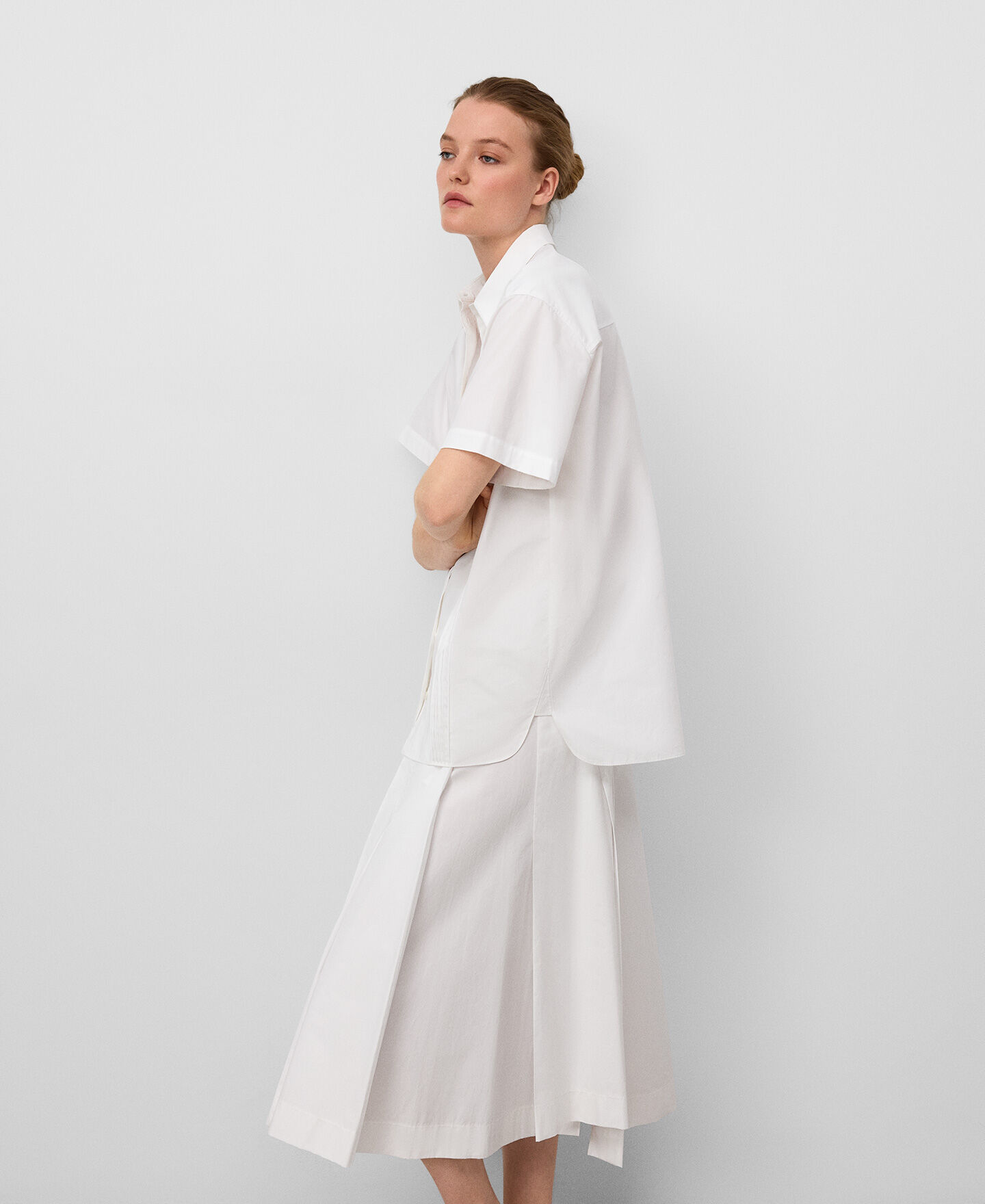 Falda plisada algodón orgánico mujer. Cierre cremallera en espalda. Bolsillo de plastrón en espalda. Bajo asimétrico.