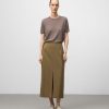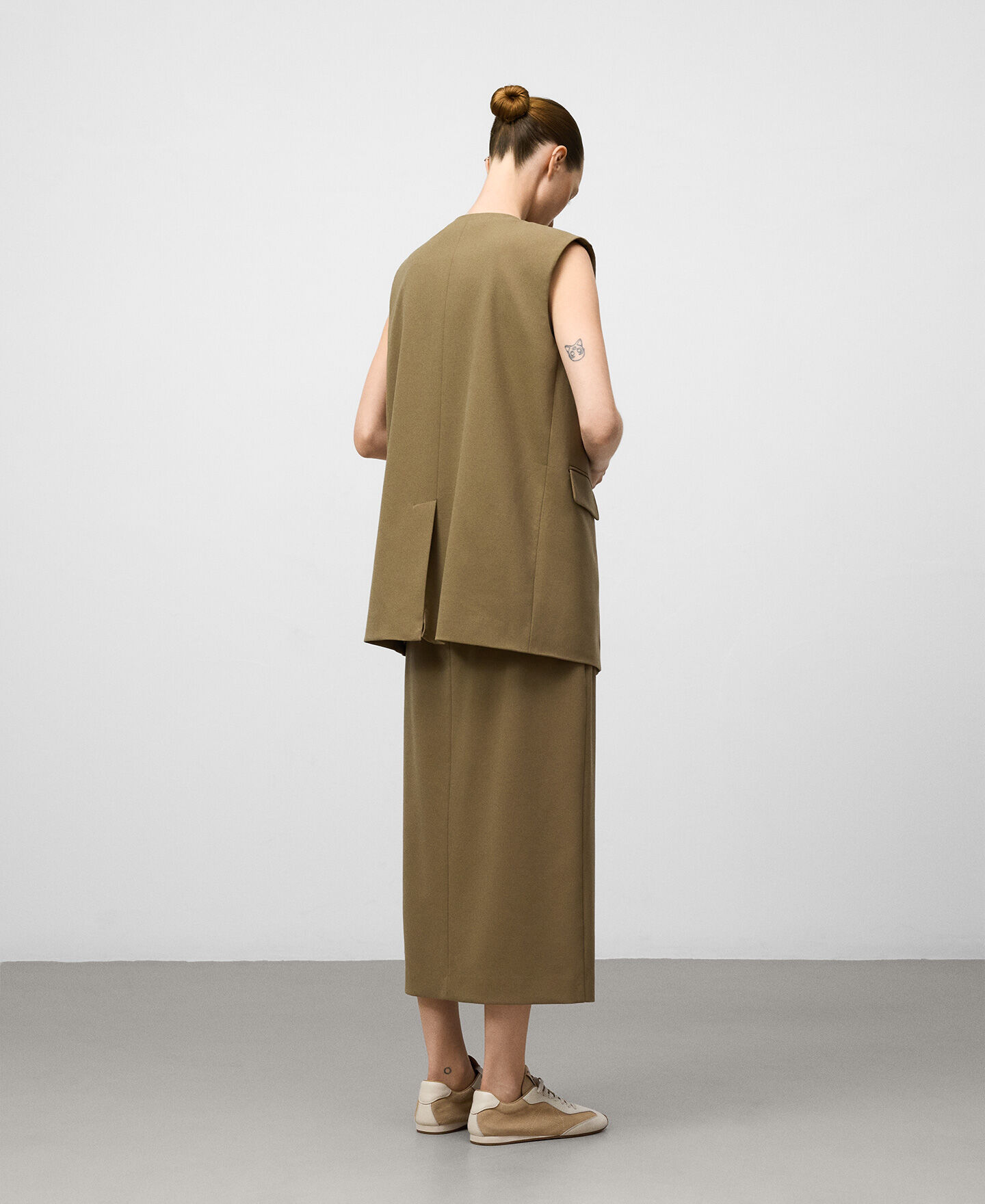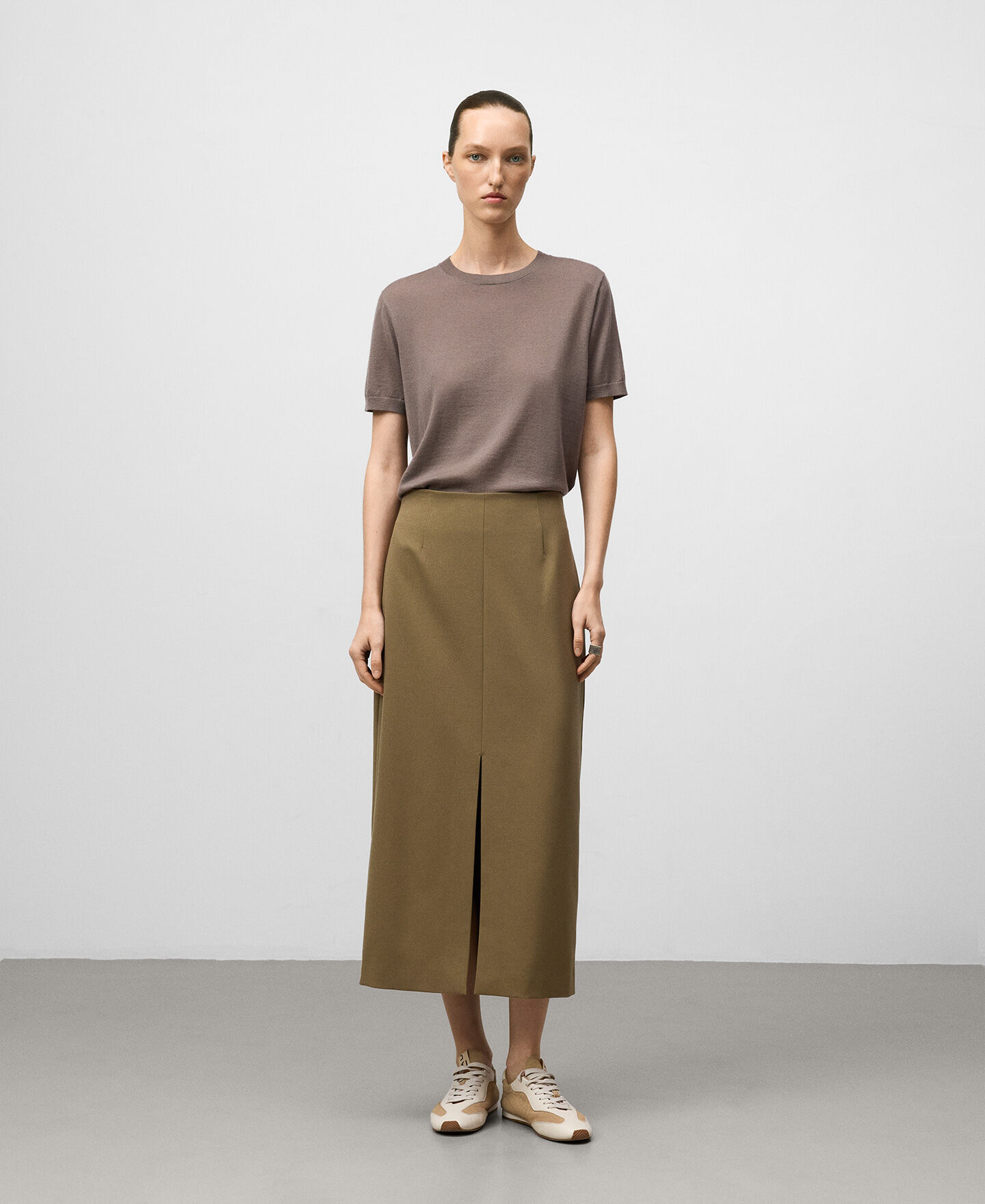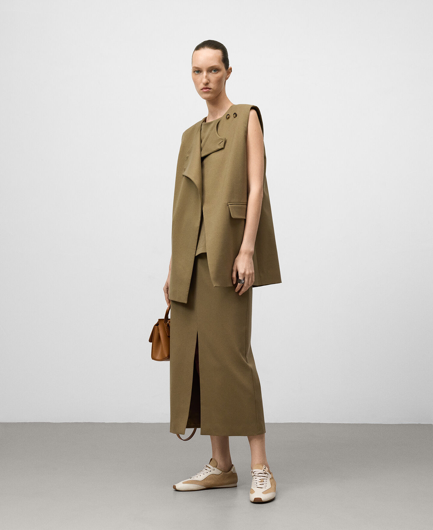 Falda sastre recta mujer. Pinzas en delantero y espalda. Abertura central en delantero. Cierre cremallera en espalda. Largo midi.