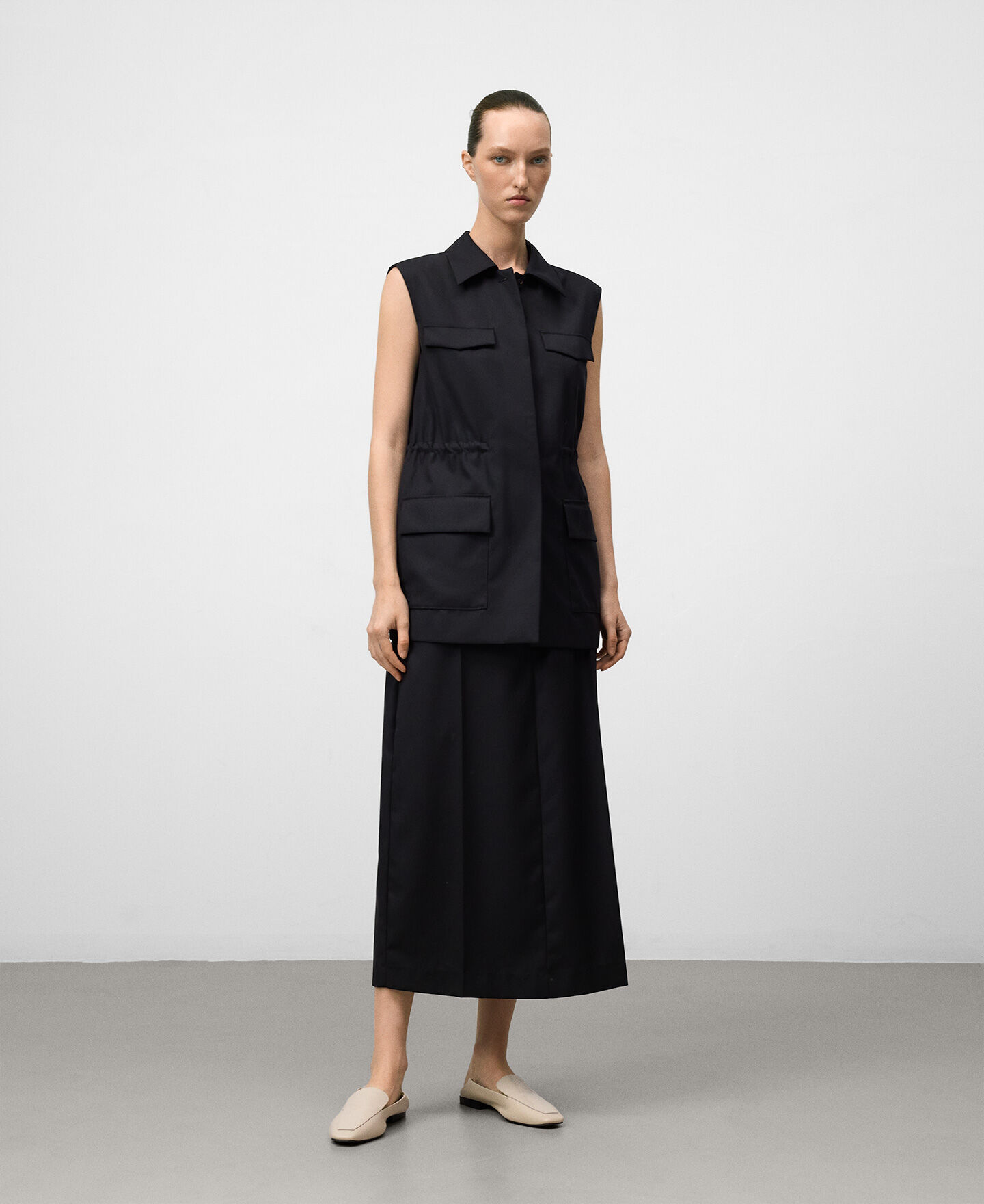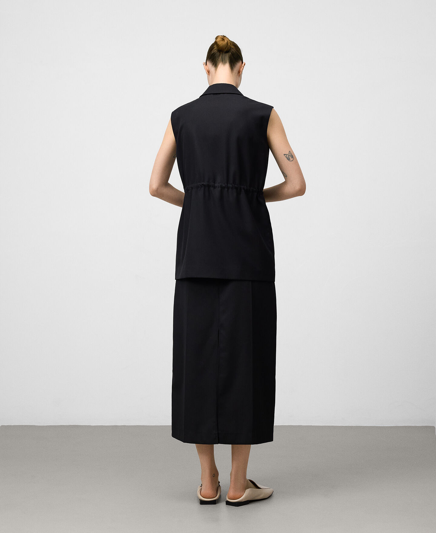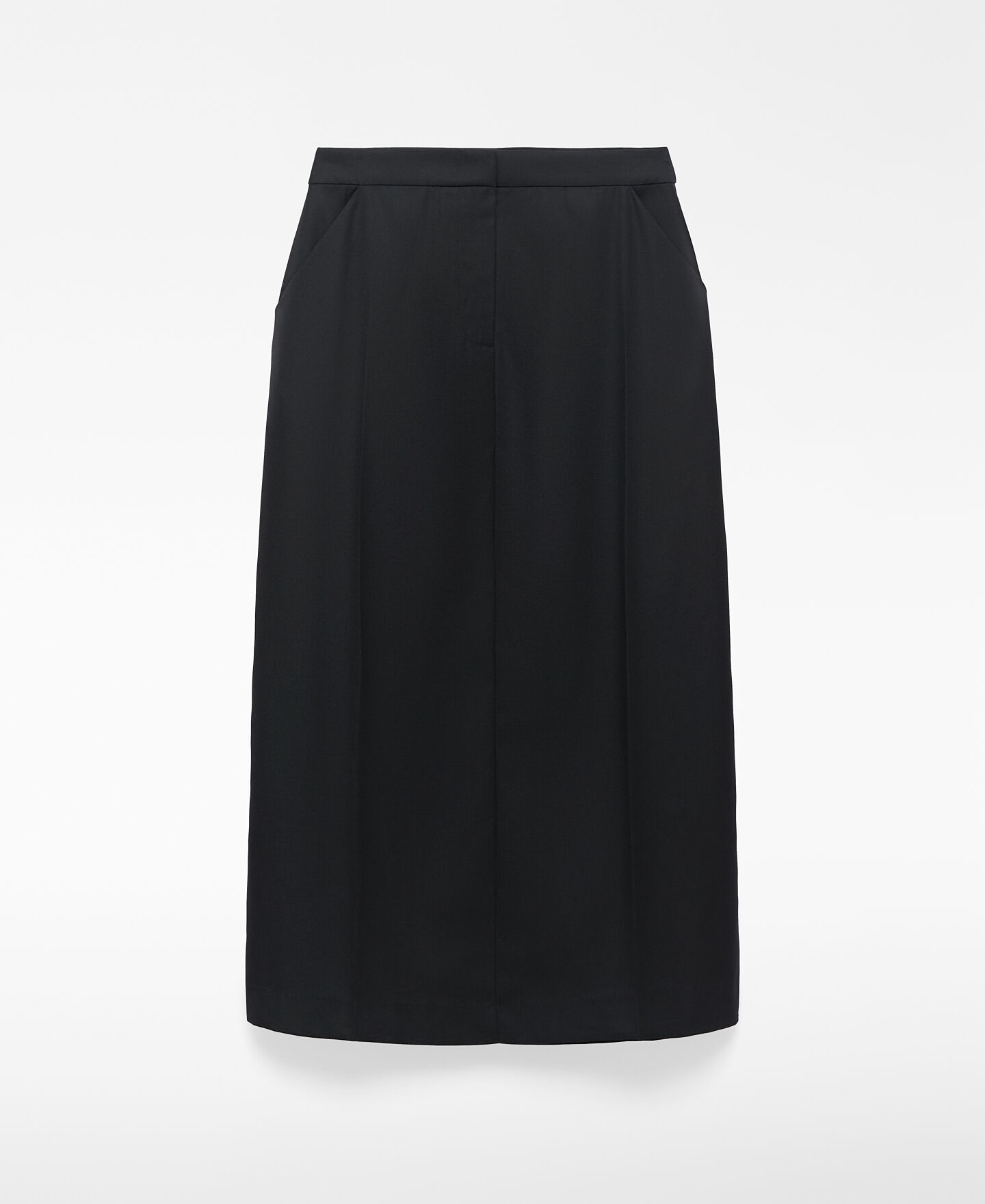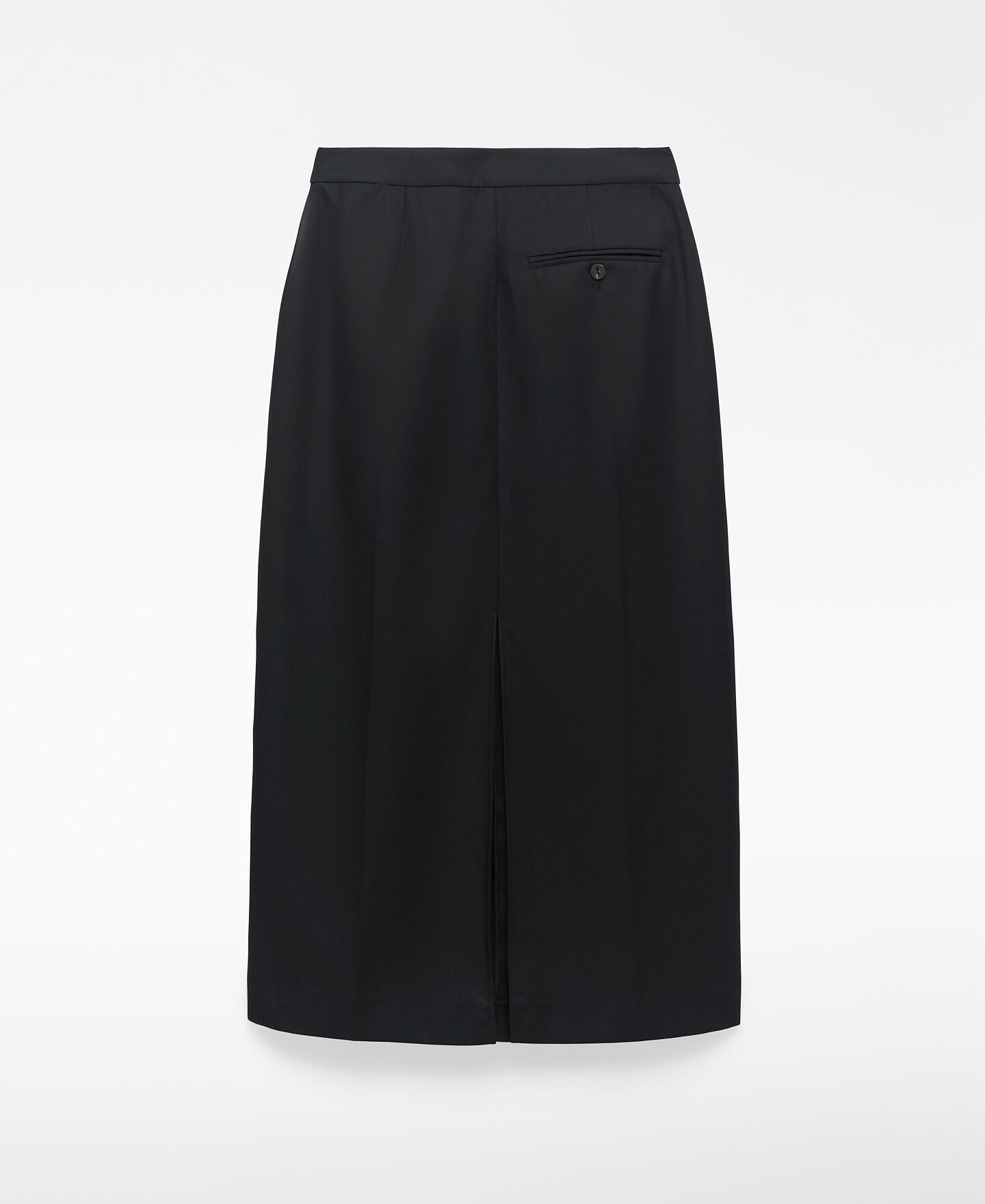 Falta tubo sastre mujer. Cinturilla. Raya de plancha en delantero. Bolsillos laterales. Bolsillo de vivo con botón en espalda. Abertura central en espalda. Largo midi.