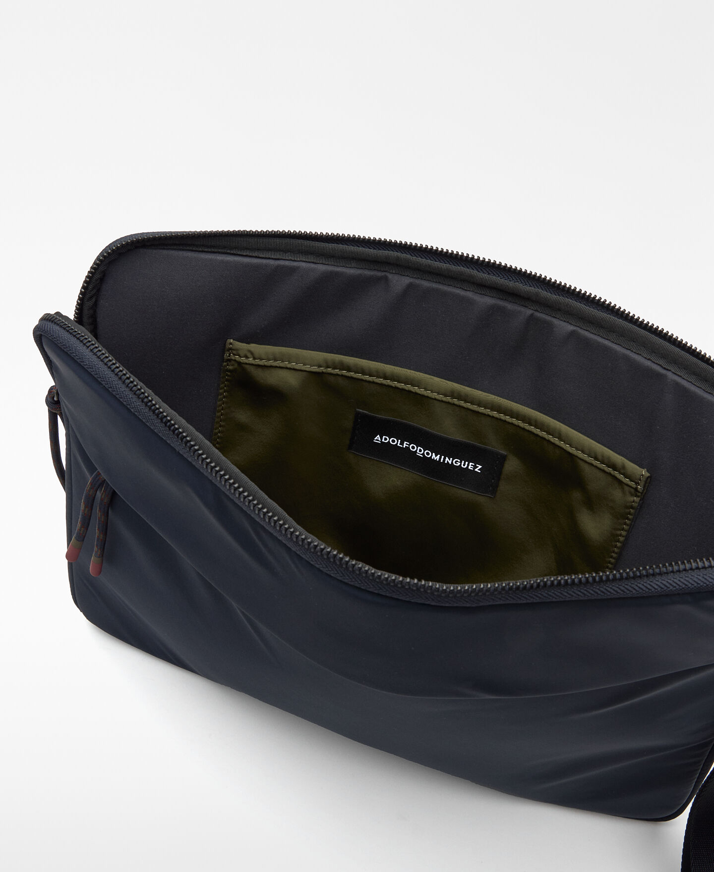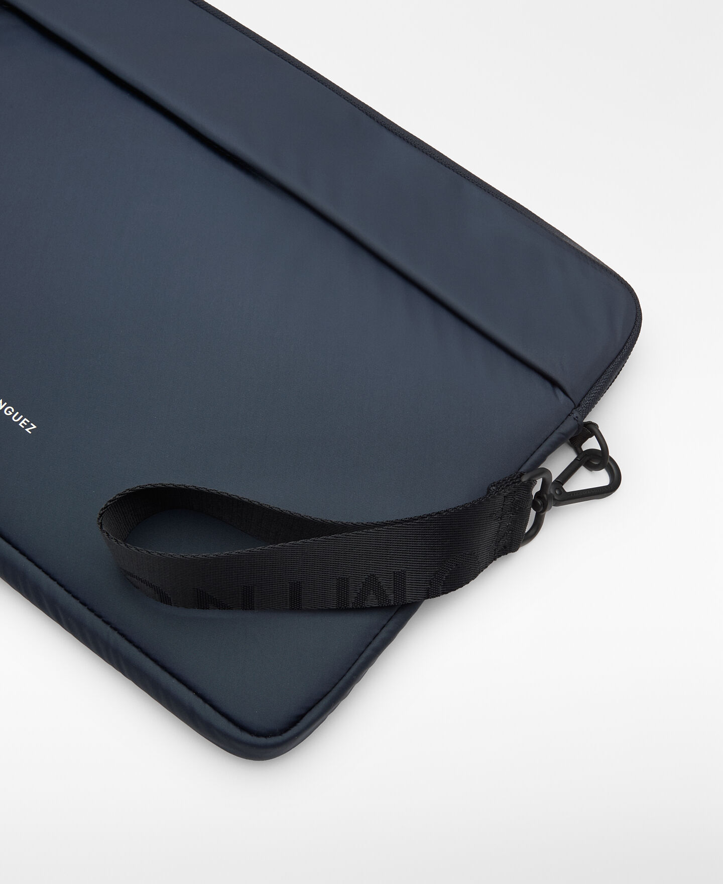 Funda portátil nailon poliéster reciclado hombre. Tamaño 13 pulgadas. Un compartimento. Cierre cremallera de doble cursor con cordón tirador. Remates engomados. Bolsillo interior a contraste. Bolsillo exterior con cierre cremallera en delantero. Asa muñequera extraíble en lateral. Logo grabado.