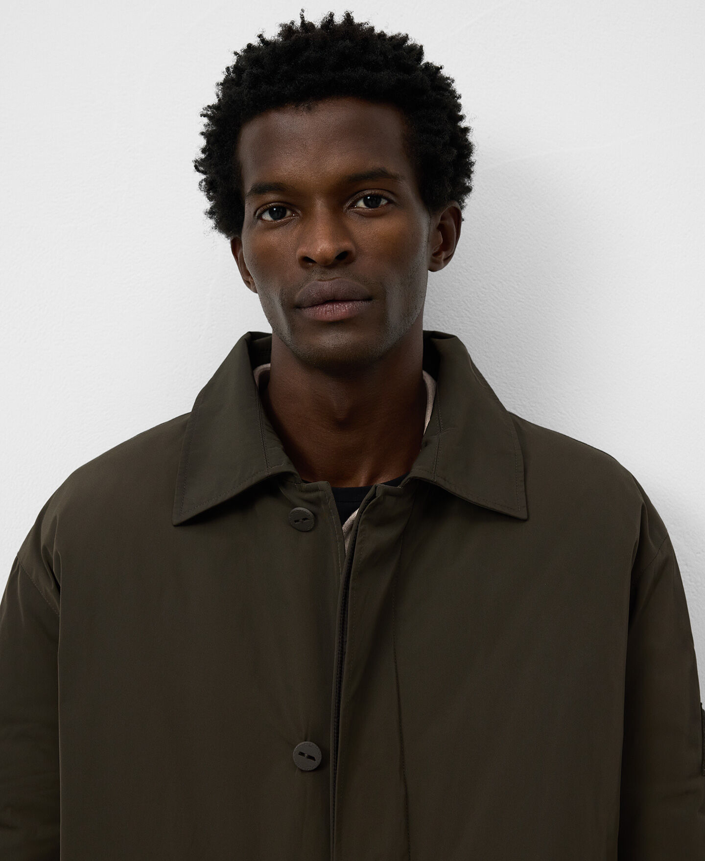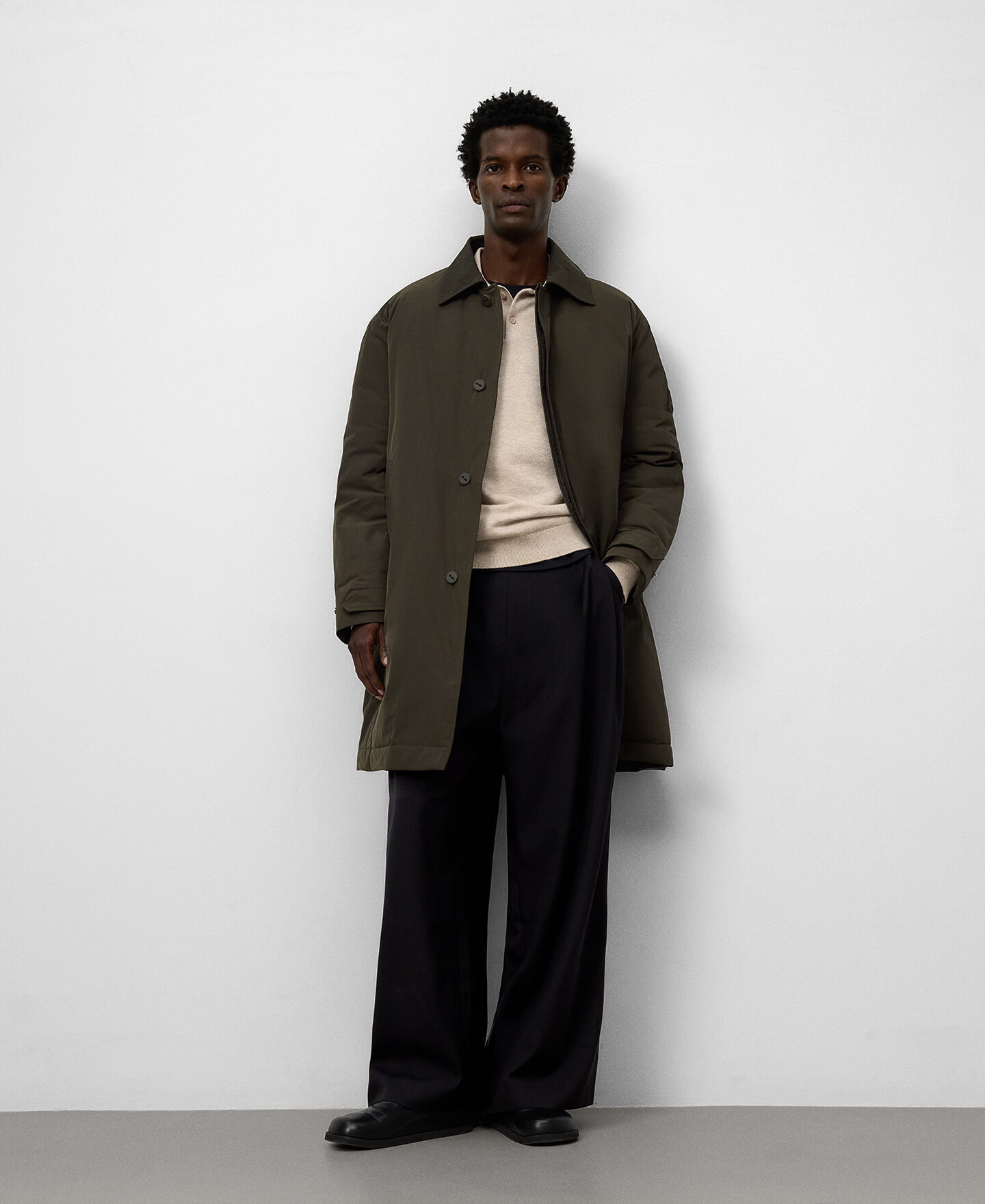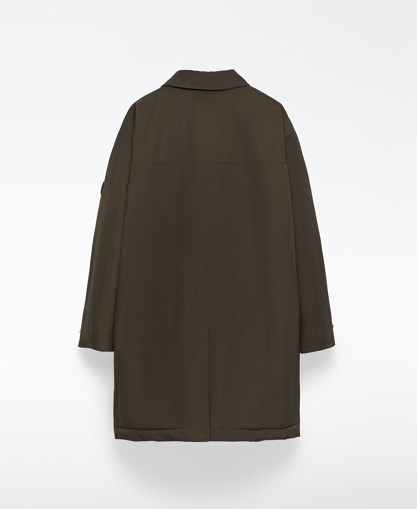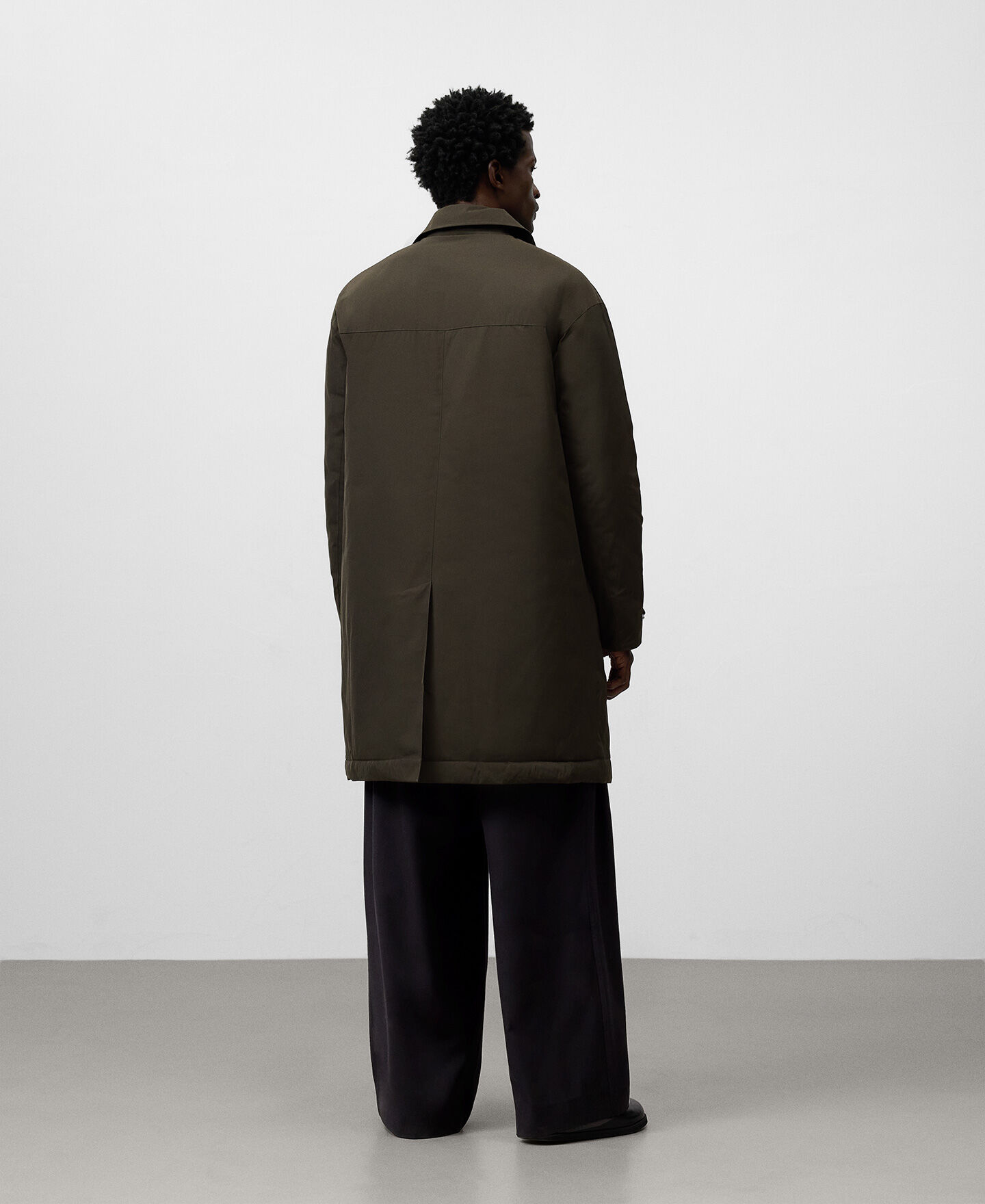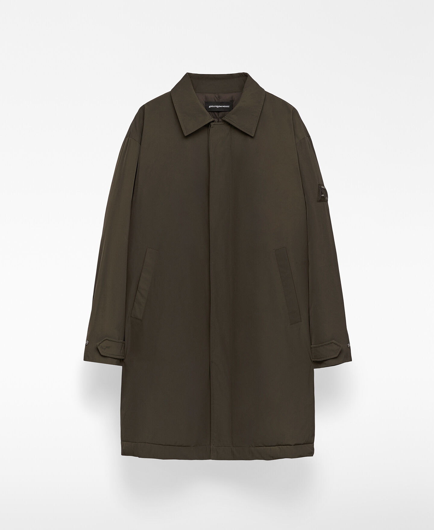 Gabardina acolchada hombre. Cuello solapa. Maga larga. Trabilla en puño. Cierre en delantero oculto por sopata. Bolsillos de vivo inclinados en delantero. Canesú en espalda. Abertura central en espalda. Parche logotipado en manga izquierda.