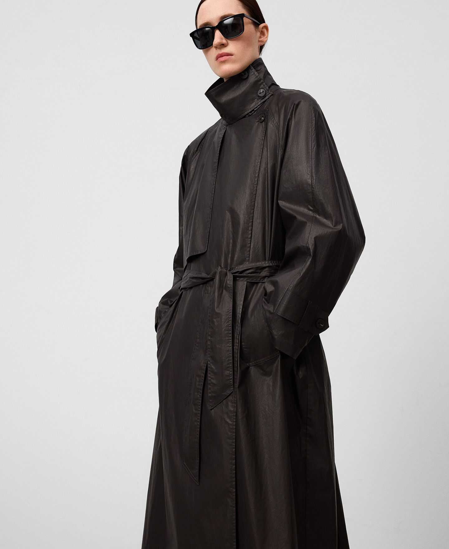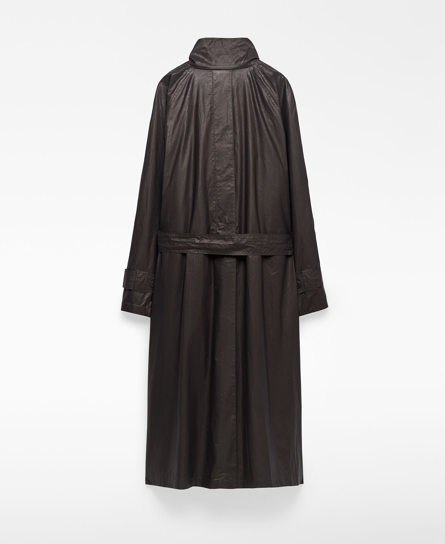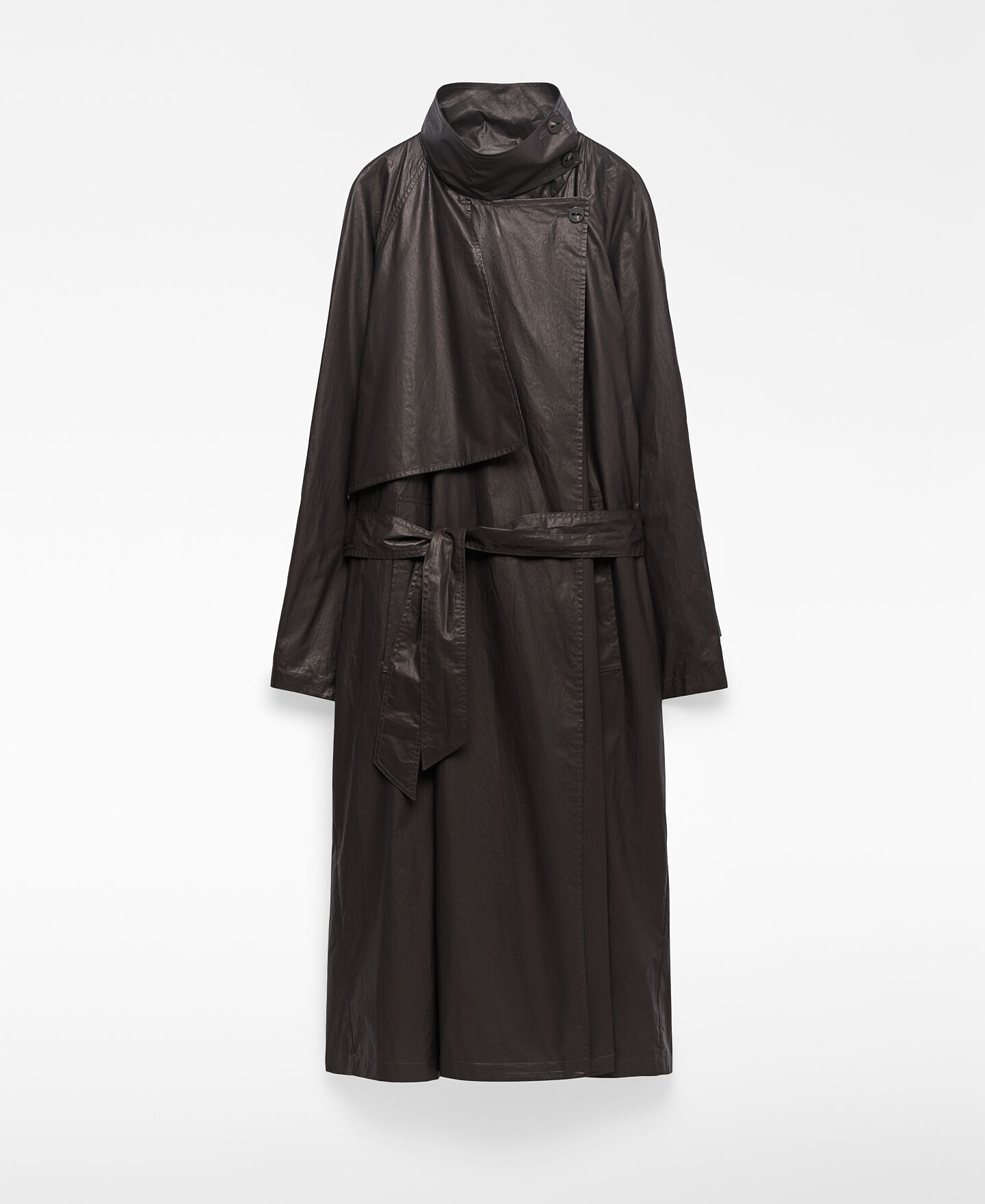 Gabardina algodón orgánico mujer. Tejido efecto encerado. Cuello solapa. Cierre cruzado. Detalle de solapa con trabilla y botón en cuello. Bolsillos laterales. Cinturón.