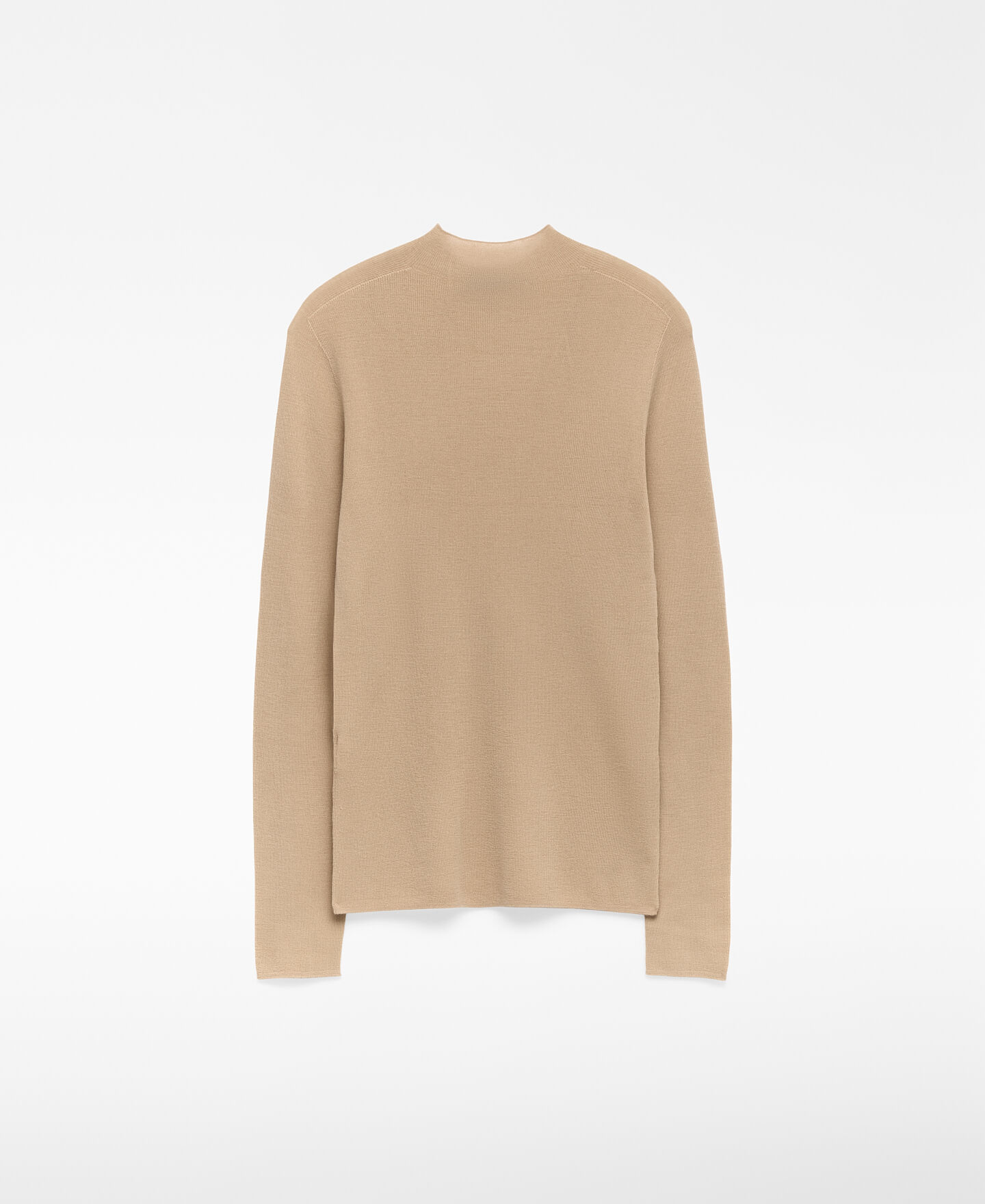 Jersey punto fino lana merino y cashmere mujer. Sin costuras. Cuello perkins. Manga larga. Bajo recto.