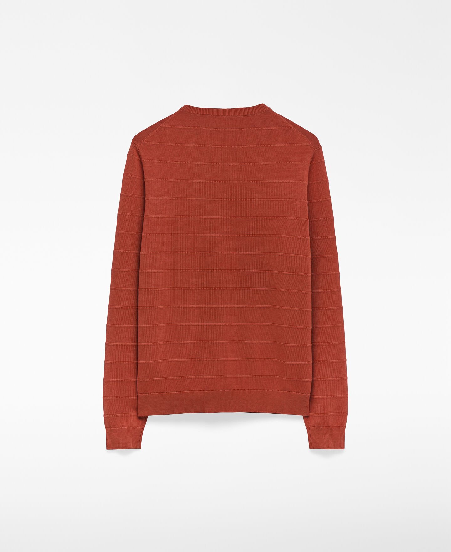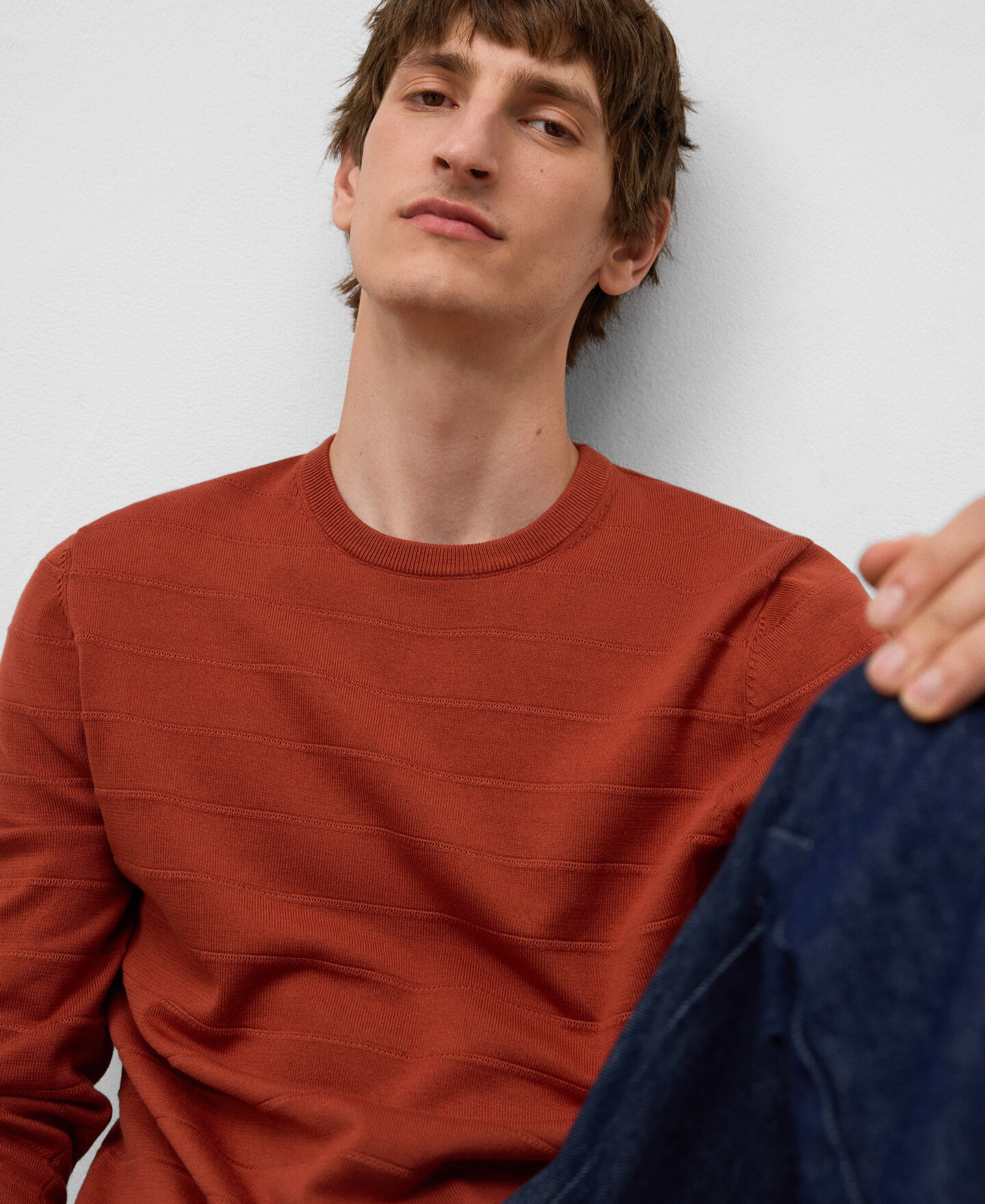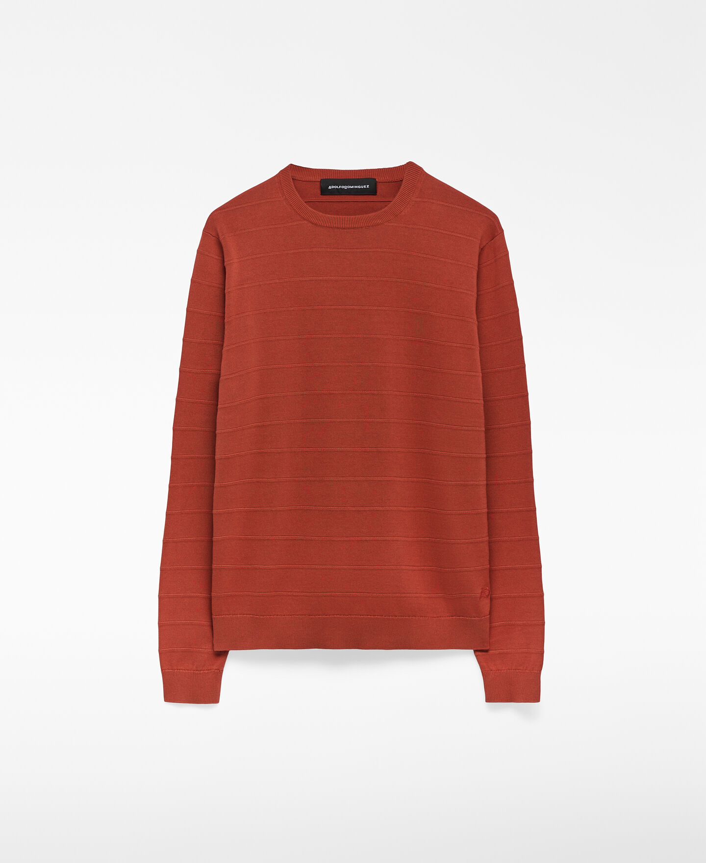 Jersey punto estructura rayas algodón orgánico hombre. Cuello caja en canalé. Manga larga. Menguado en sisa. Remates en canalé.