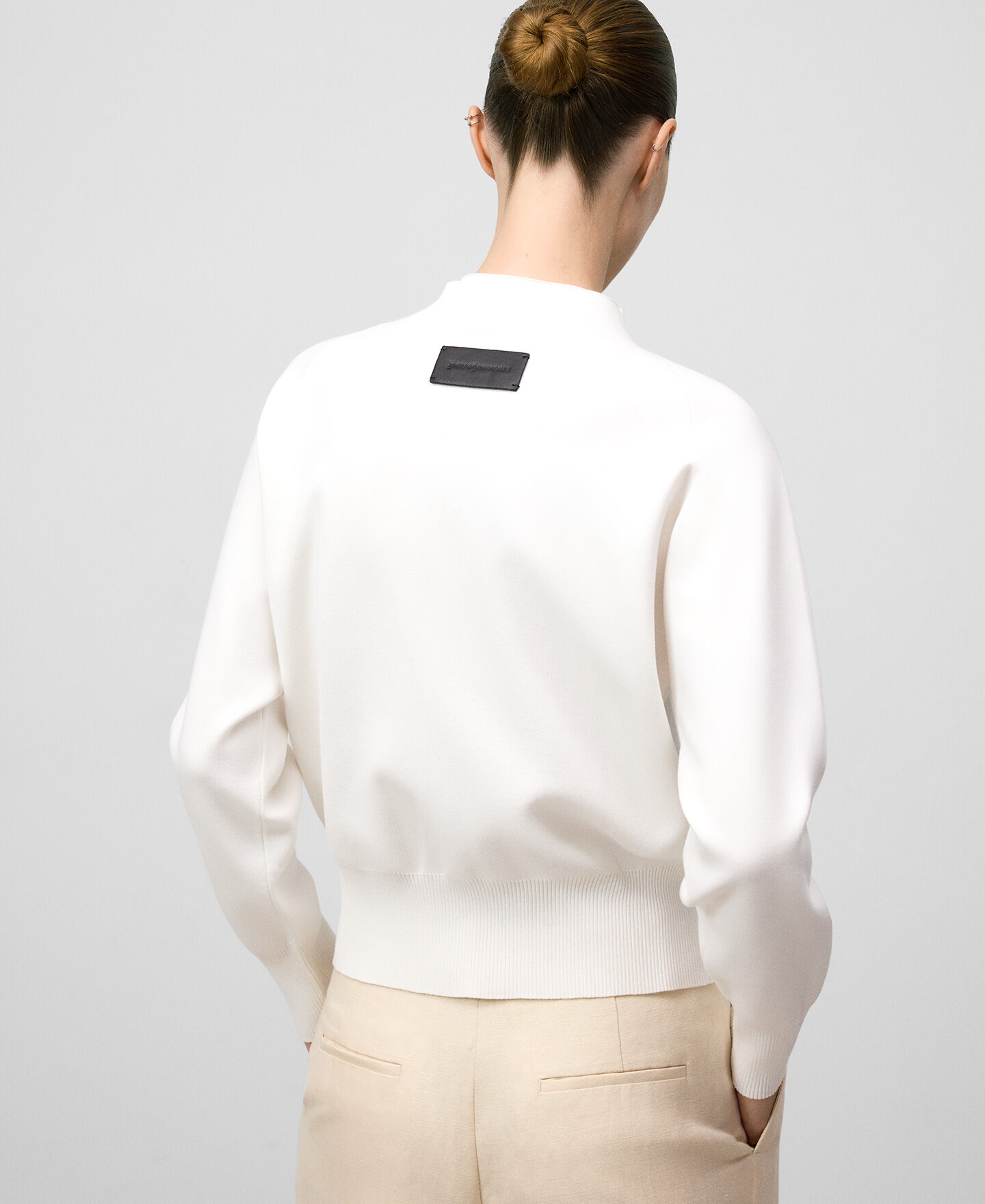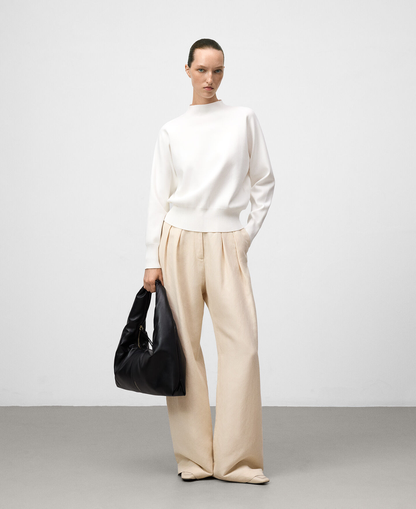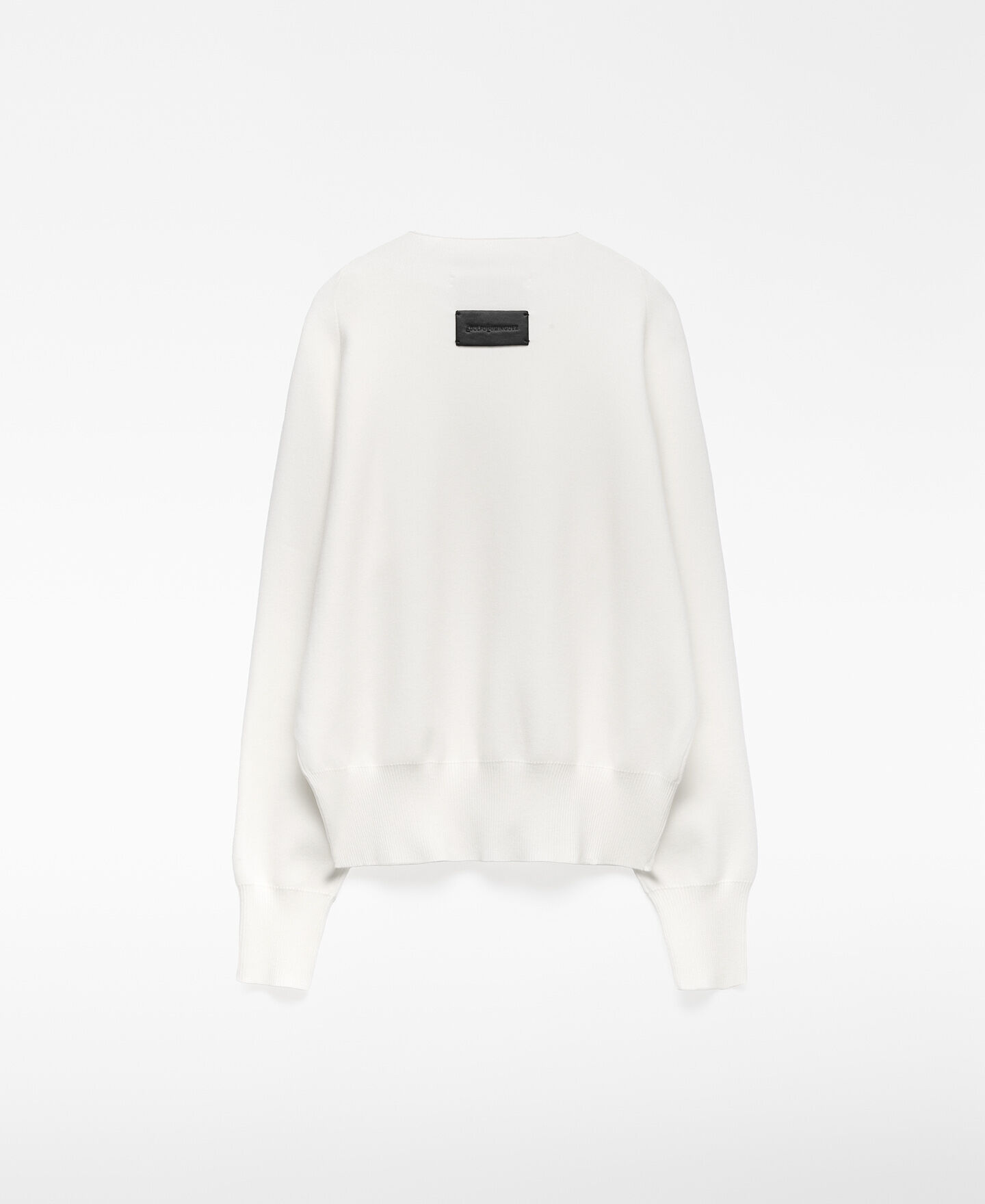 Jersey punto mujer. Volumen redondeado. Cuello caja. Manga larga con hombro caído. Costura vertical en delantero. Remates en canalé.