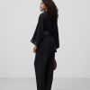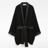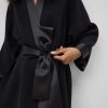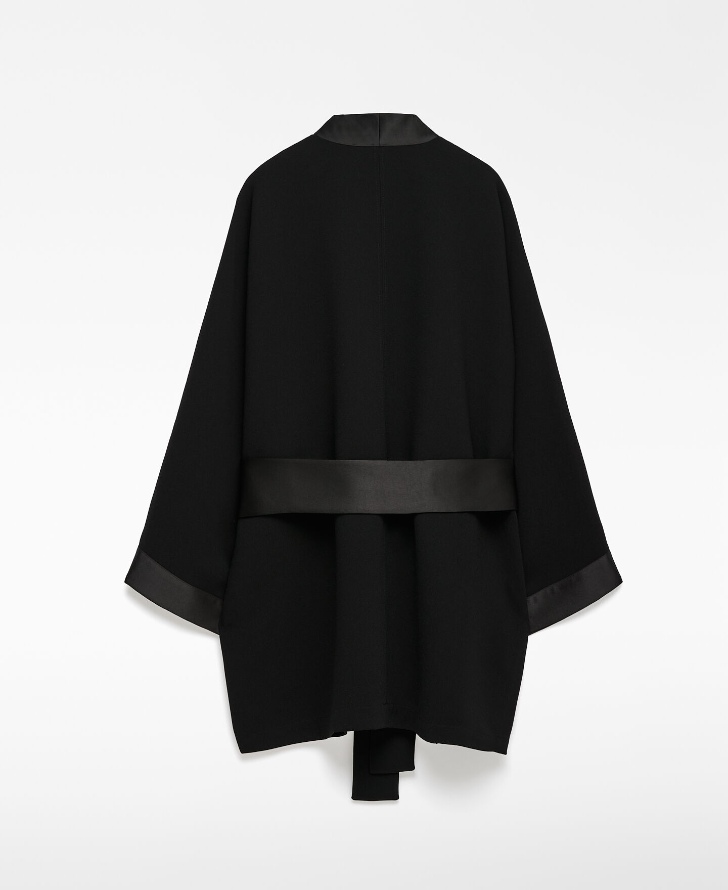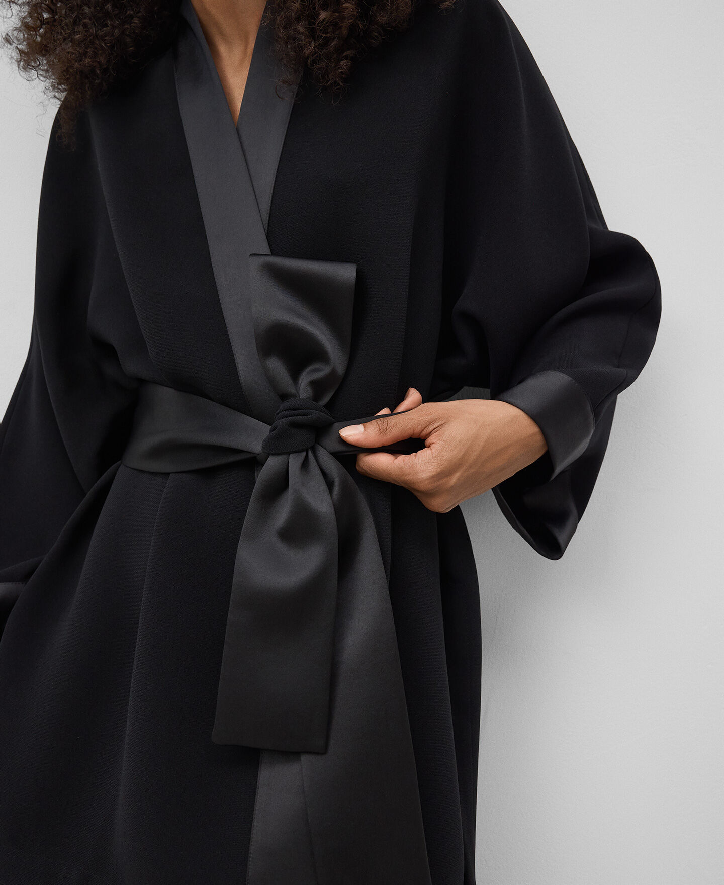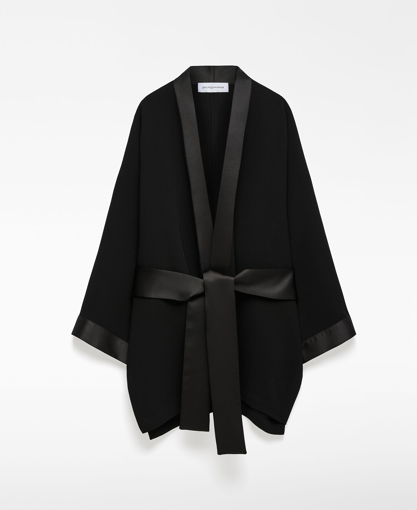 Kimono con poliéster reciclado mujer. Cuello, puño y cinturón en raso. Aberturas laterales.