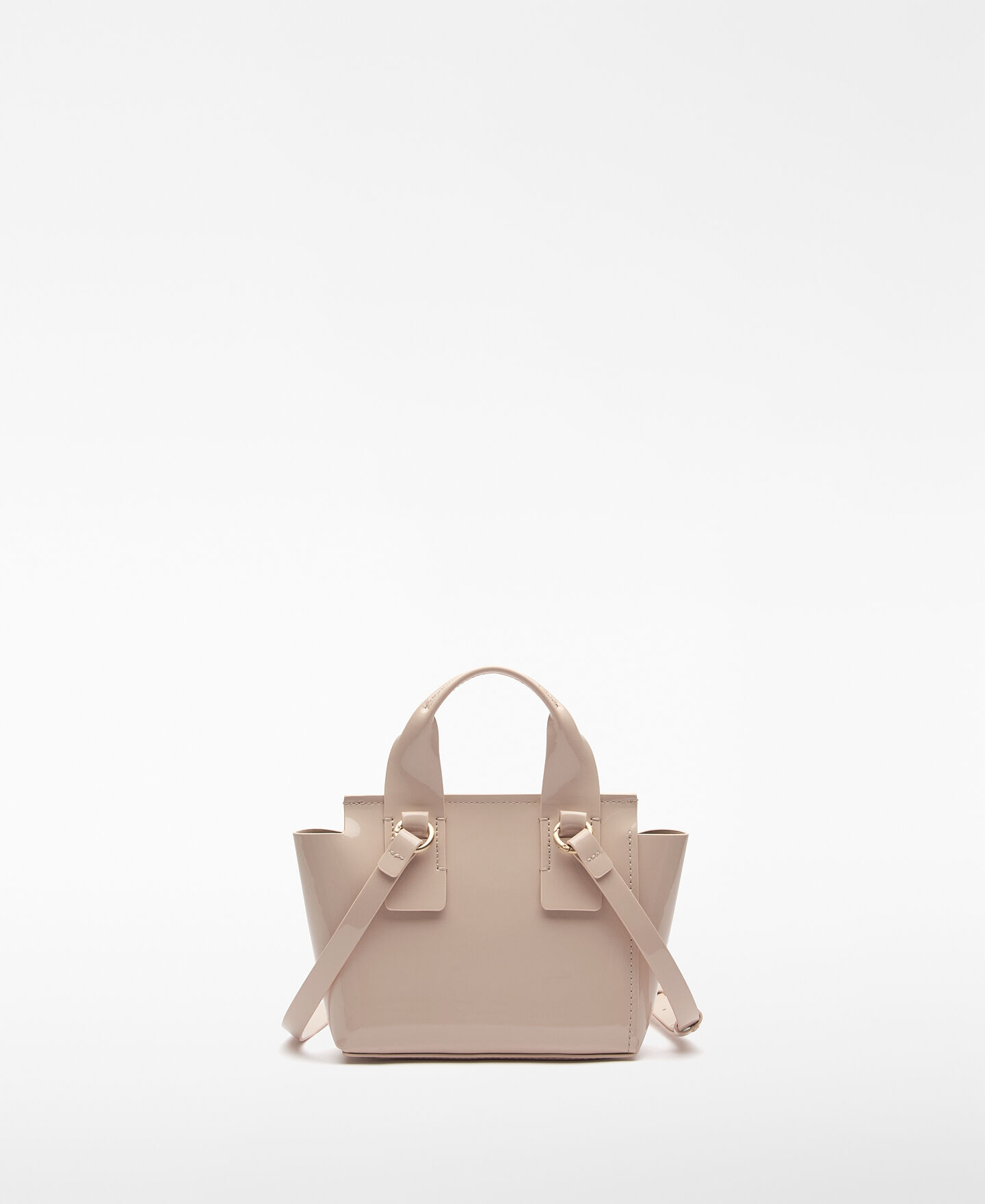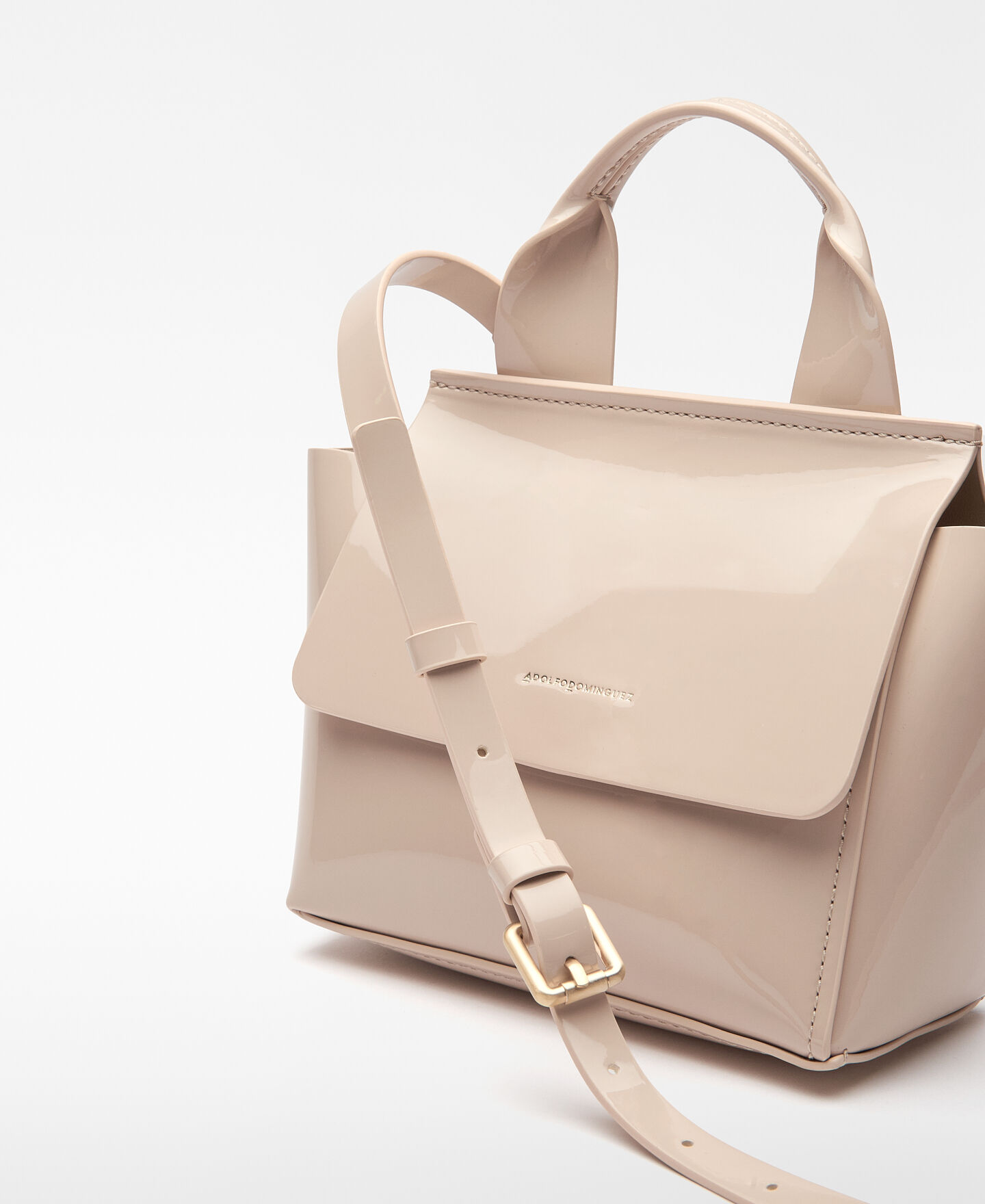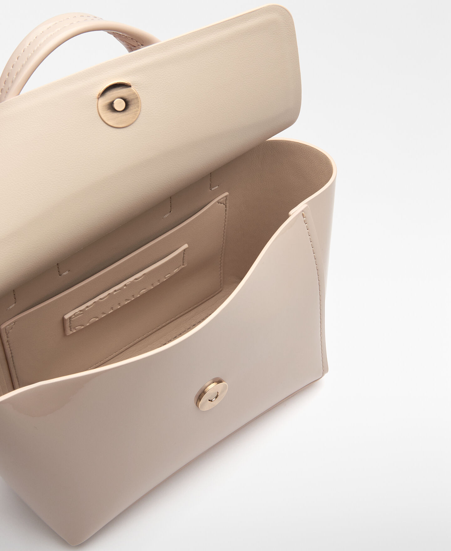 Mini bolso Mica Piel No Piel mujer. Textura charol. Un compartimento. Cierre magnético con solapa. Bolsillo interior. Asa de mano. Asa larga regulable y extraíble. Logo grabado.