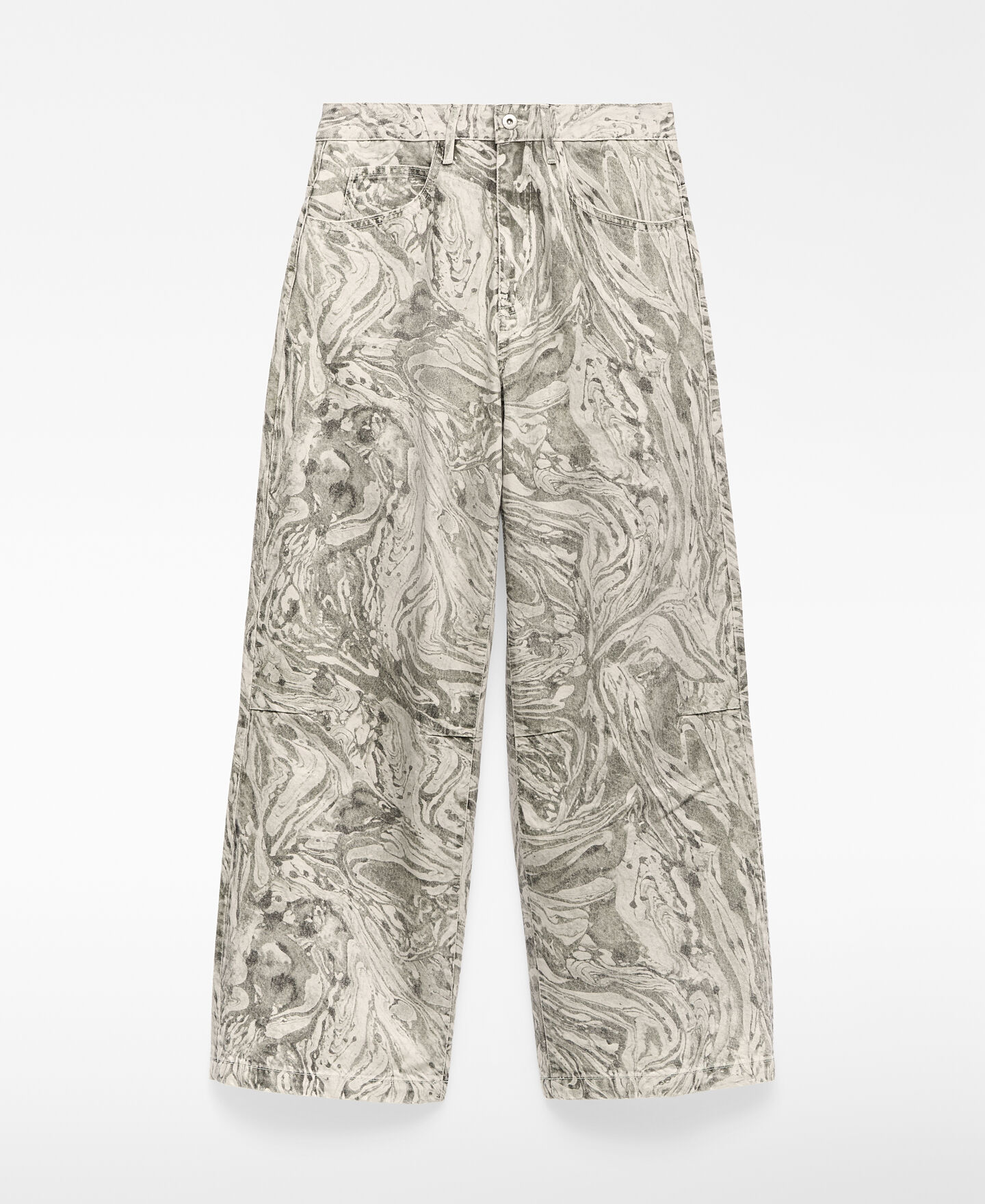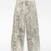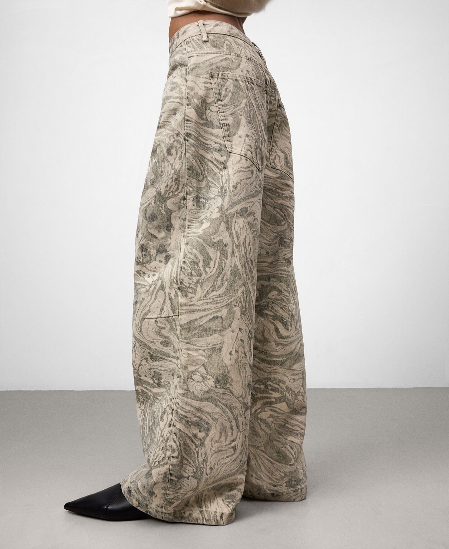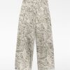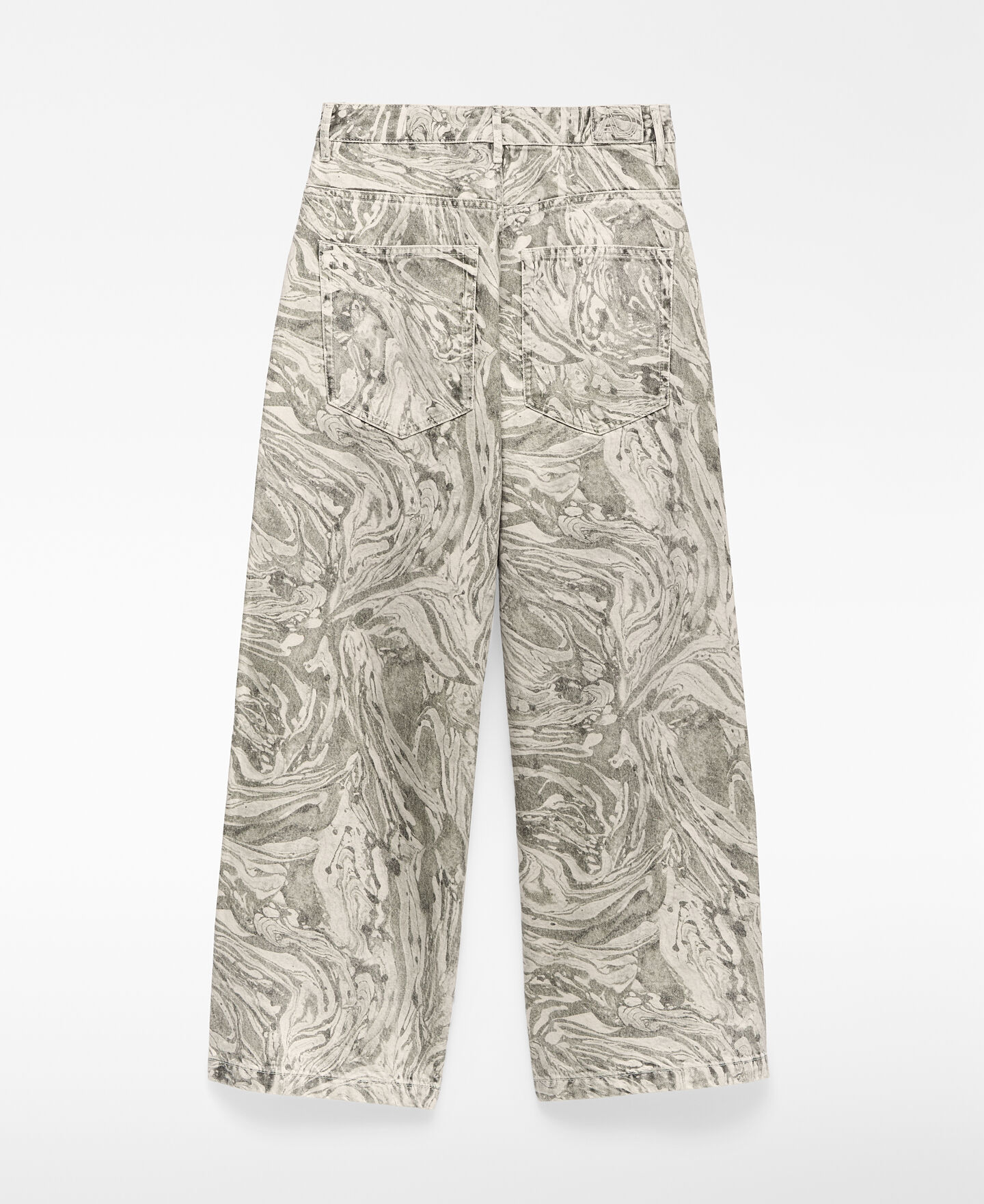 Pantalón denim estampado algodón mujer. Cierre botón metálico. Trabillas. Cinco bolsillos. Canesú en espalda. Pierna ancha.
