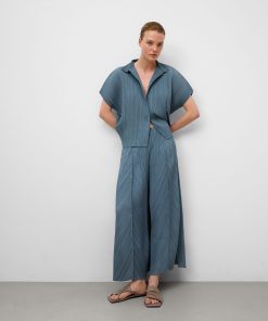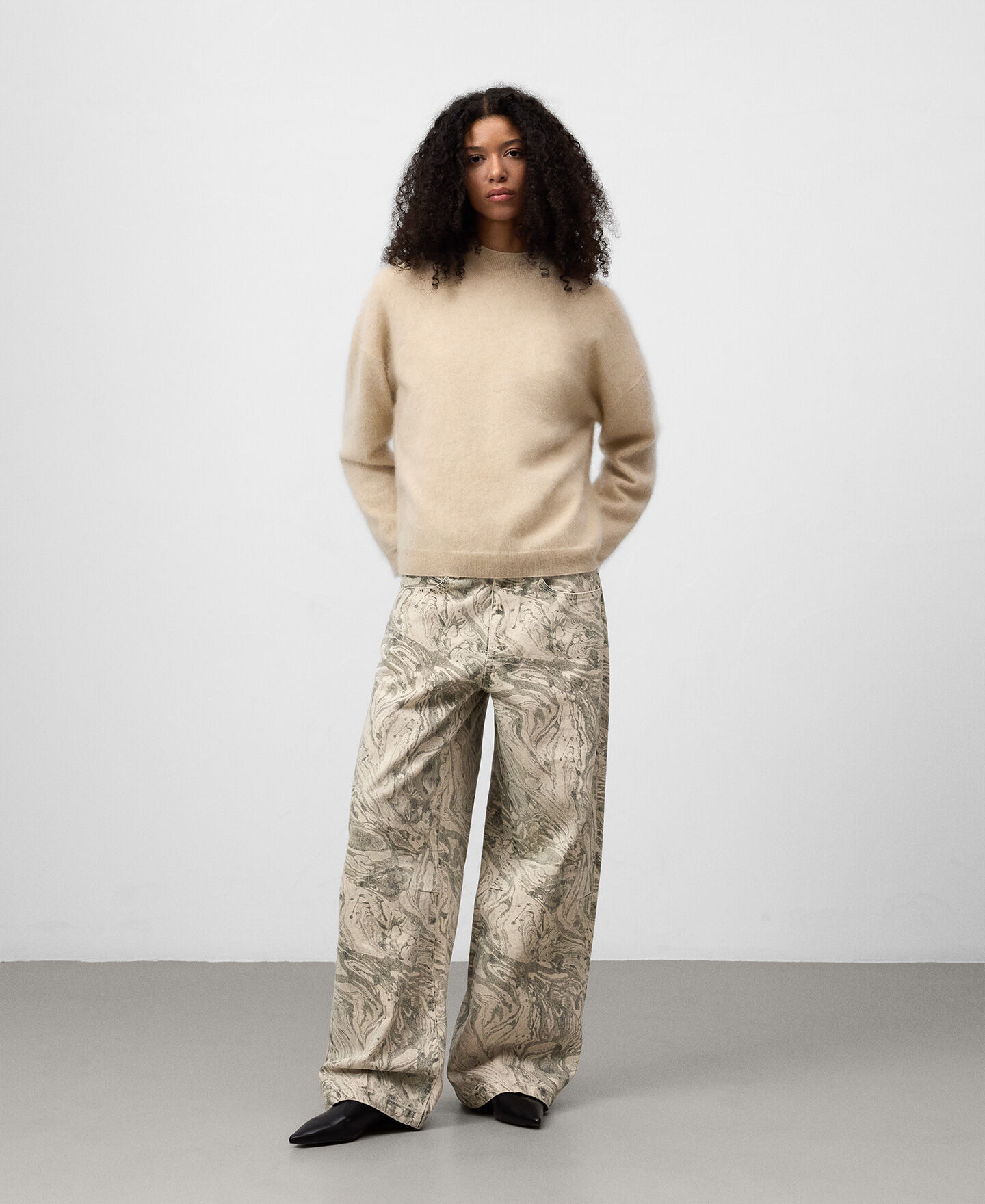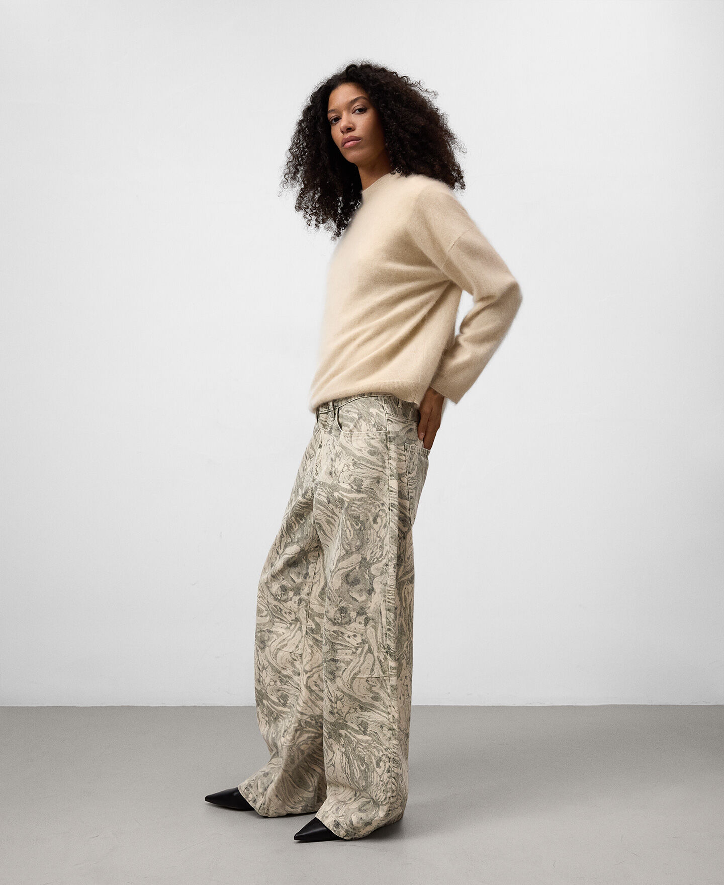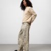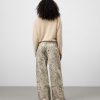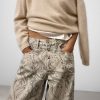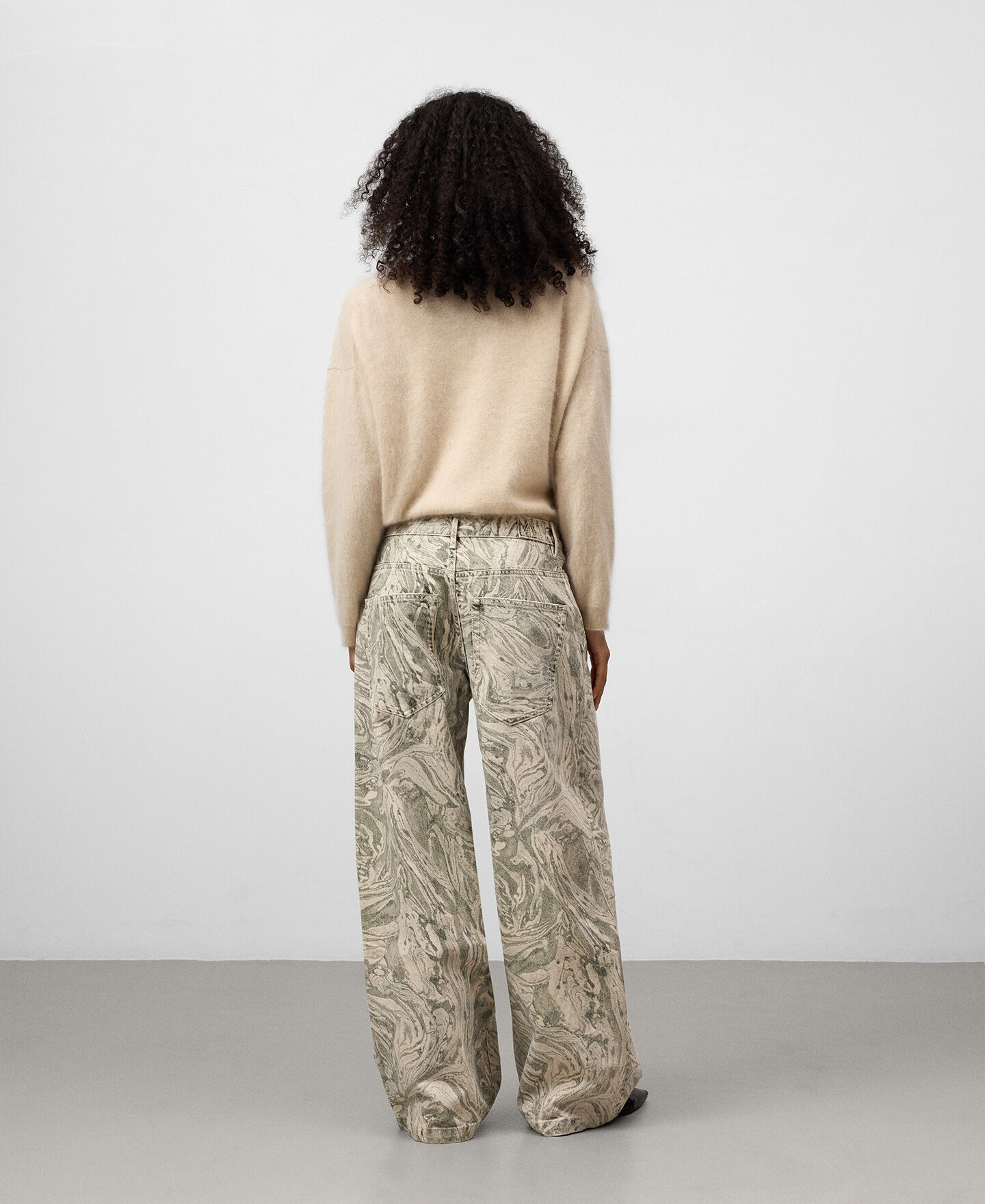 Pantalón denim estampado algodón mujer. Cierre botón metálico. Trabillas. Cinco bolsillos. Canesú en espalda. Pierna ancha.