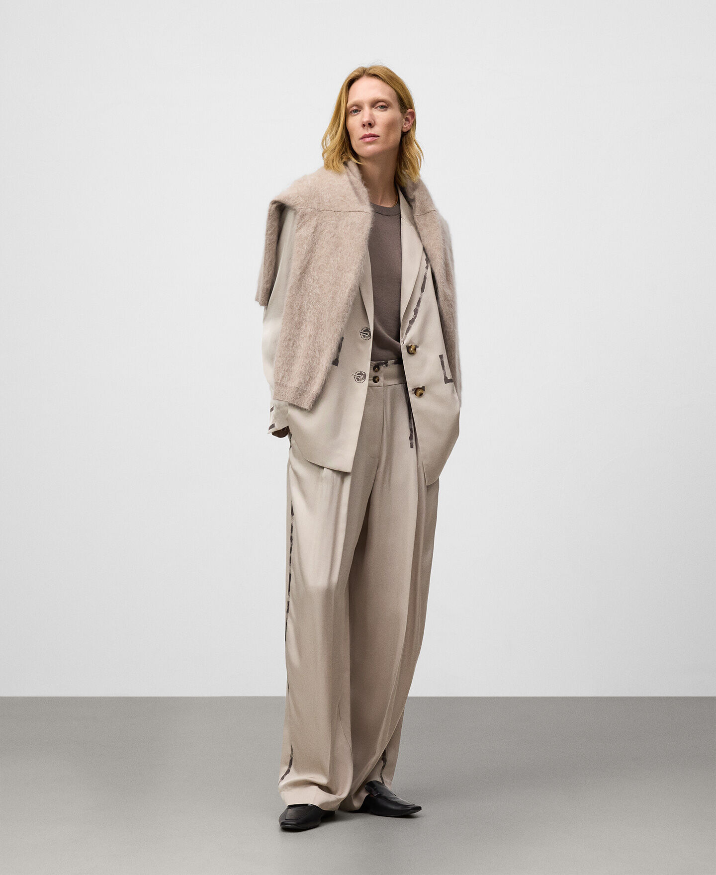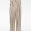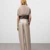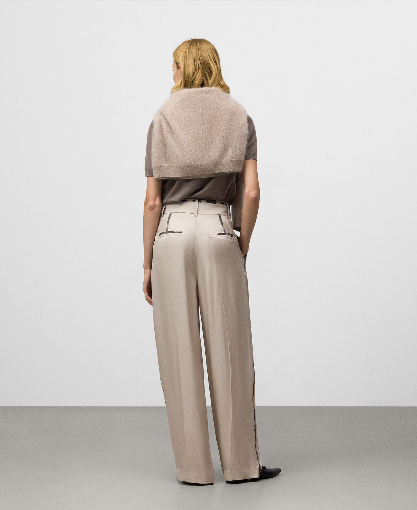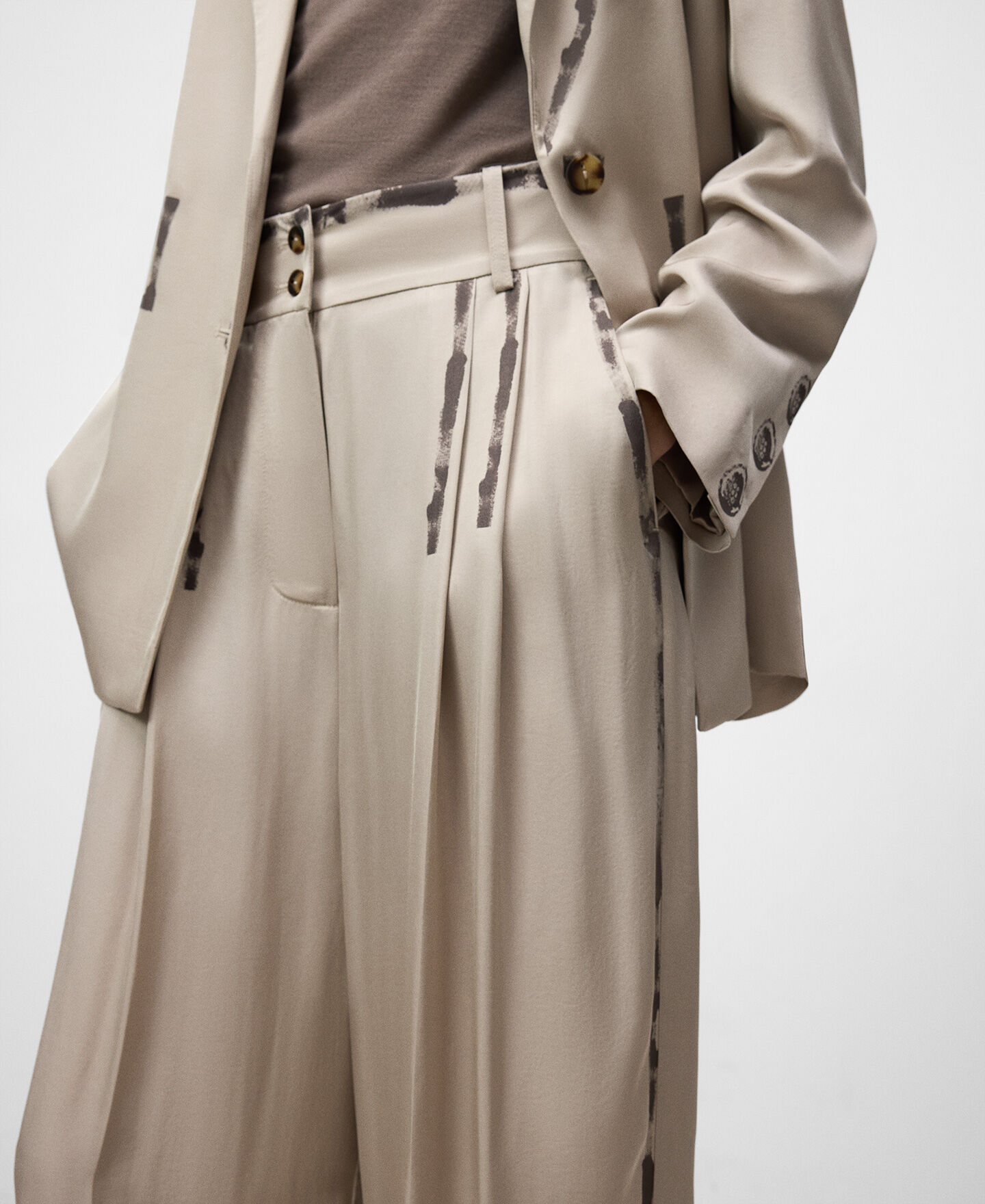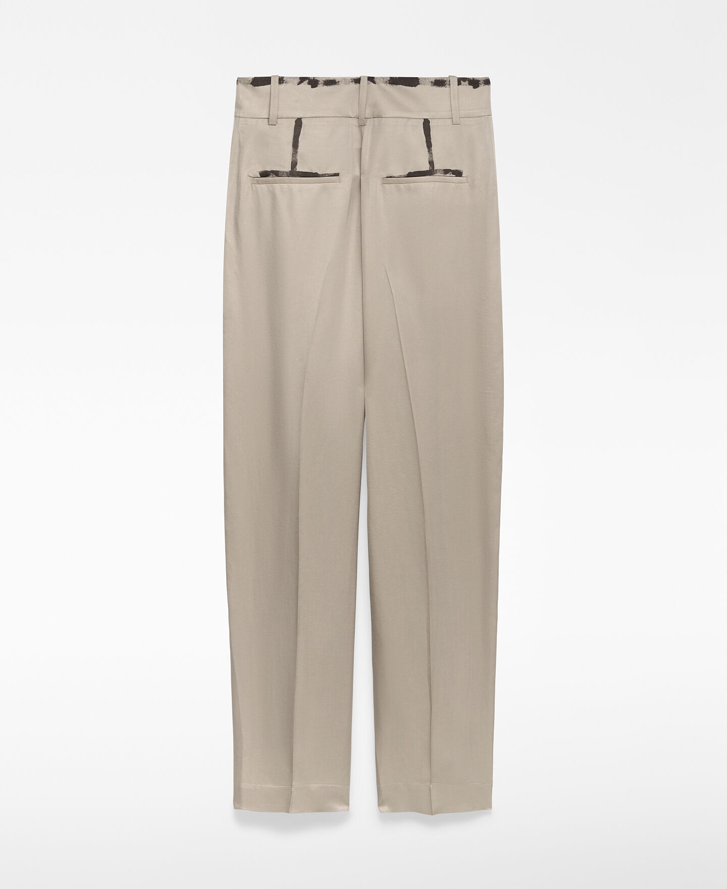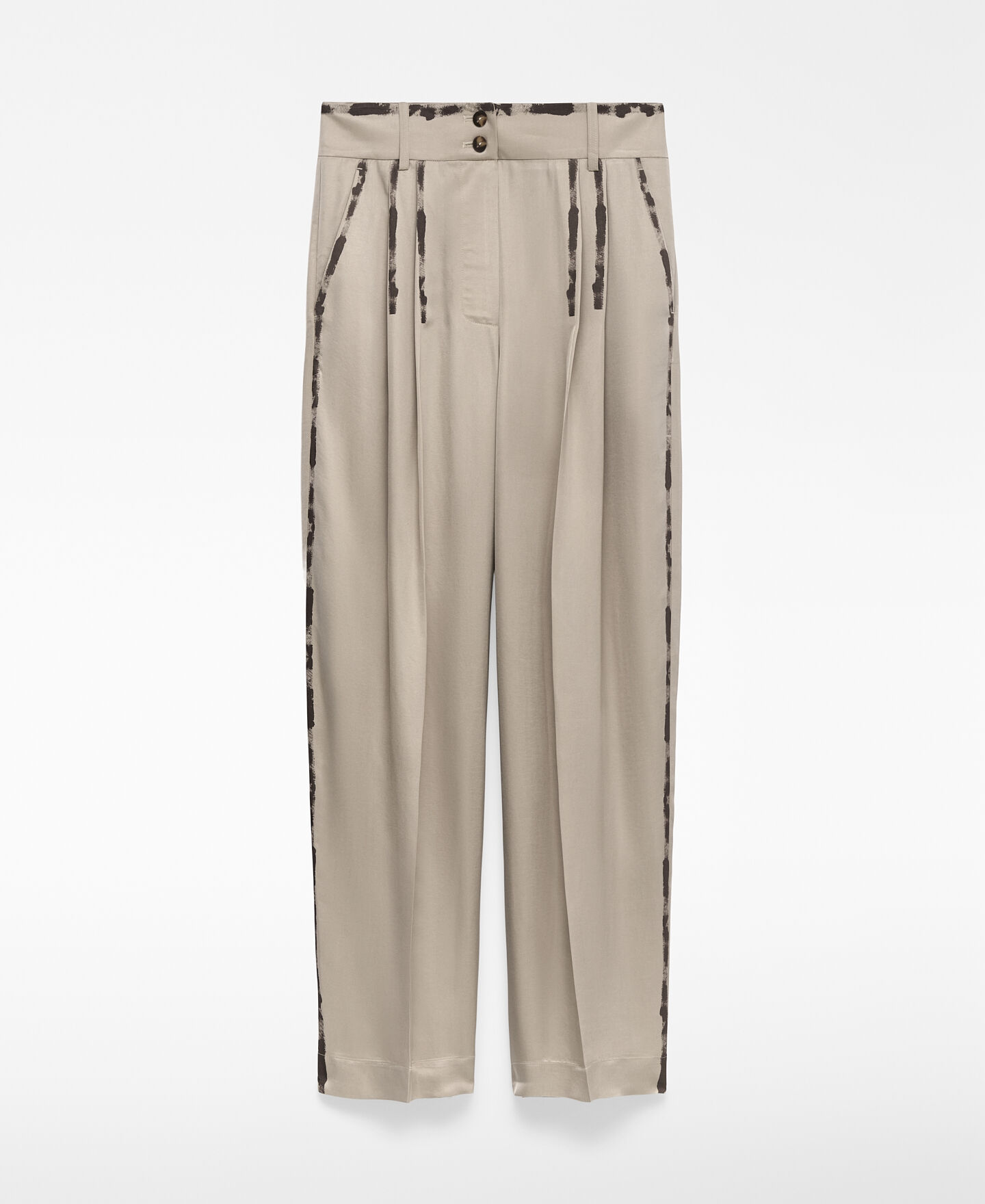 Pantalón barrel fit viscosa responsable. Cinturilla alta con trabillas y cierre dos botones. Doble pinza en delantero. Bolsillos laterales. Bolsillos de vivo en espalda. Efecto pintura en costuras laterales, cinturilla, pinzas y bolsillos.