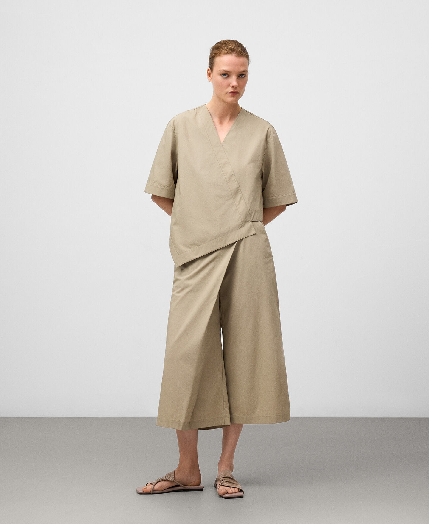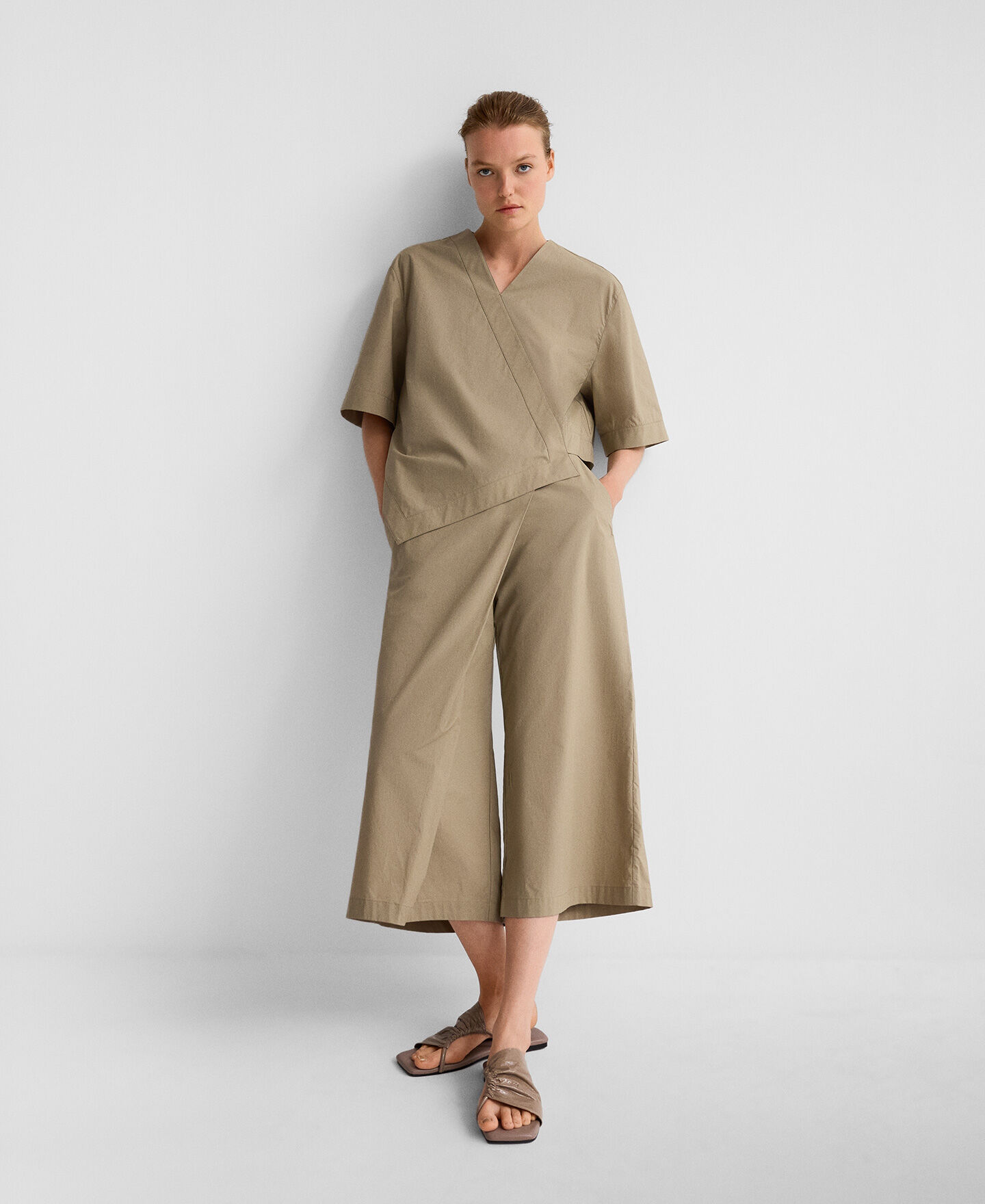 Pantalón pareo cropped algodón mujer. Delantero cruzado. Cinturilla elástica en espalda. Bolsillos laterales. Bolsillo de vivo en espalda. Cierre cremallera lateral. Pierna recta.