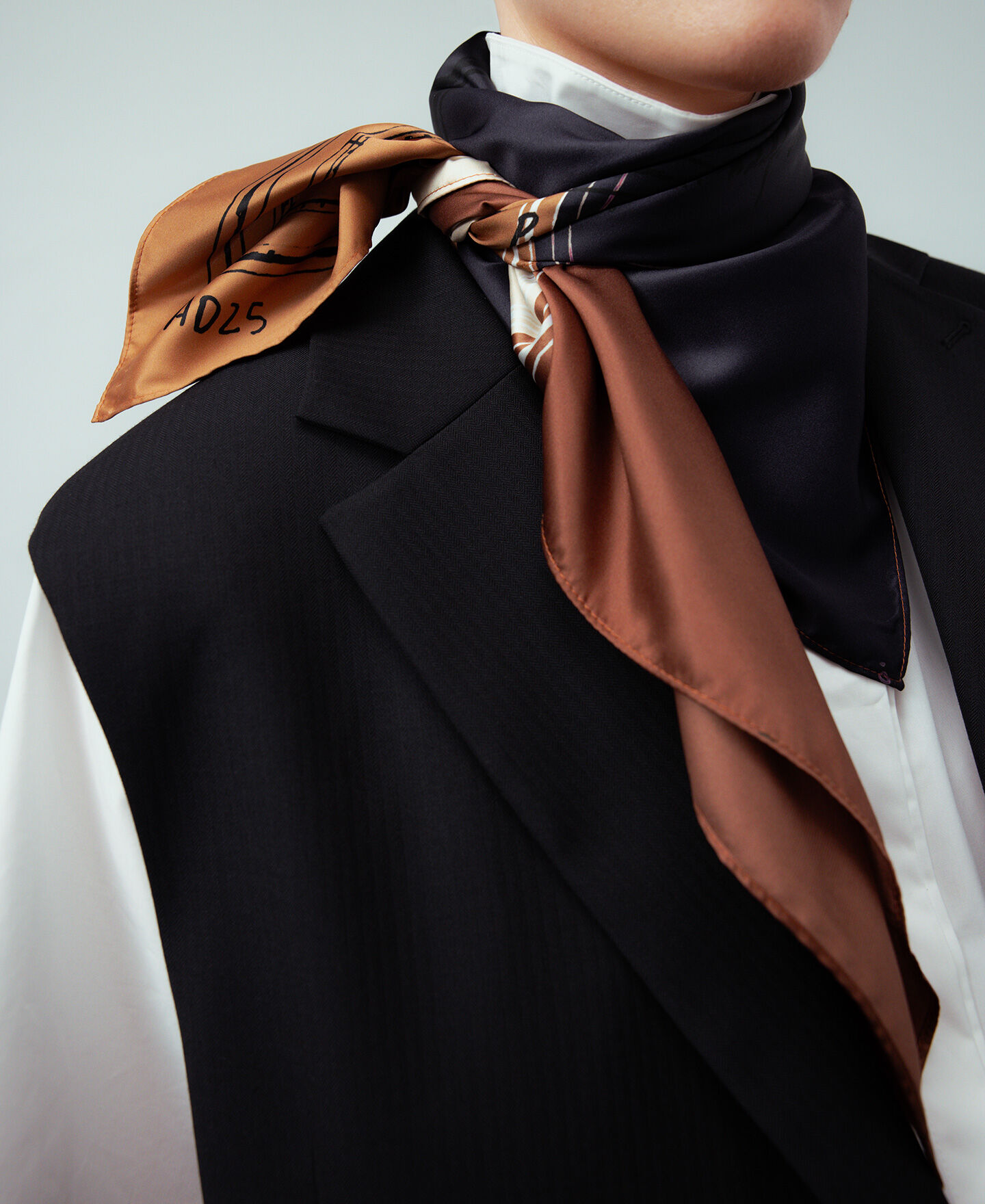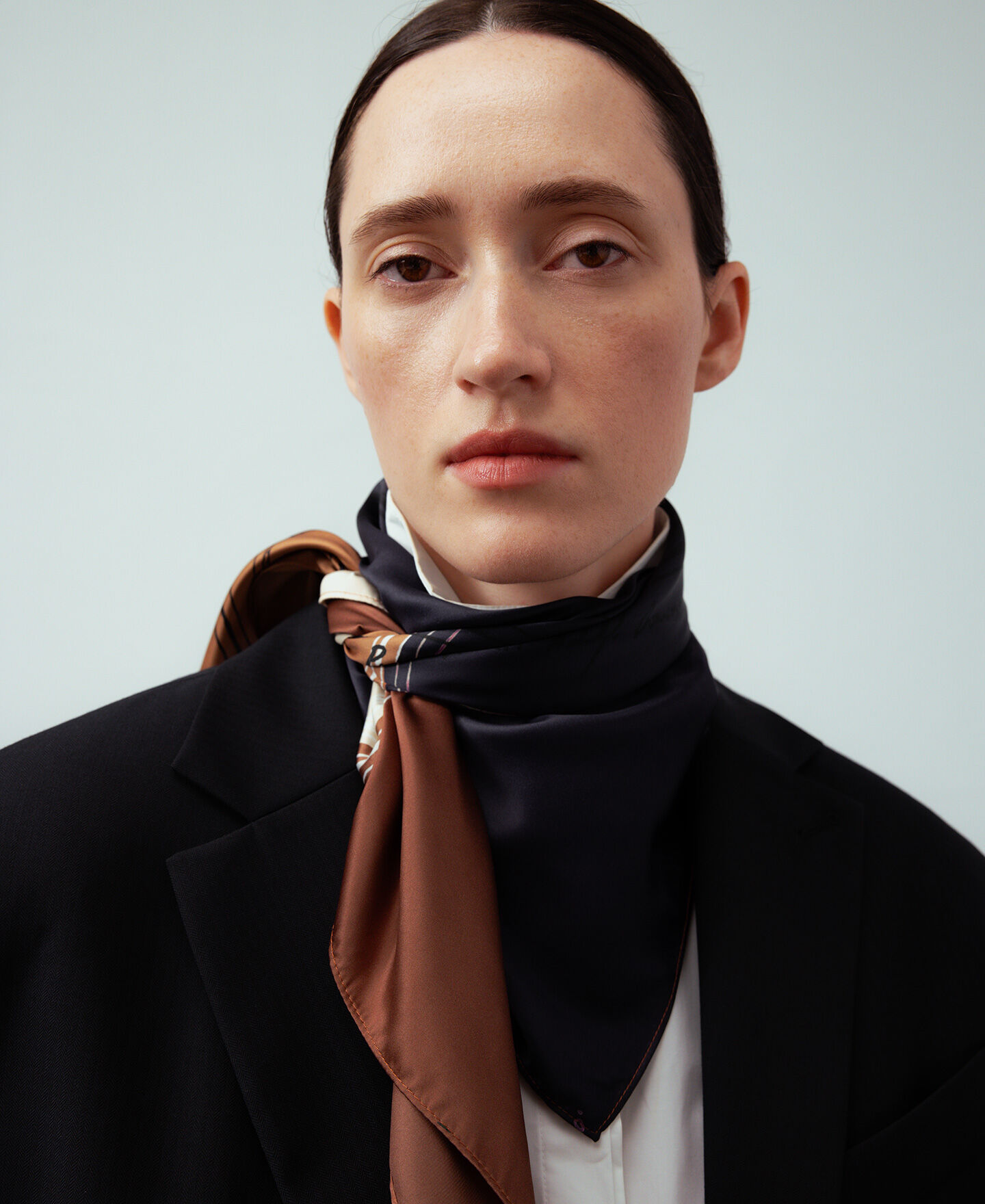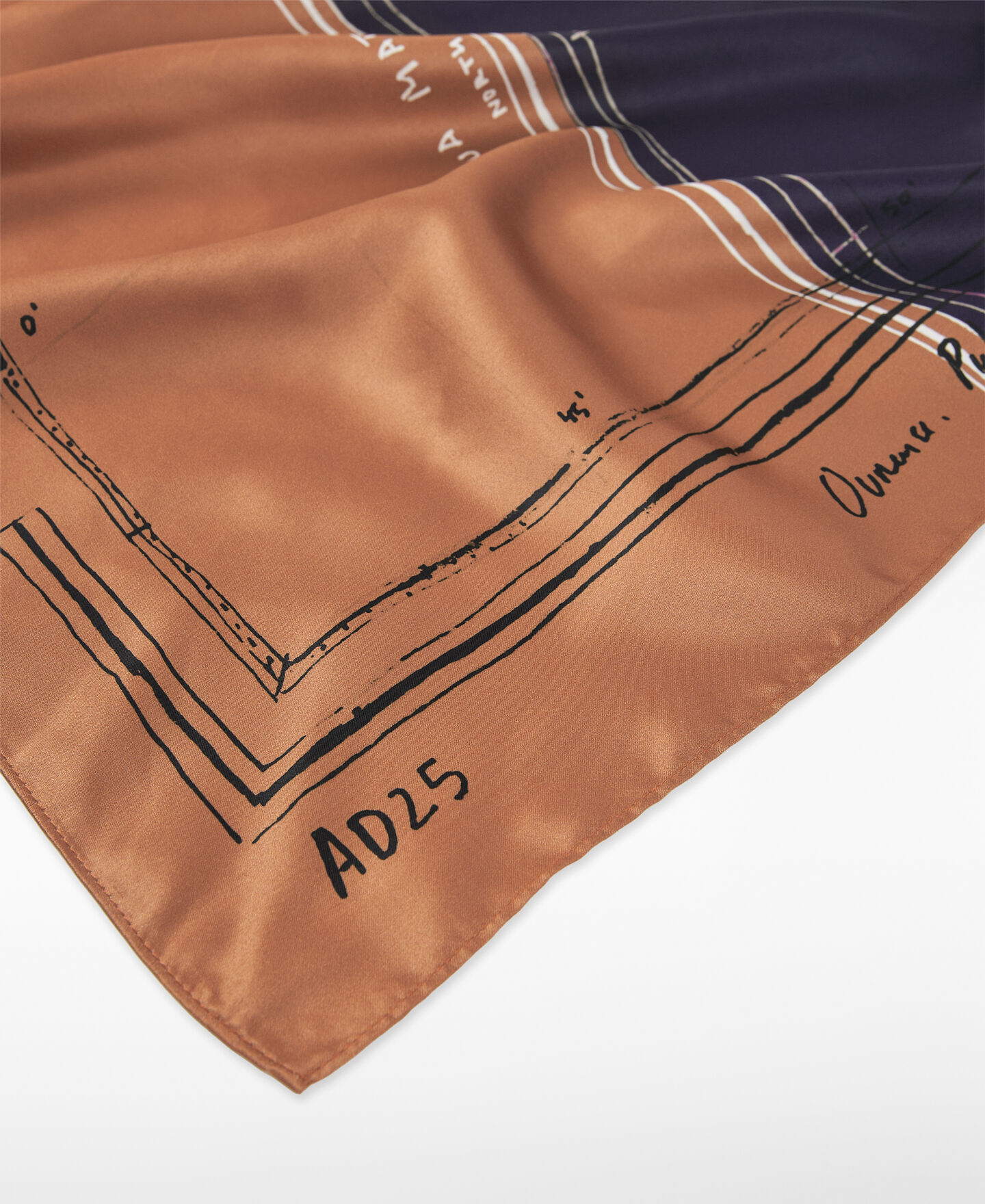 Pañuelo cuadrado poliéster reciclado mujer. Estampado cartográfico Colección Aqua. Logo estampado. Dobladillo recto.