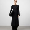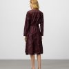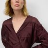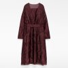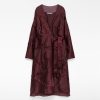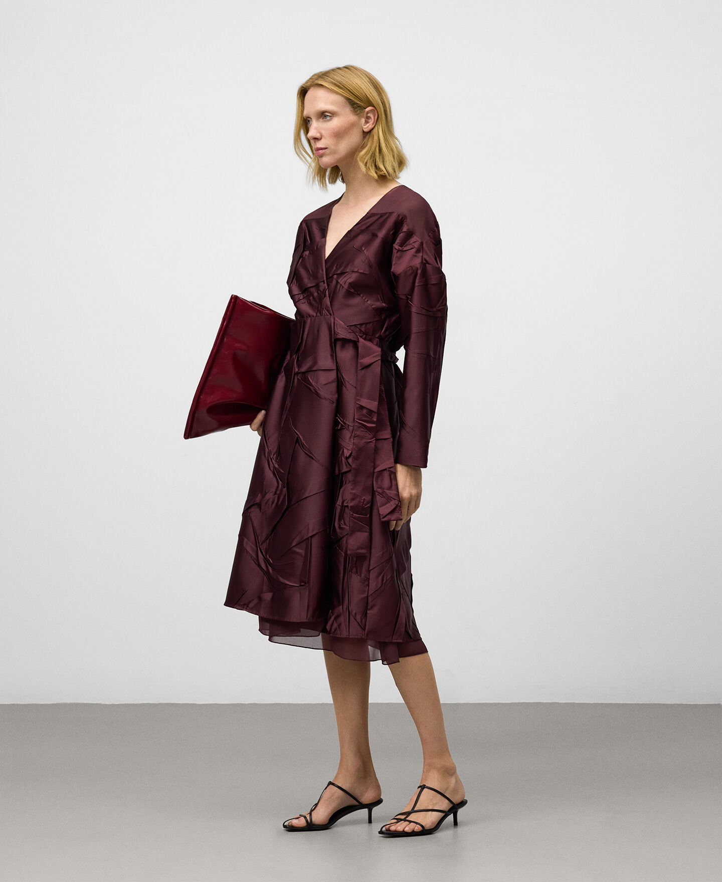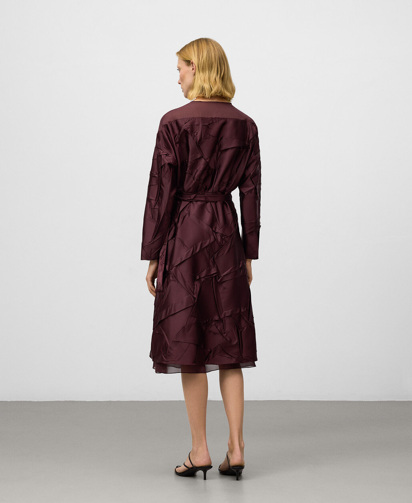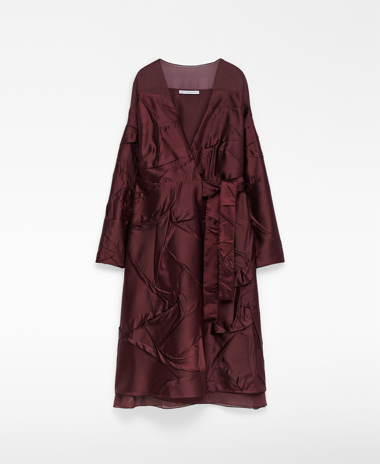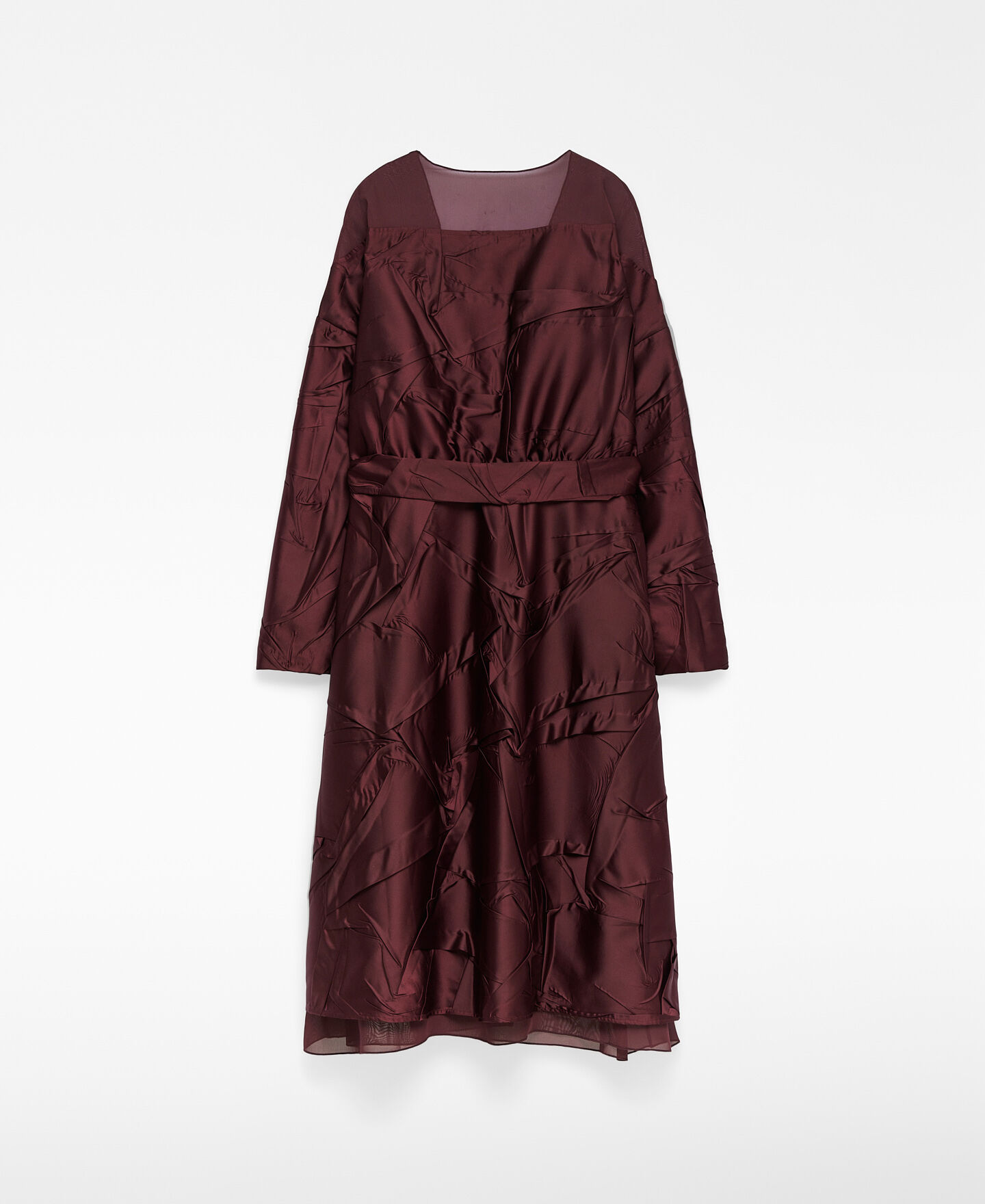 Vestido combinado efecto arrugado mujer. Hombro, parte superior de la espalda y bajo en organza semitransparente. Manga larga. Escote pico. Delantero cruzado con cinturón que anuda en lateral. Largo midi.