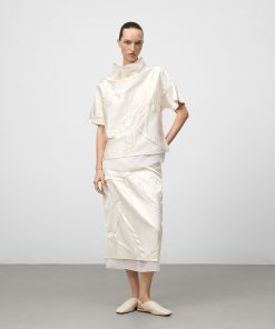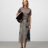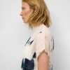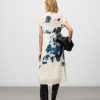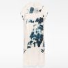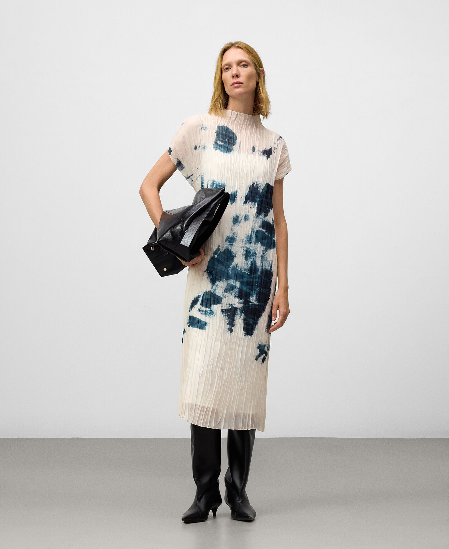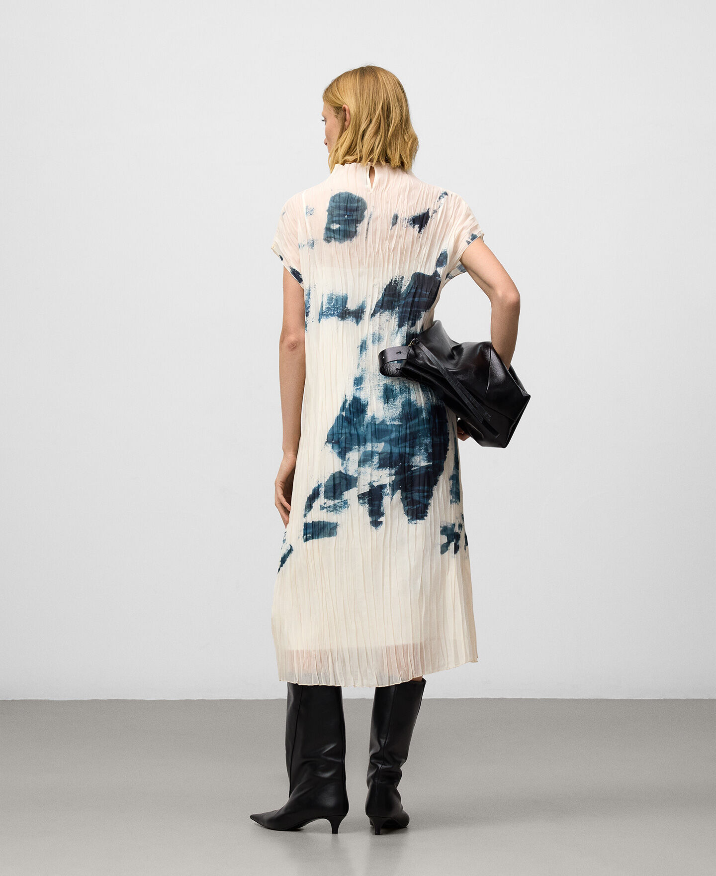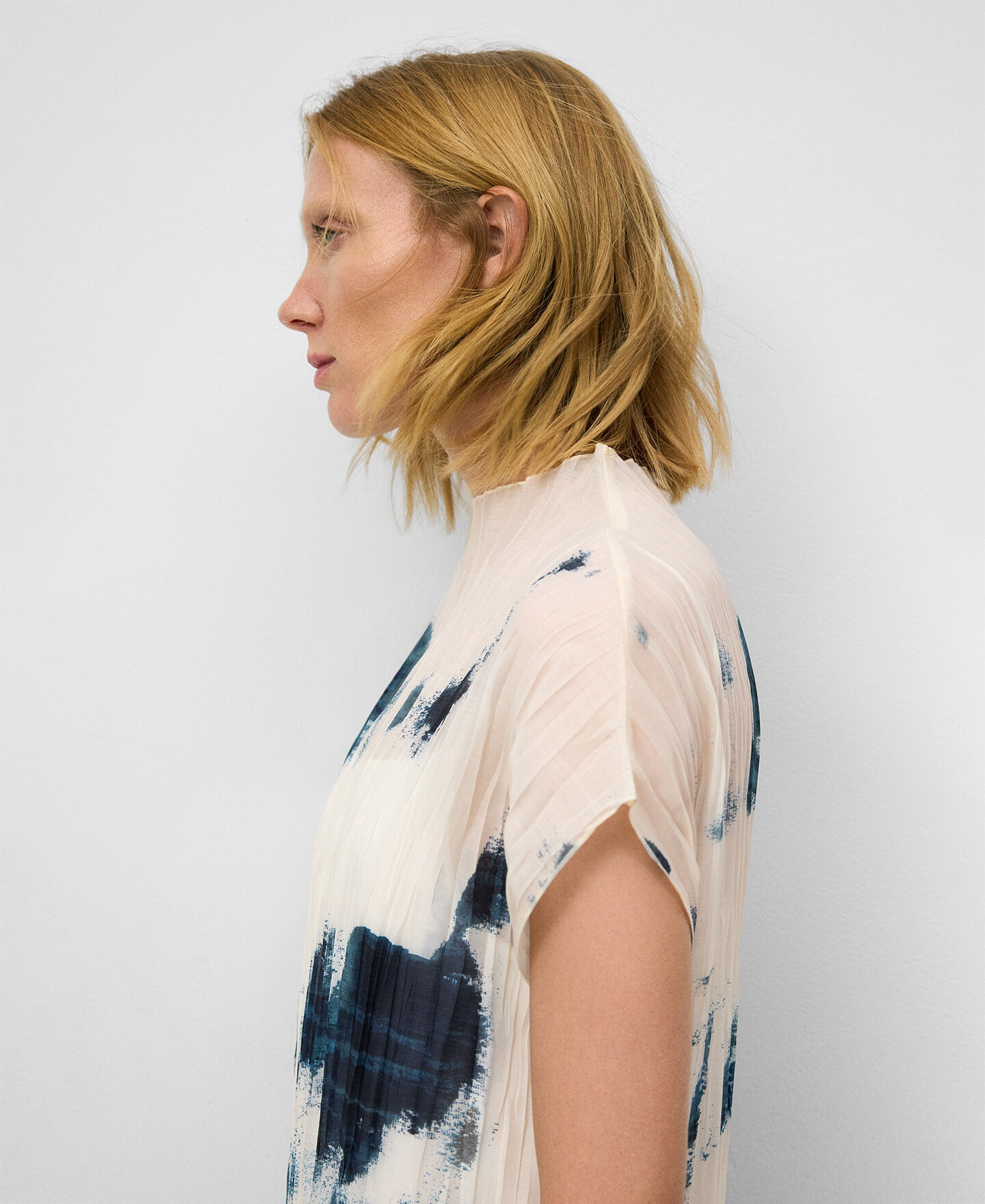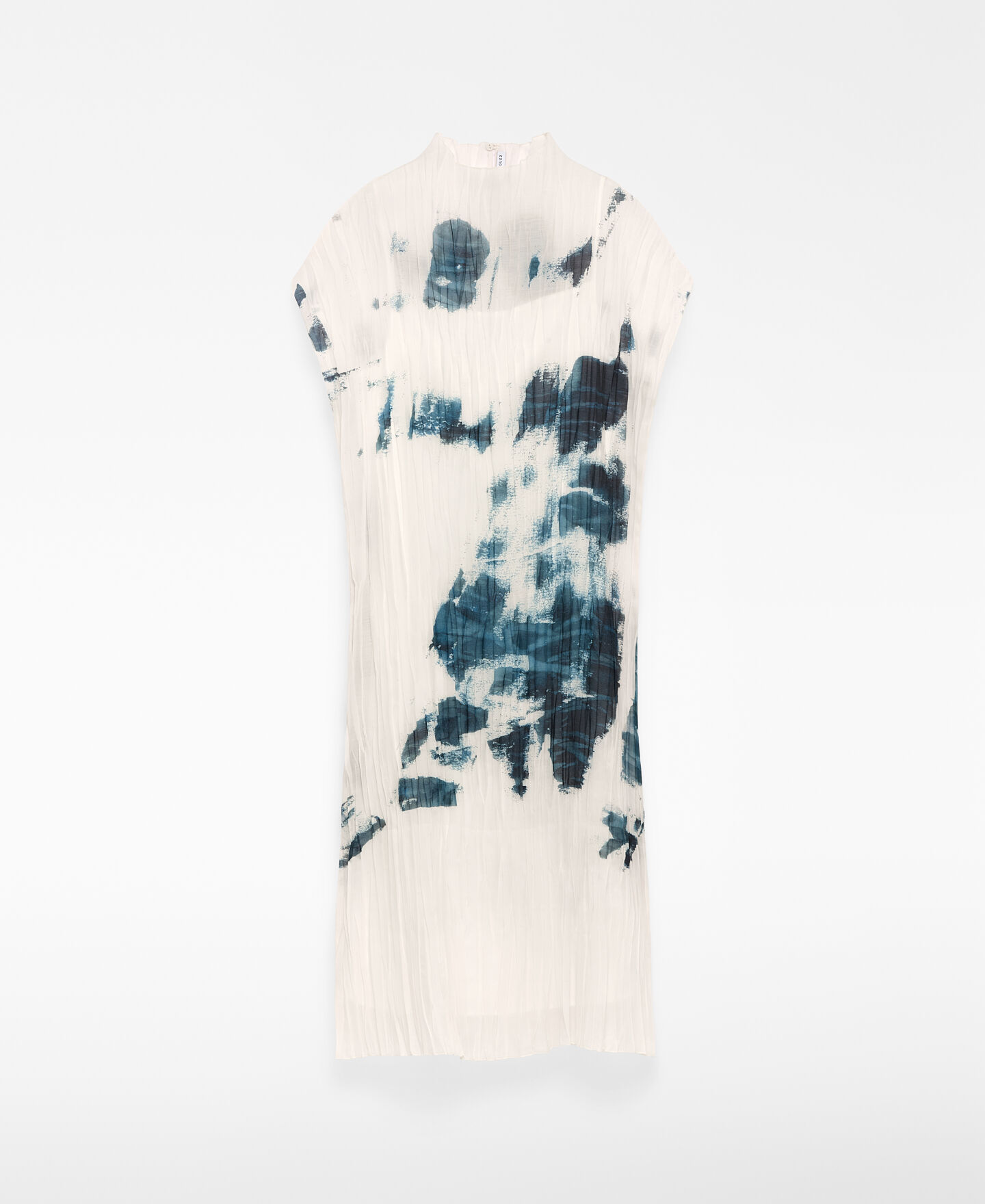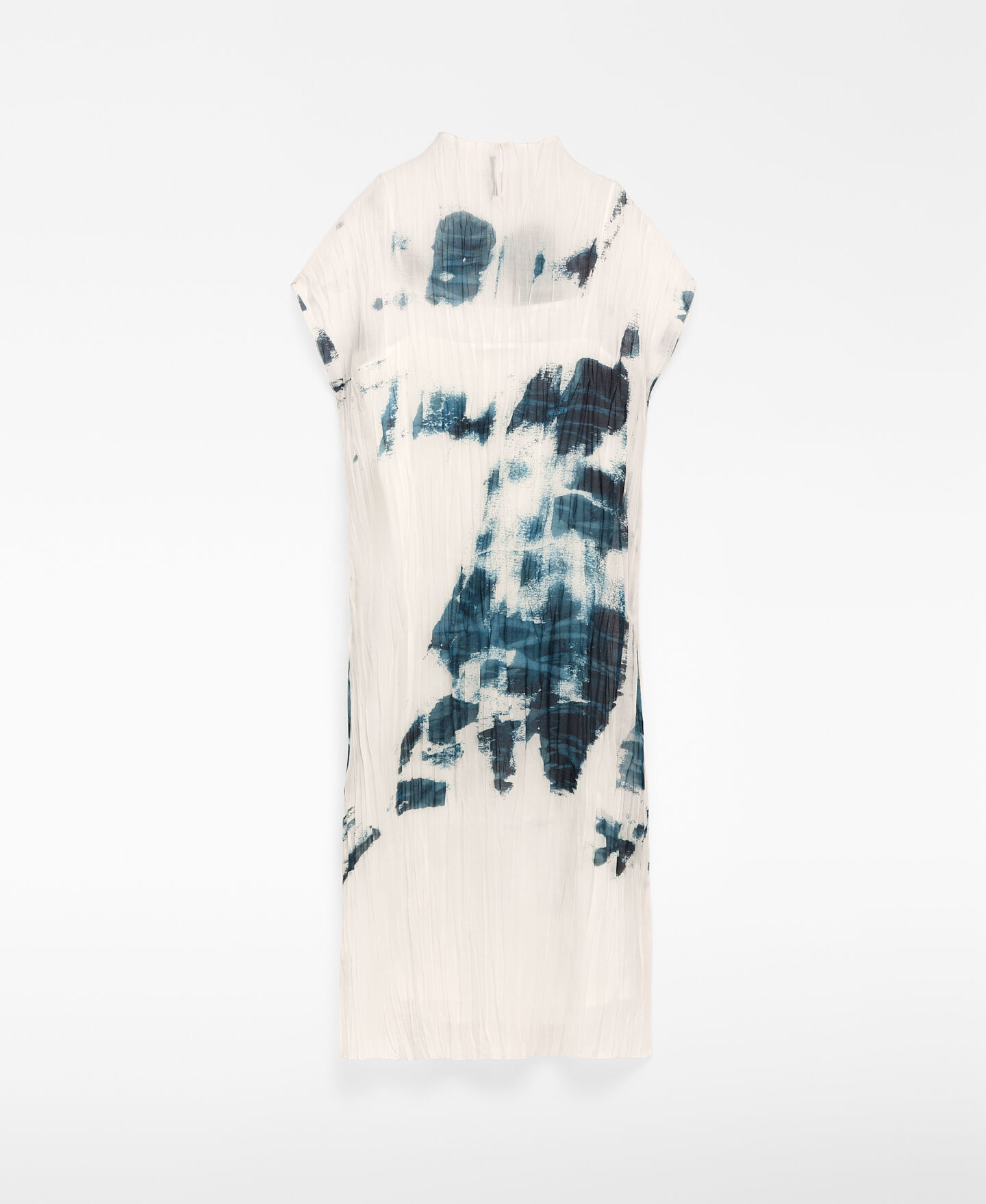 Vestido crinkle estampado mujer. Silueta recta. Cuello chimenea. Manga corta con hombro caído. Forro con tirantes y escote recto. Cierre lágrima con botón en espalda. Largo midi.