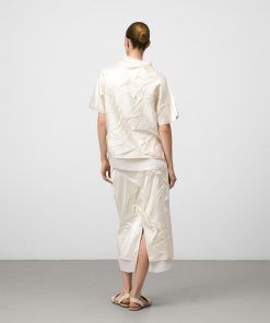 Vestido crinkle estampado mujer. Silueta recta. Cuello chimenea. Manga corta con hombro caído. Forro con tirantes y escote recto. Cierre lágrima con botón en espalda. Largo midi.
