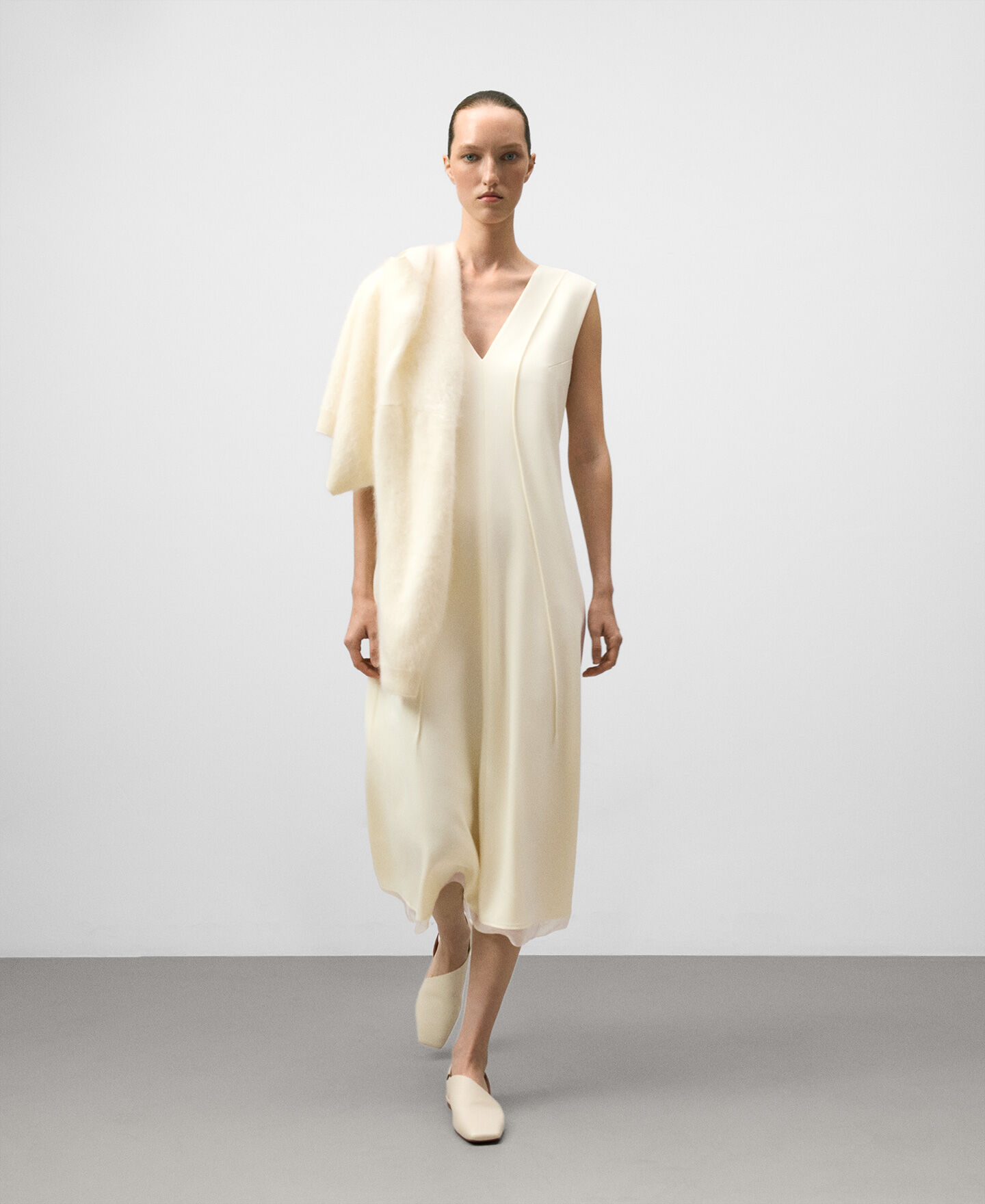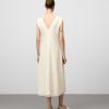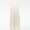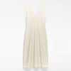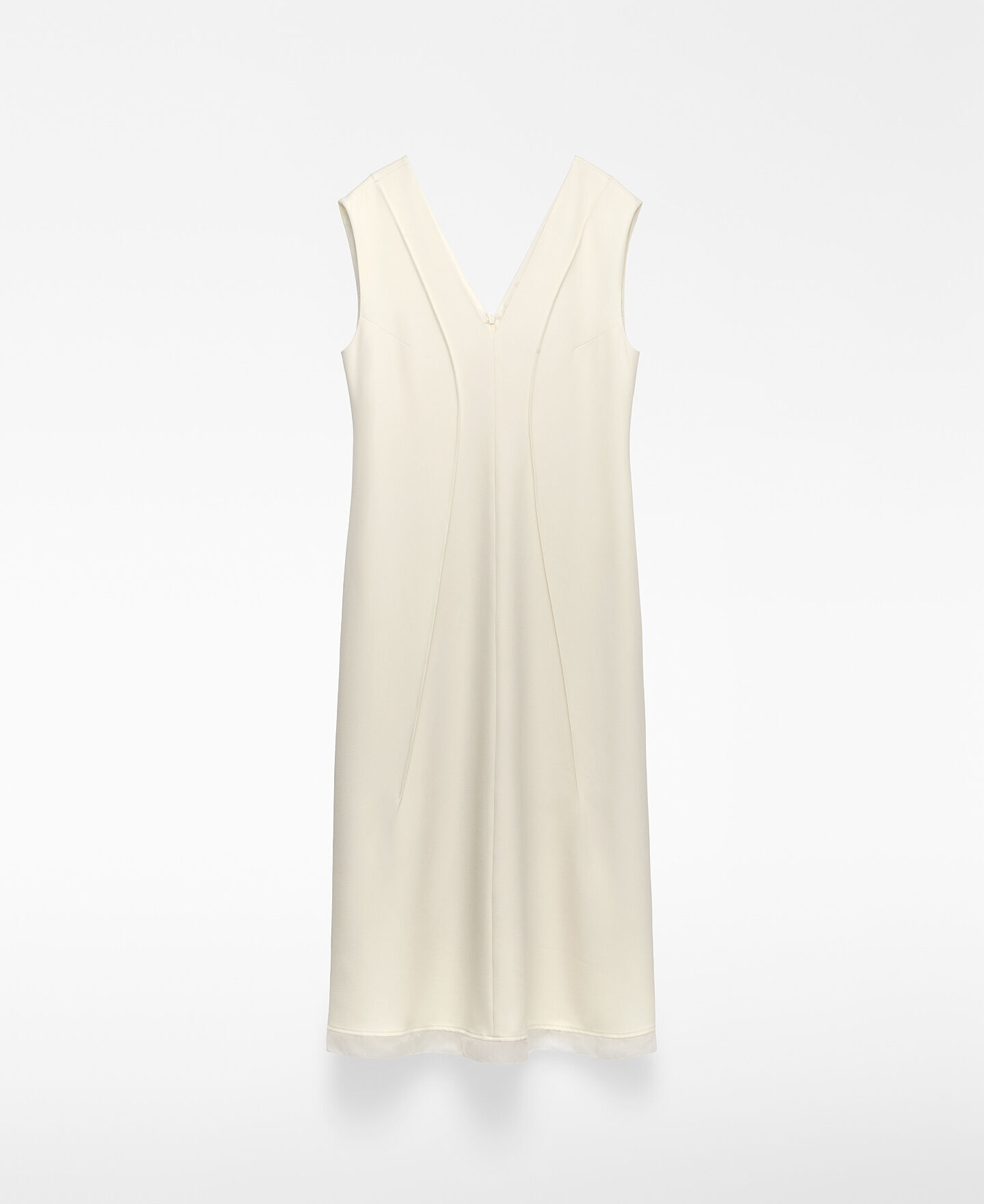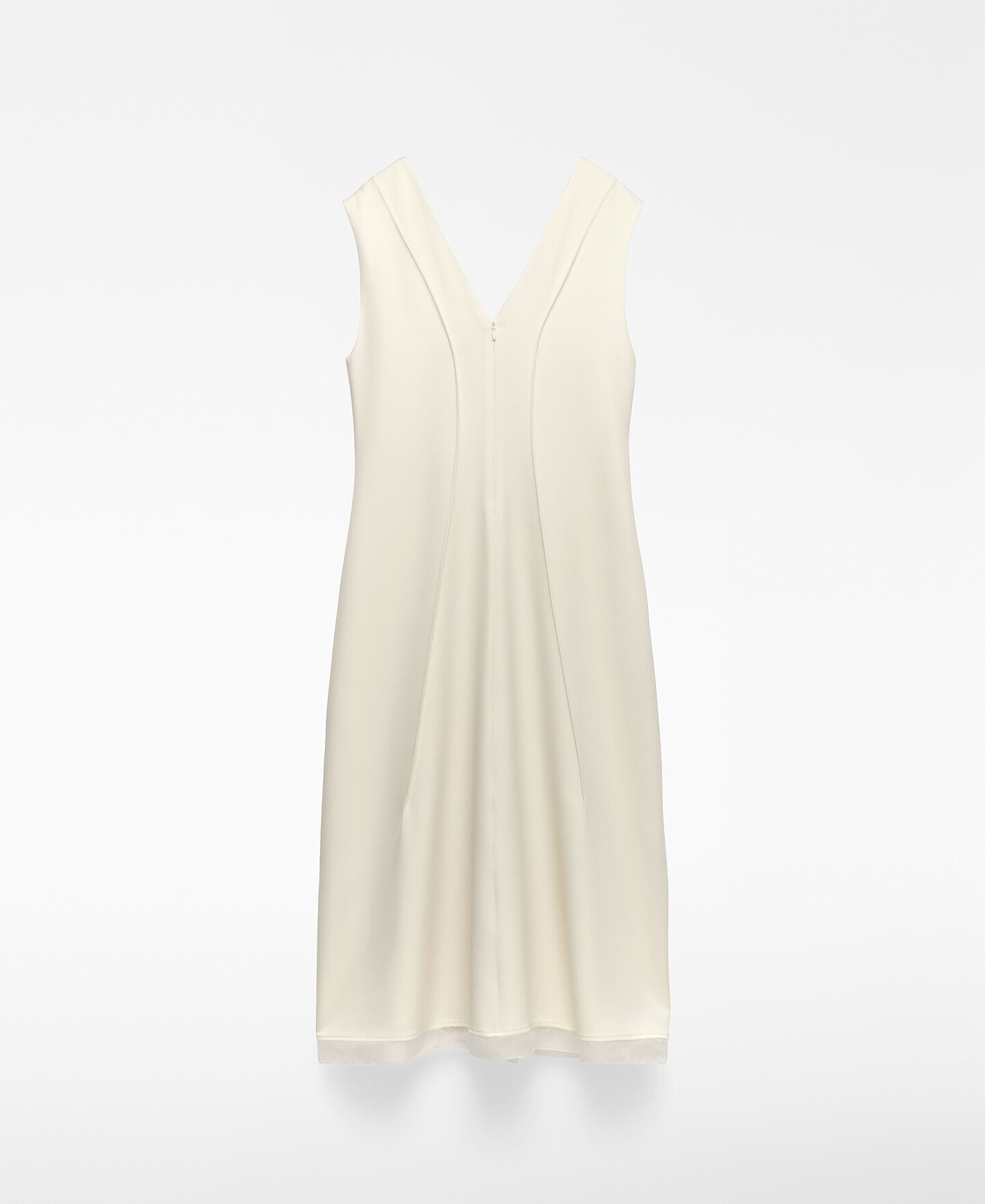 Vestido entallado poliéster reciclado mujer. Escote pico. Manga sisa con pinza. Nervios centrales en delantero y espalda. Cierre cremallera en espalda. Detalle de organza en bajo.