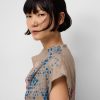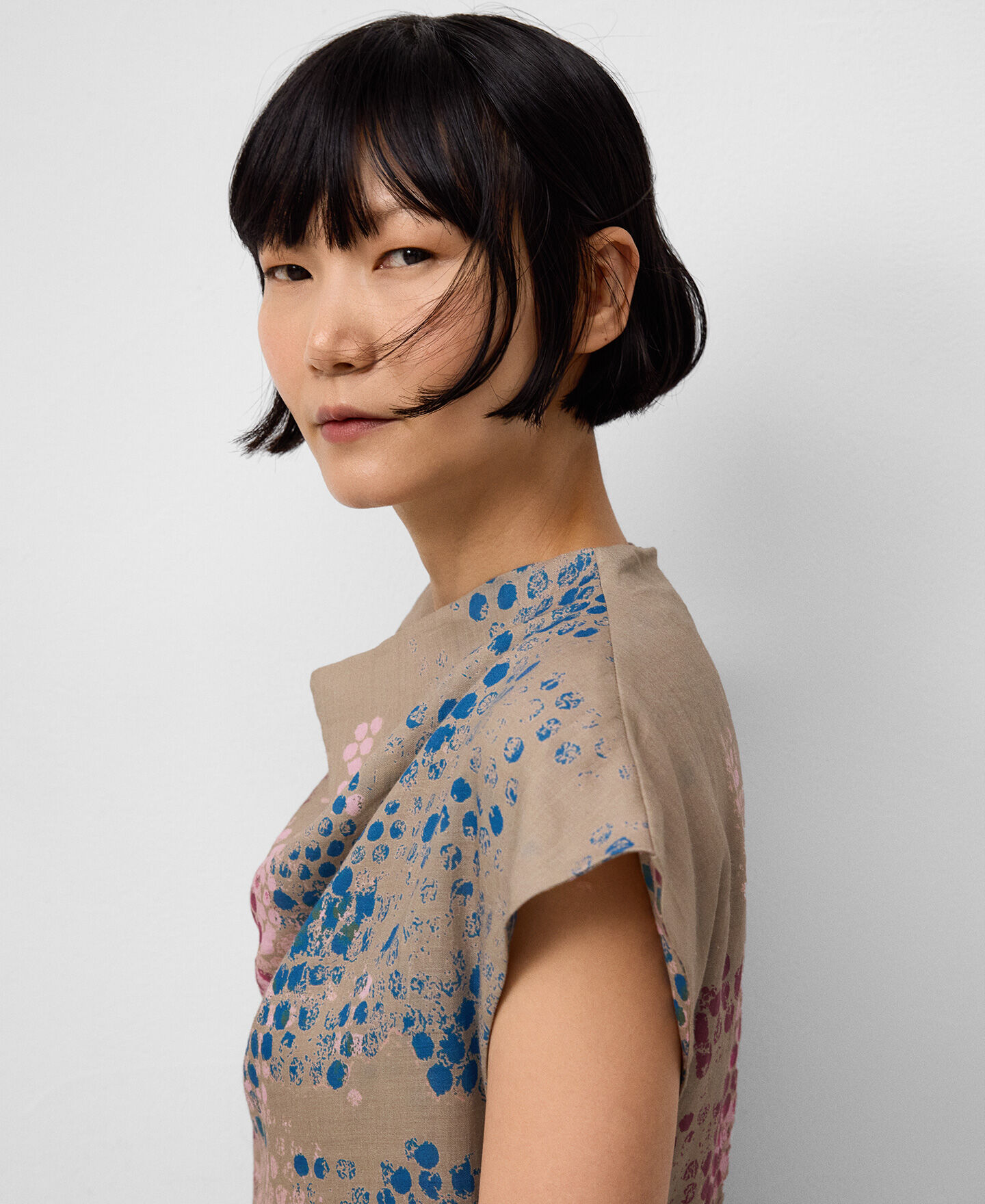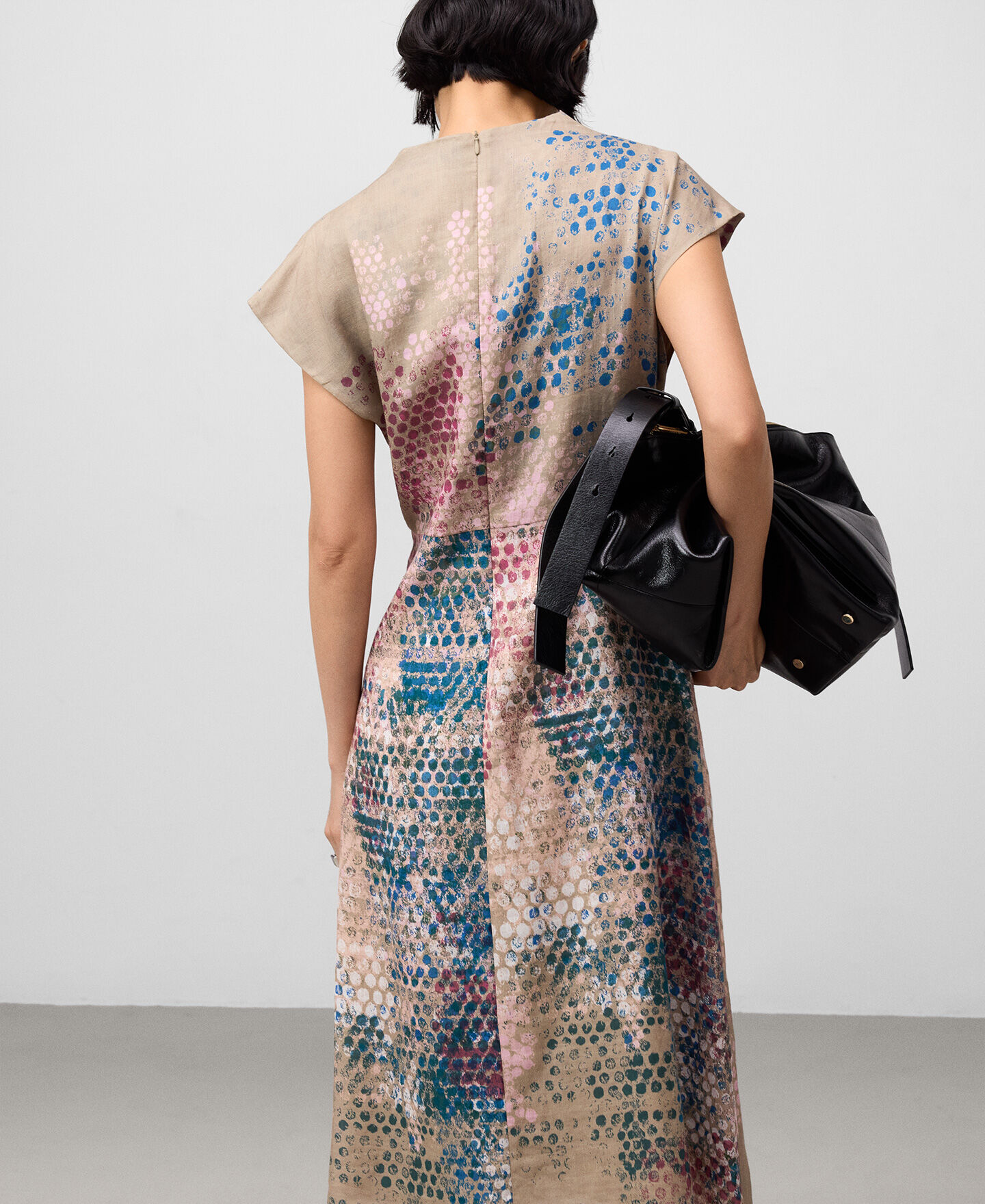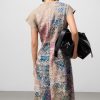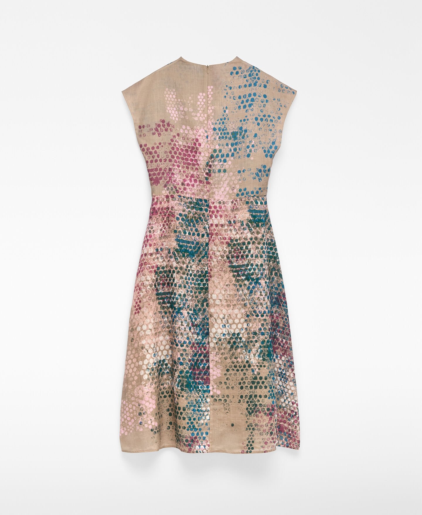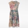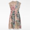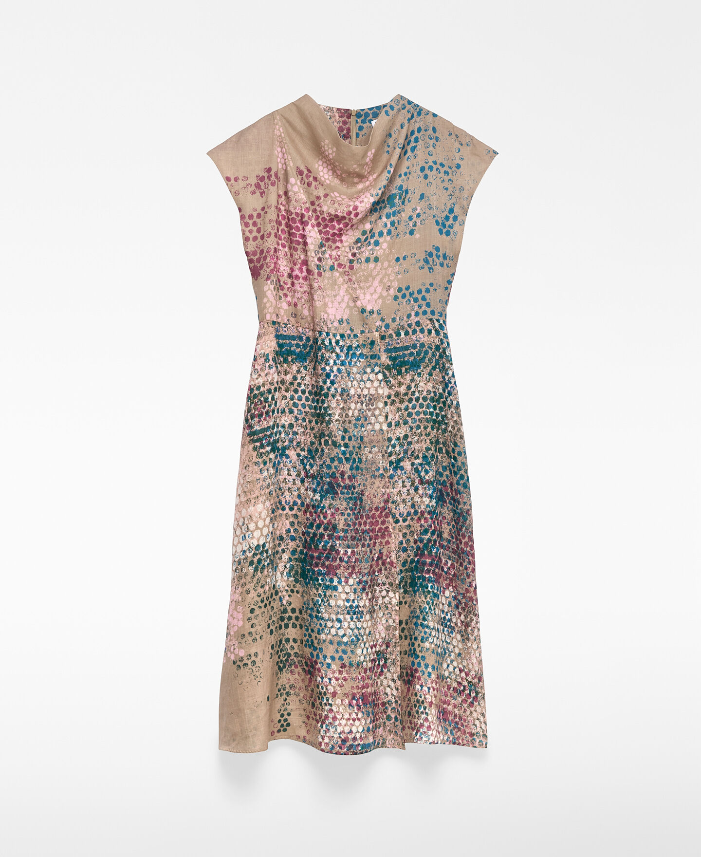 Vestido estampado ramio mujer. Escote drapeado. Manga sisa con hombro caído. Entallado en cintura. Falda evasé. Largo midi. Cierre cremallera en espalda.