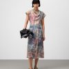 Vestido estampado ramio mujer. Escote drapeado. Manga sisa con hombro caído. Entallado en cintura. Falda evasé. Largo midi. Cierre cremallera en espalda.