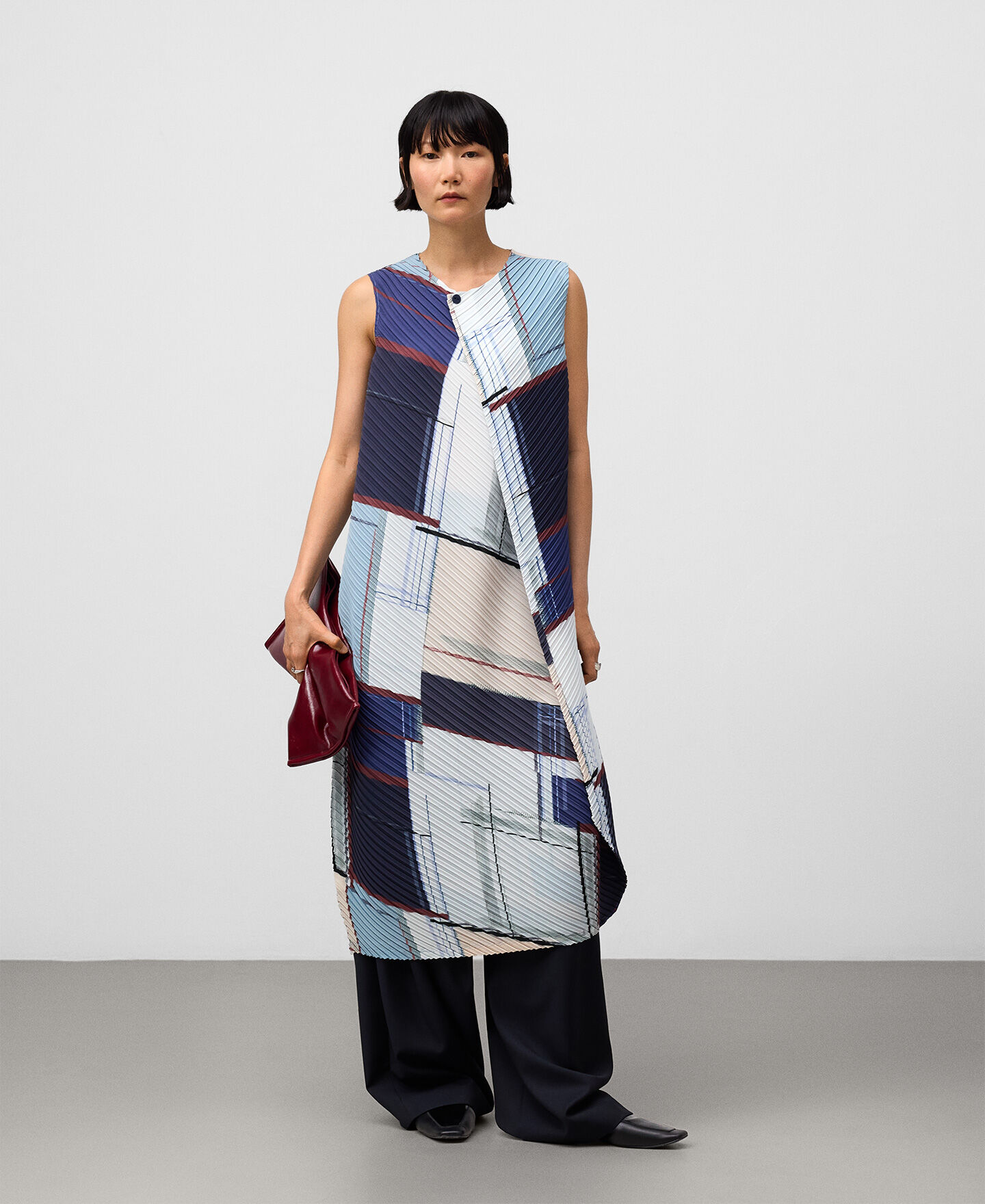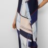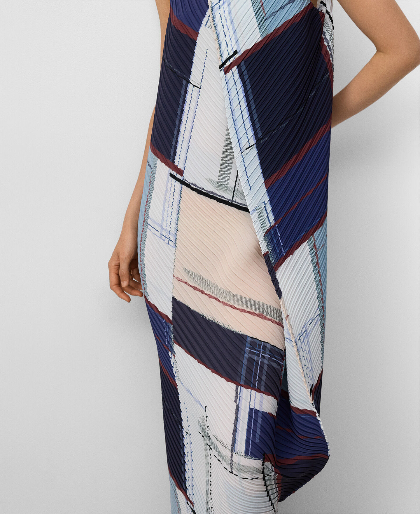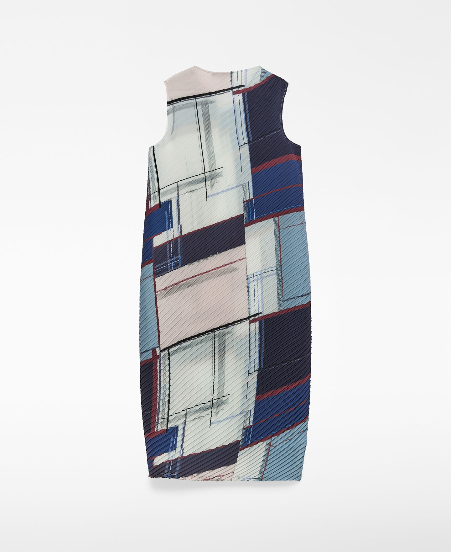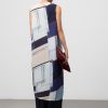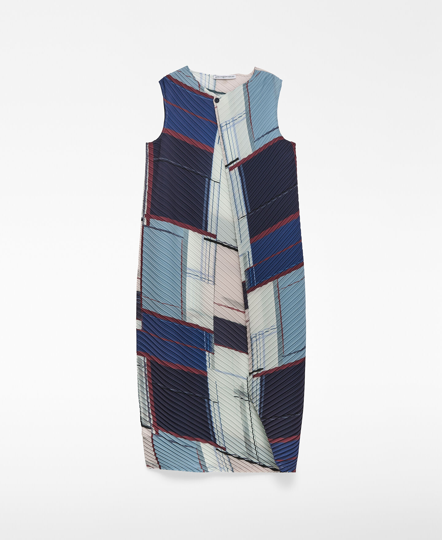 Vestido crinkle estampado poliéster reciclado mujer. Silueta redondeada. Cuello caja. Manga sisa. Delantero cruzado con cierre botón. Largo midi.